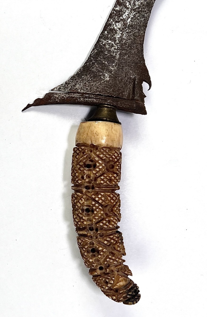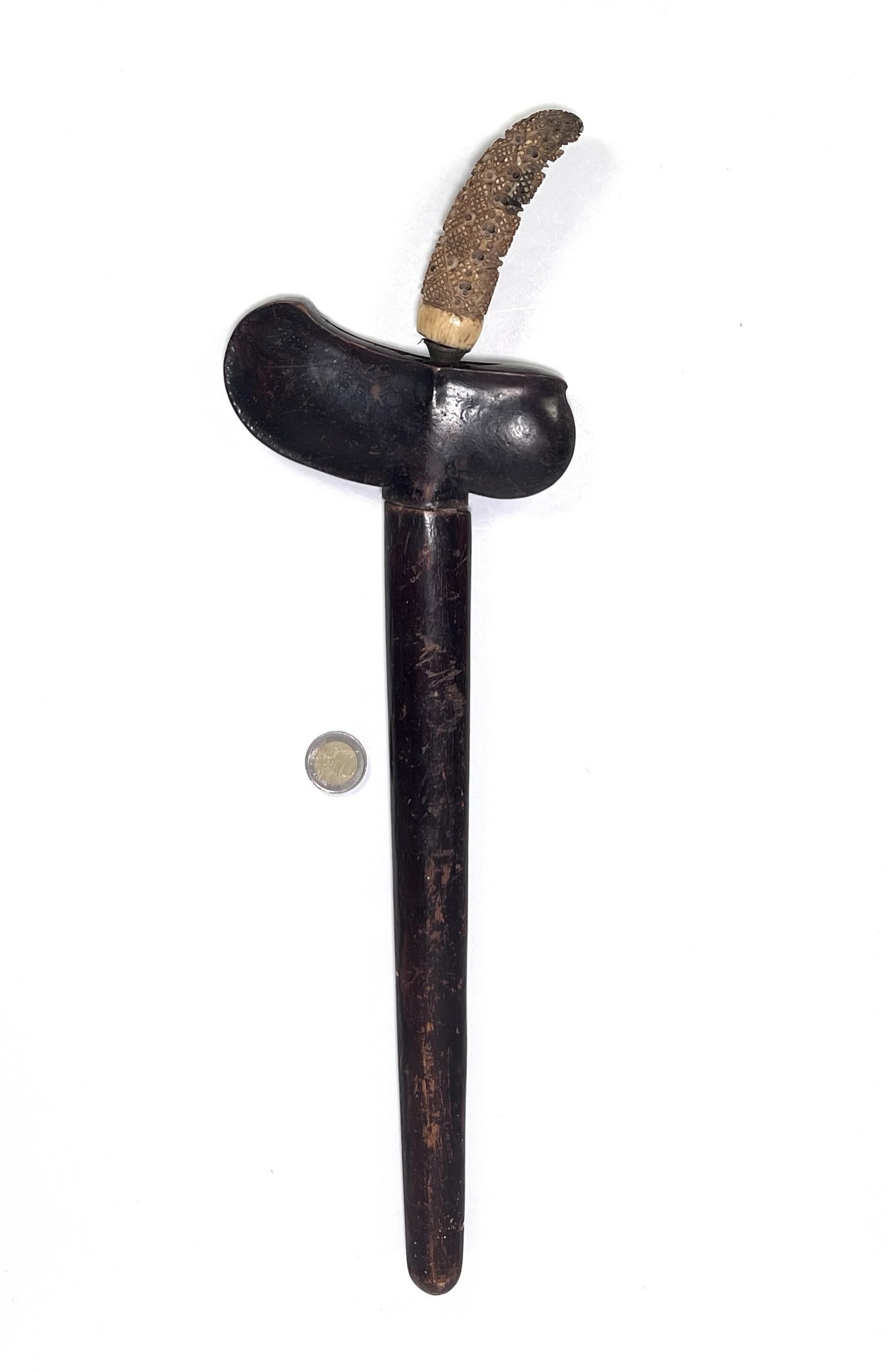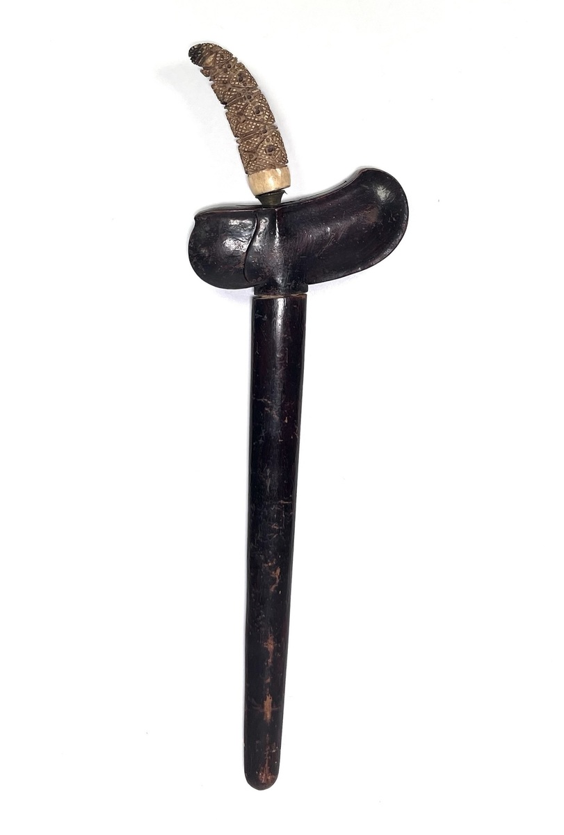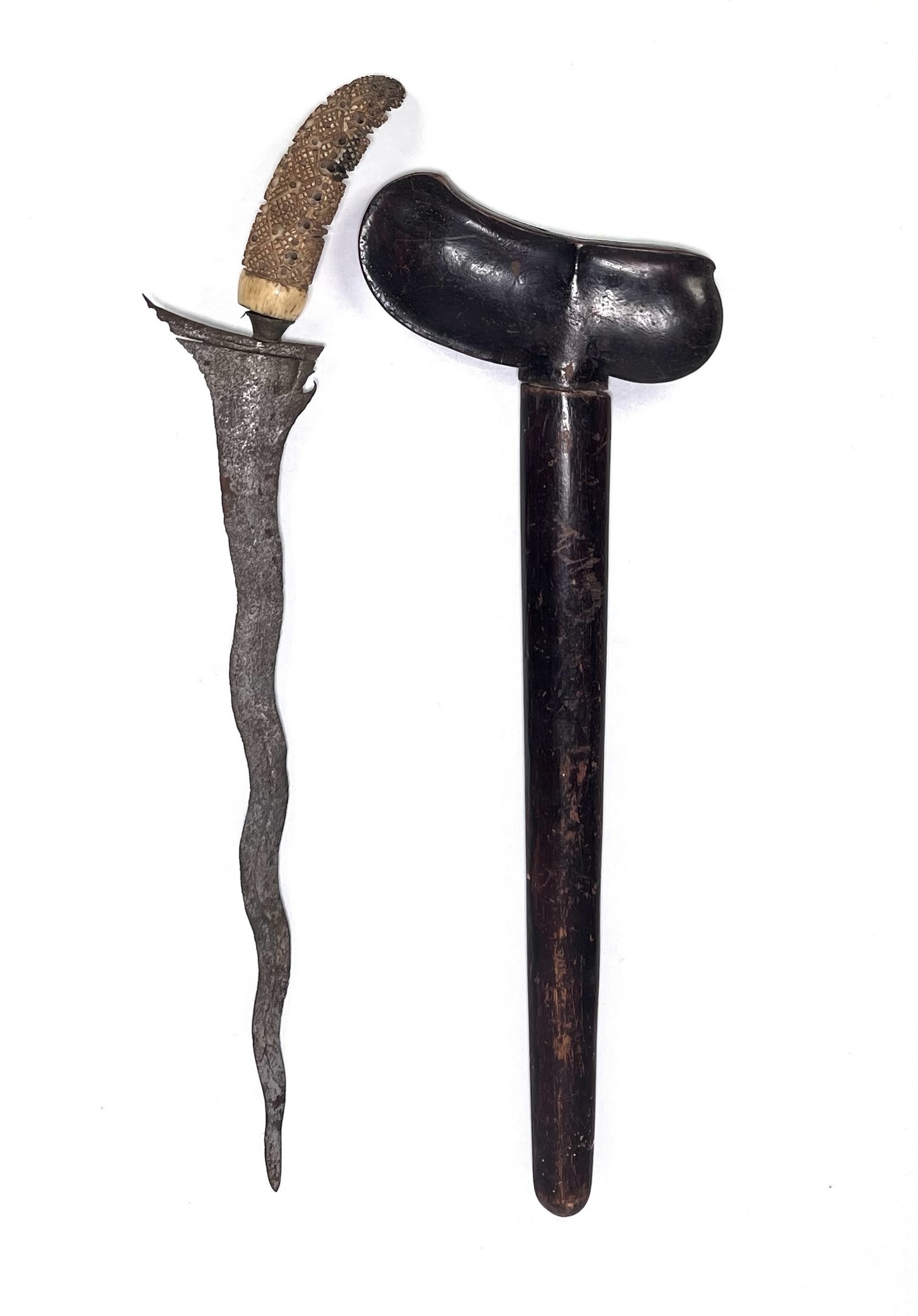 Kris met golvend lemmet, vermoedelijk Java, eerste helft 20e eeuw. Het lemmet is vervaardigd van pamorstaal en vertoont de karakteristieke pamormotieven. De benen greep (jangellan) is rijk bewerkt, de schede bestaat uit donker hout en heeft een brede wrangka. Klaar om te bieden? Registreer je nu en doe mee aan de veiling! |