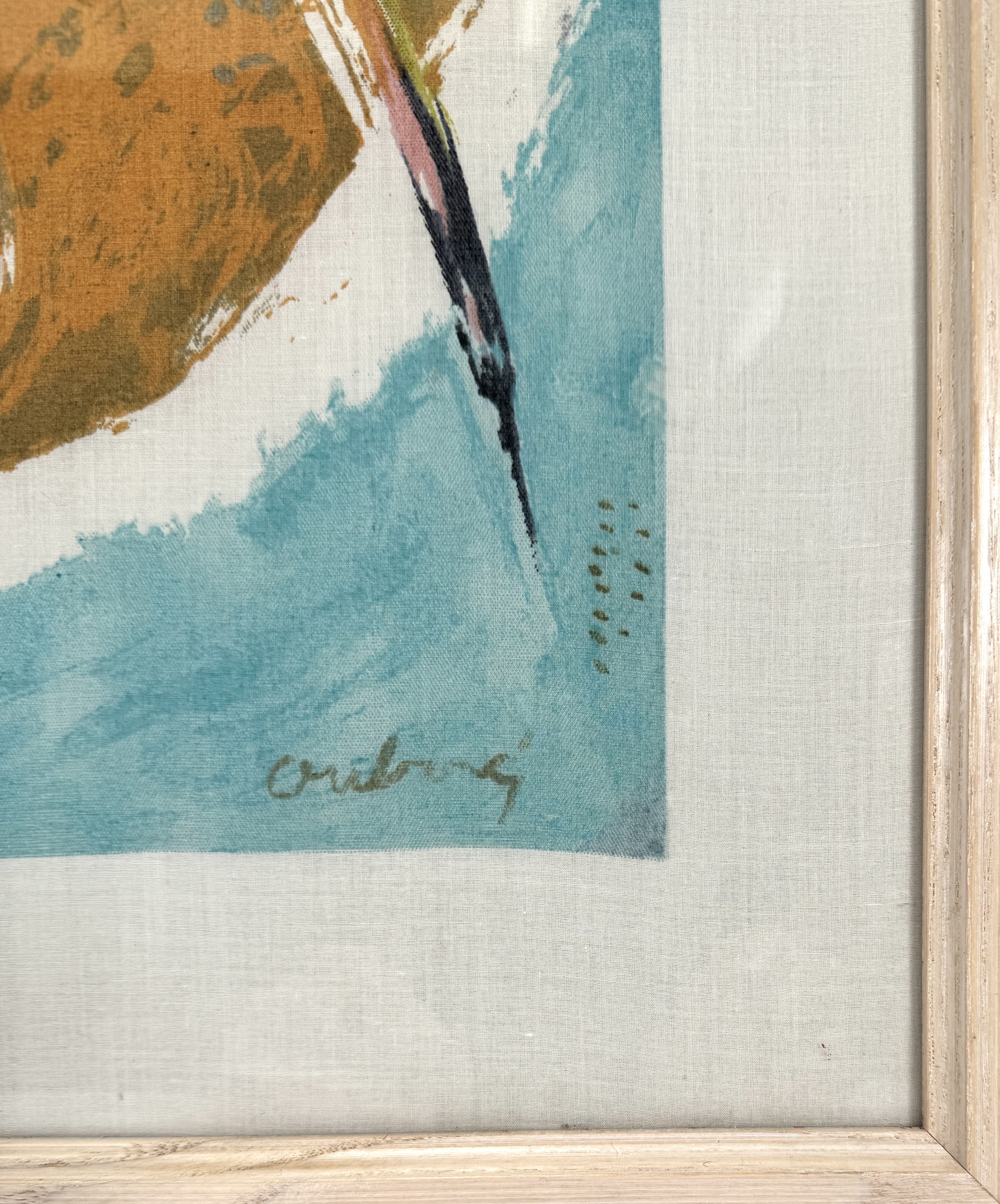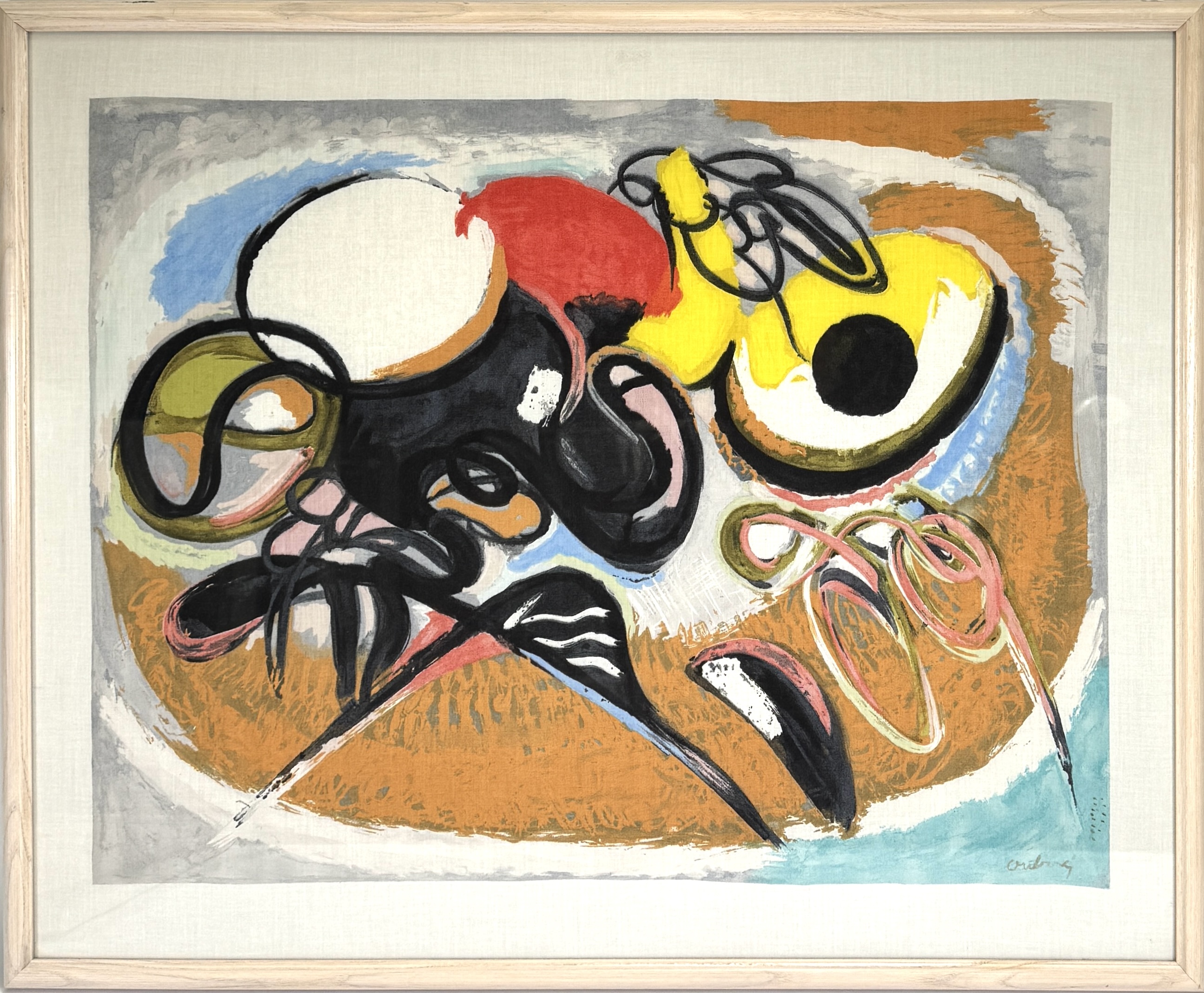 Zijde afdruk op katoen van Piet Ouborg (1893-1956). Oplage circa 200, afkomstig uit de jaarlijkse serie sjaals (relatiegeschenken van Gamma Holding in 1992), uitgevoerd door Texoprint B.V, datering 1991/1992. De voorstelling toont een abstracte compositie met dynamische lijnen en krachtige kleurvlakken in geel, rood, zwart en blauw. De afbeelding is gespannen en ingelijst in een houten lijst. Met gesigneerde afdruk rechtsonder. Bezoek de kijkdagen en laat u overtuigen op 29, 30 en 31 augustus! |