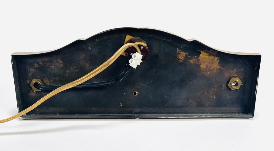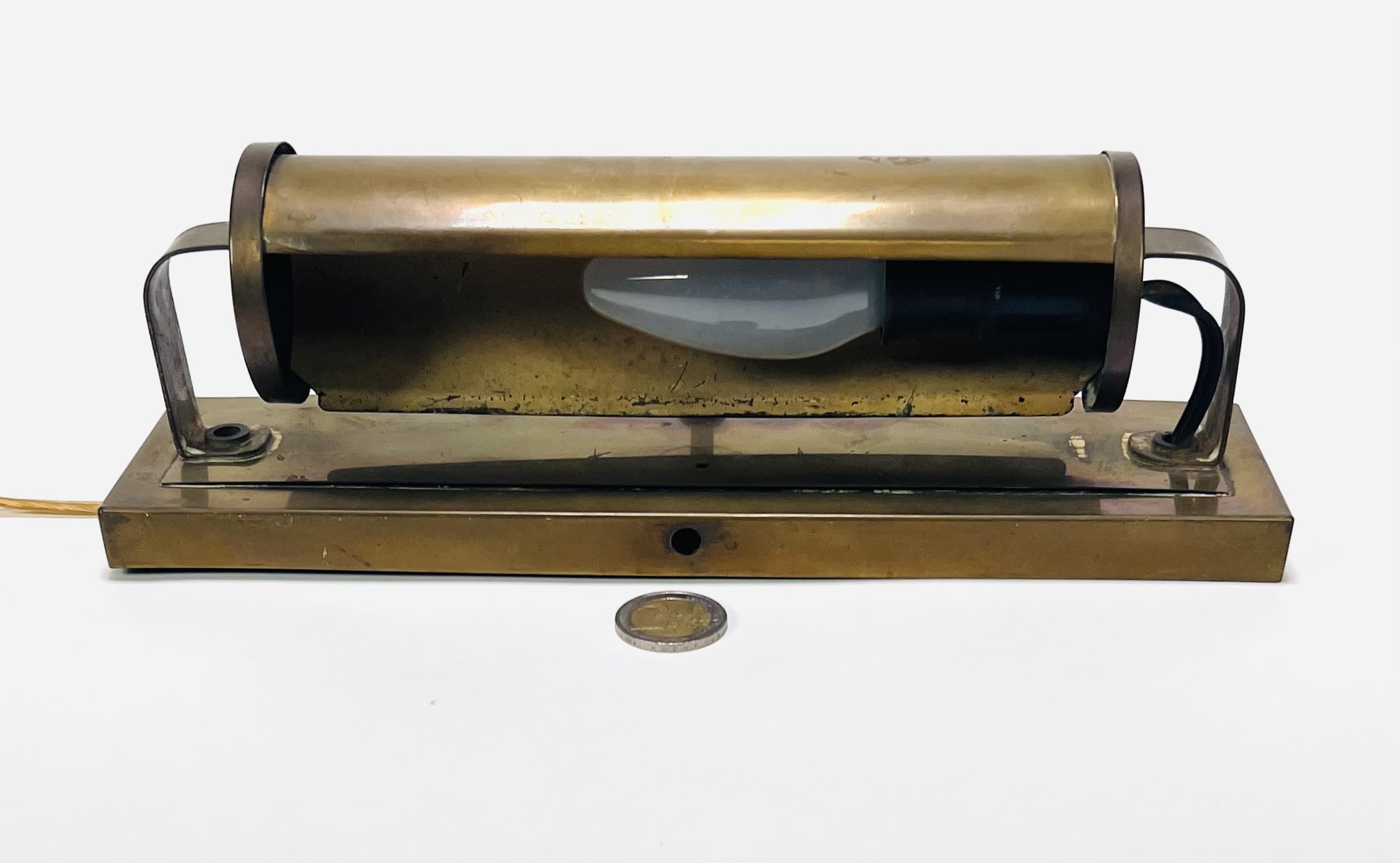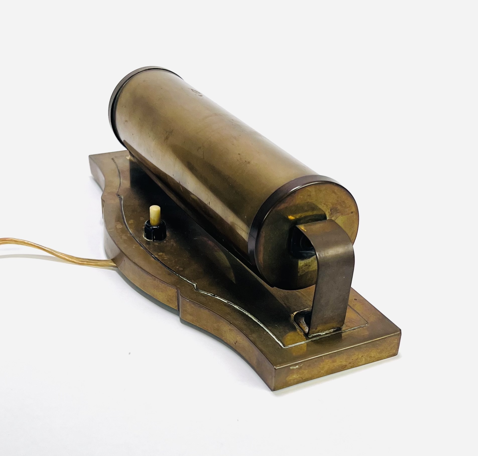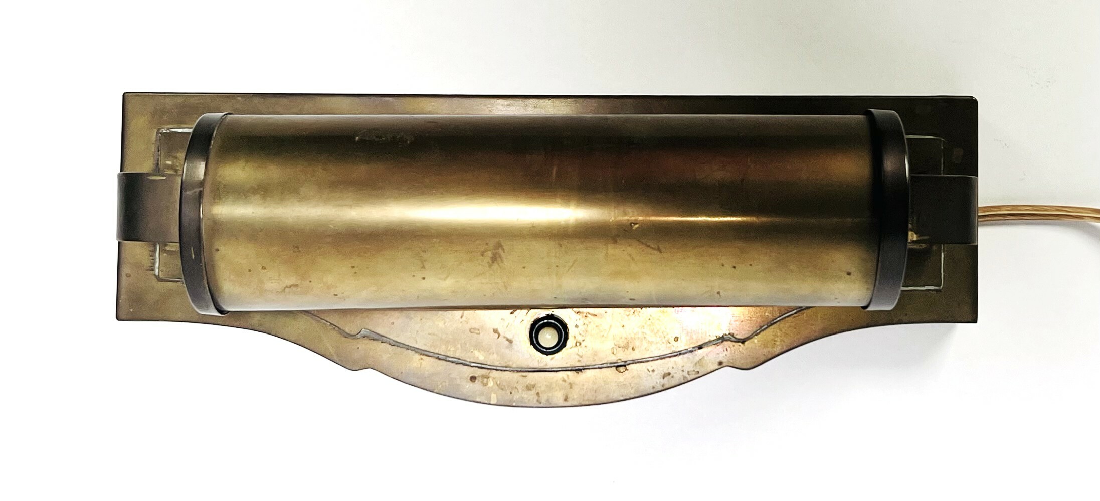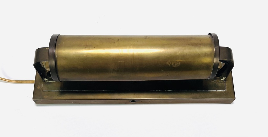 Messing wandlamp in functionele stijl, midden 20e eeuw. De cilindrische lampenkap is draaibaar bevestigd op een rechthoekige achterplaat met afgerond bovenprofiel. Gemaakt van messing met onderdelen in bakeliet en kunststof bij de bedrading. Industrieel vervaardigd met zichtbare verbindingselementen. Wilt u meedoen aan de veiling? Registreer en bied live of online! |
