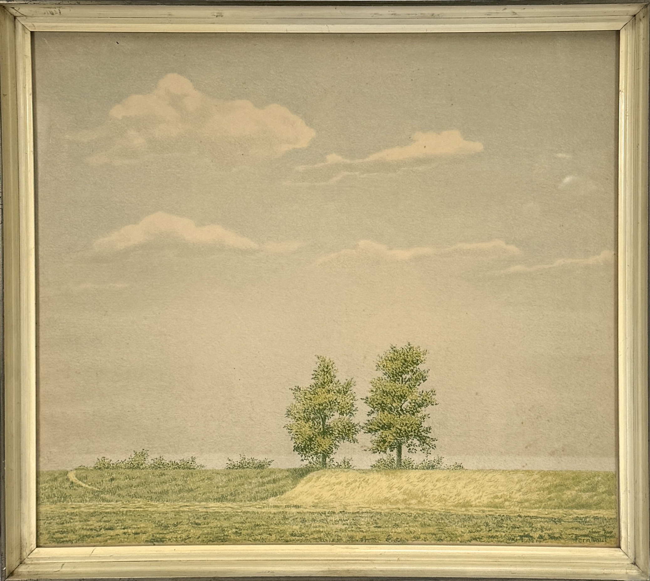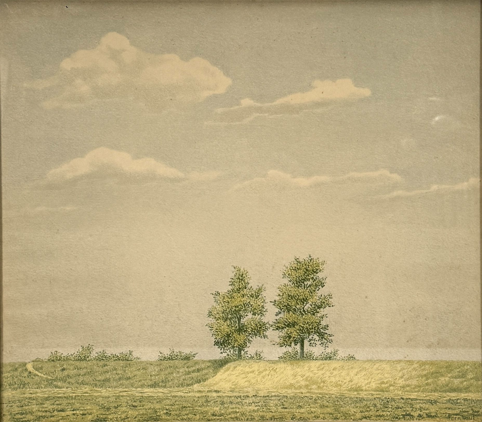 Litho van Edgar Fernhout (1912-1974), midden 20e eeuw, gedrukt op papier. De voorstelling toont een open polderlandschap met twee solitaire bomen onder een lucht met verspreide wolken. De heldere opbouw en strakke compositie kenmerken Fernhouts latere werk, waarin hij vaak abstraherende landschappen verbeeldde. Gesigneerd rechtsonder. Kom langs tijdens de kijkdagen (29 t/m 31 augustus) en ontdek dit object zelf! |