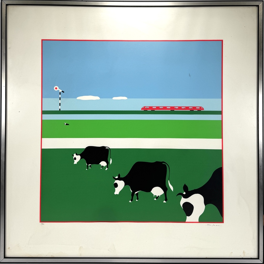 Zeefdruk Han Jansen, koeien en trein, jaren ’70
