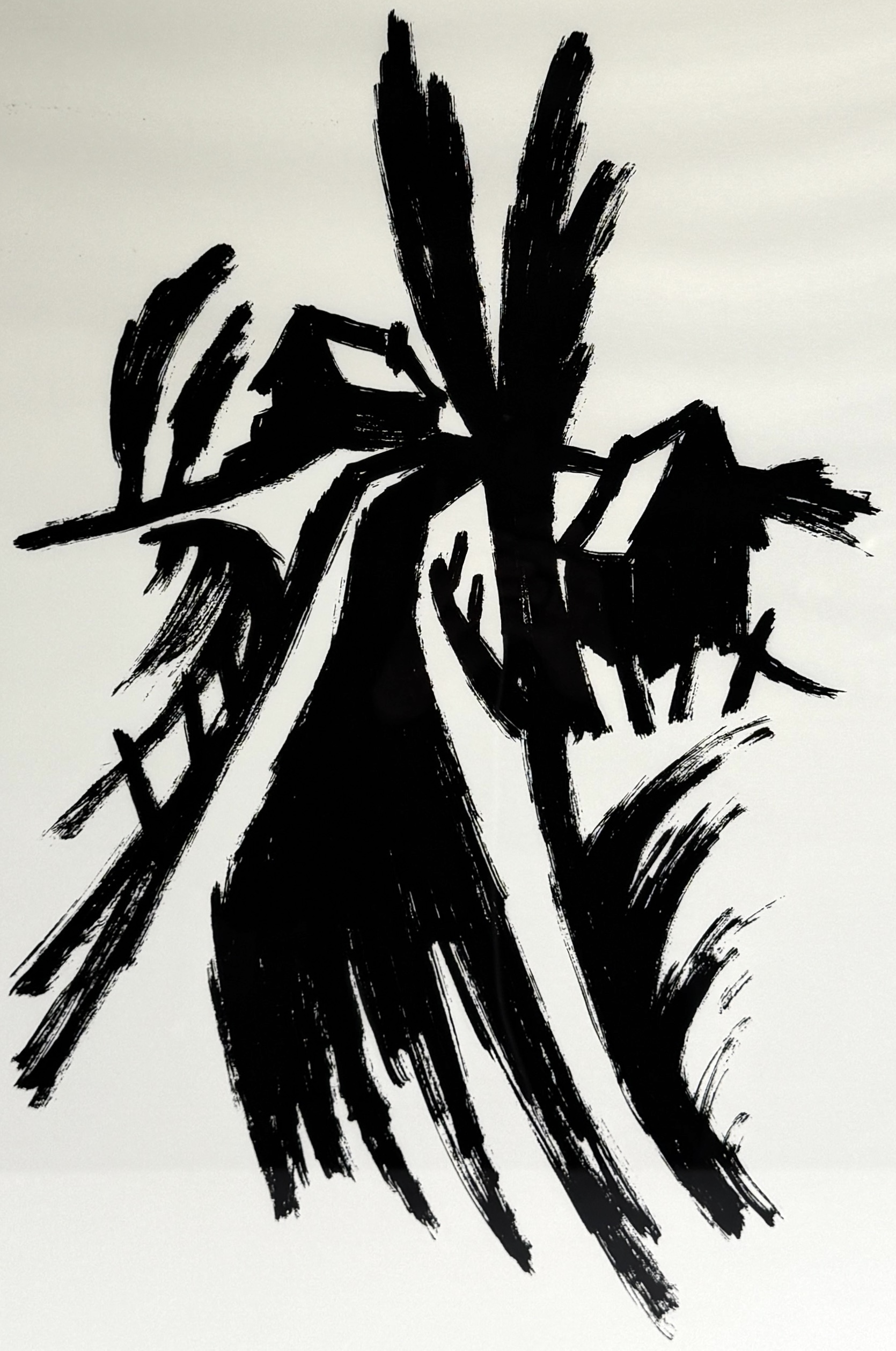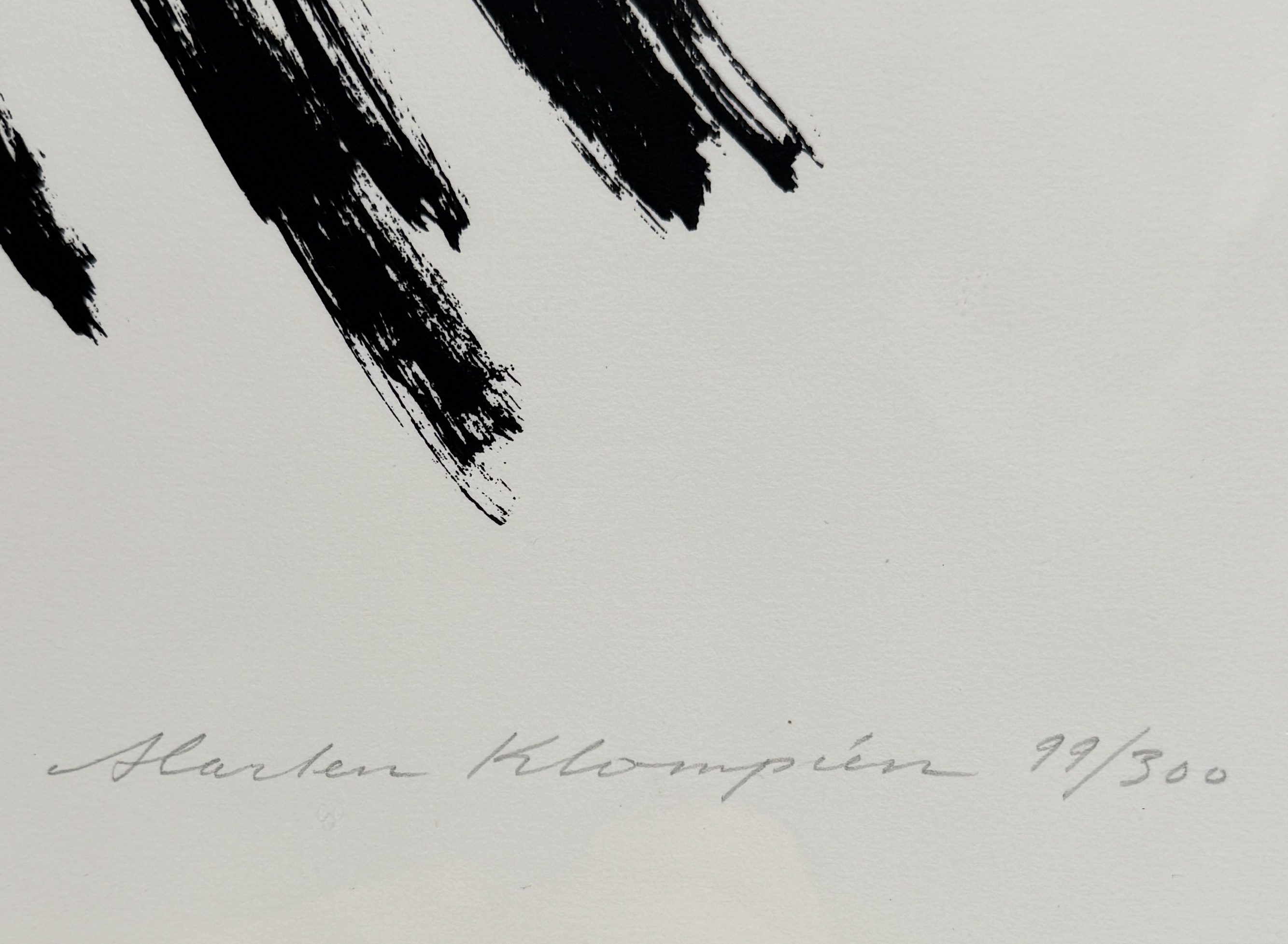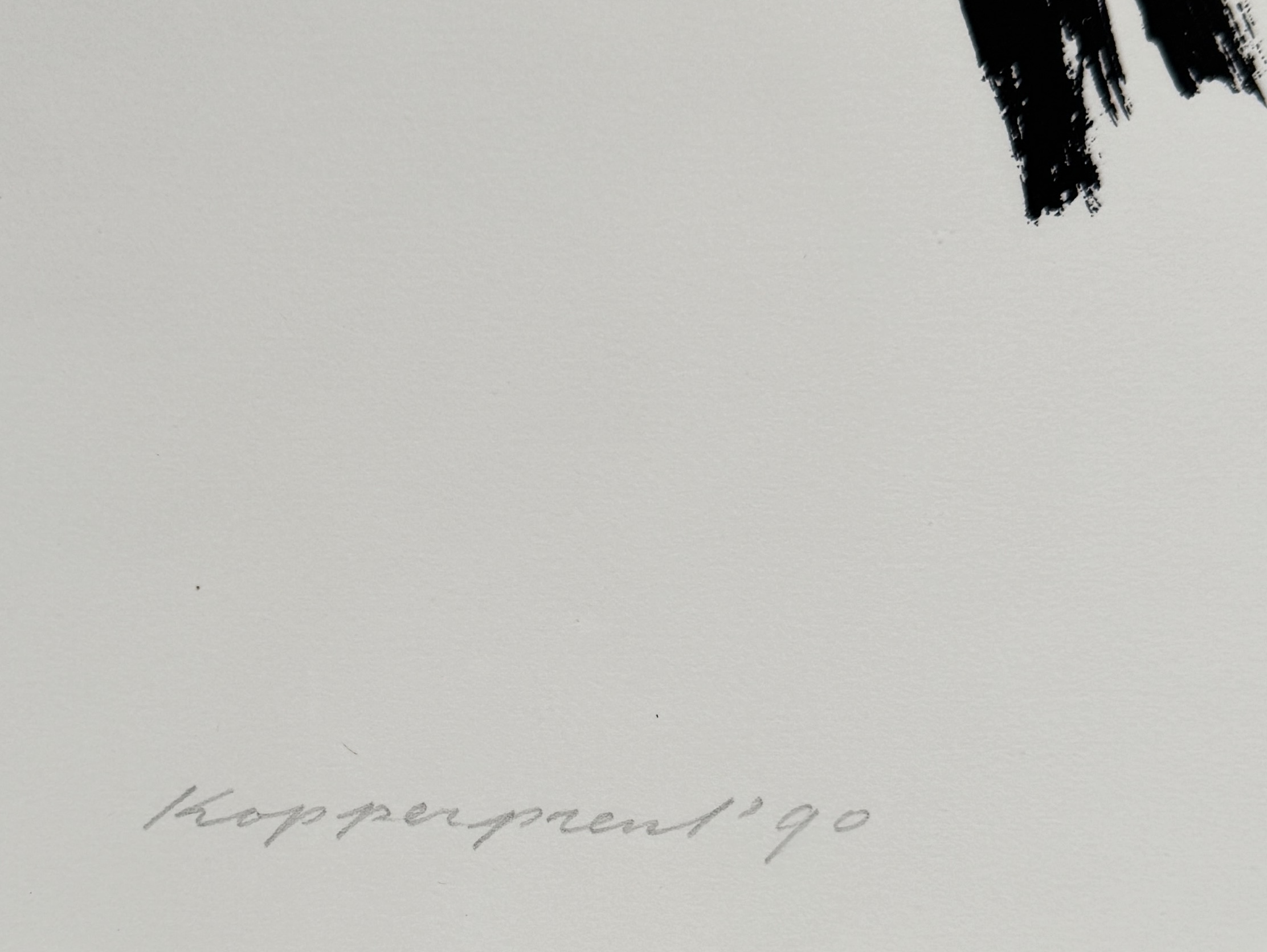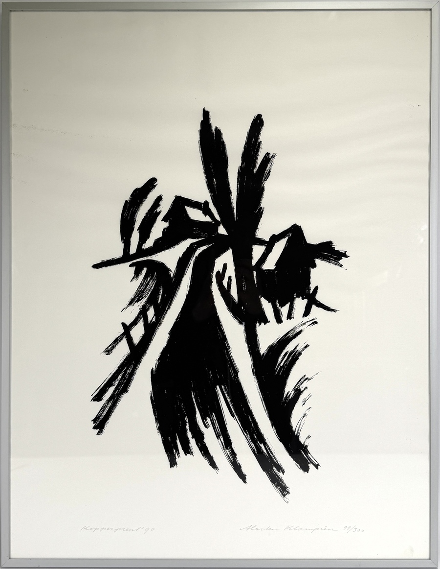 Koppermaandagprent van Klompien (1917–1996), datering 1990. Abstract-expressionistische stijl met krachtige zwarte vlakken die een dynamische compositie vormen, refererend aan een landschap met huizen en bomen. Linksonder met potlood vermelding en gedateerd Kopperprent ’90, rechtsonder met potlood gesigneerd en oplagenummer 99/300. Bied eenvoudig mee, live of online. Registreer nu. |