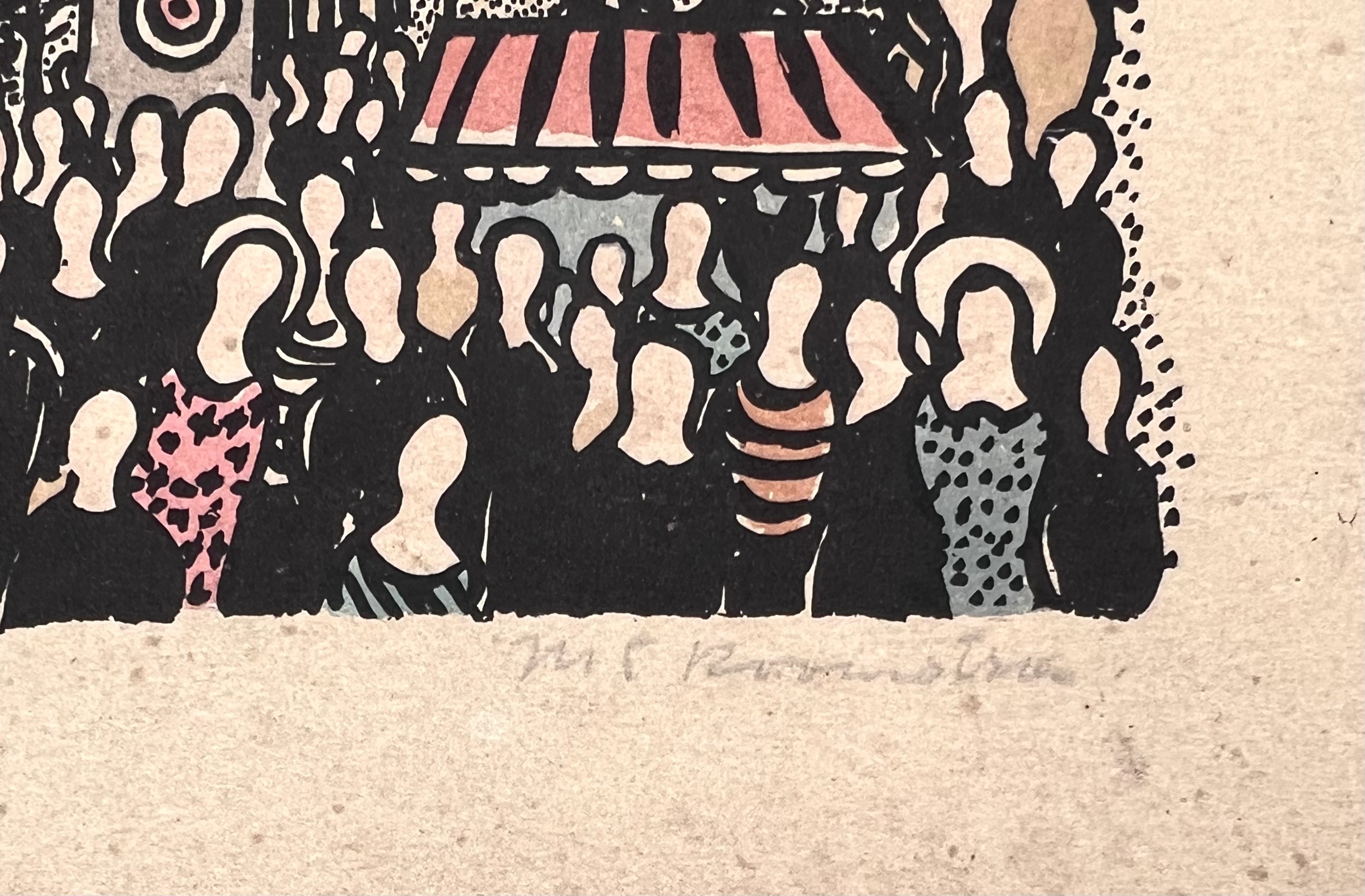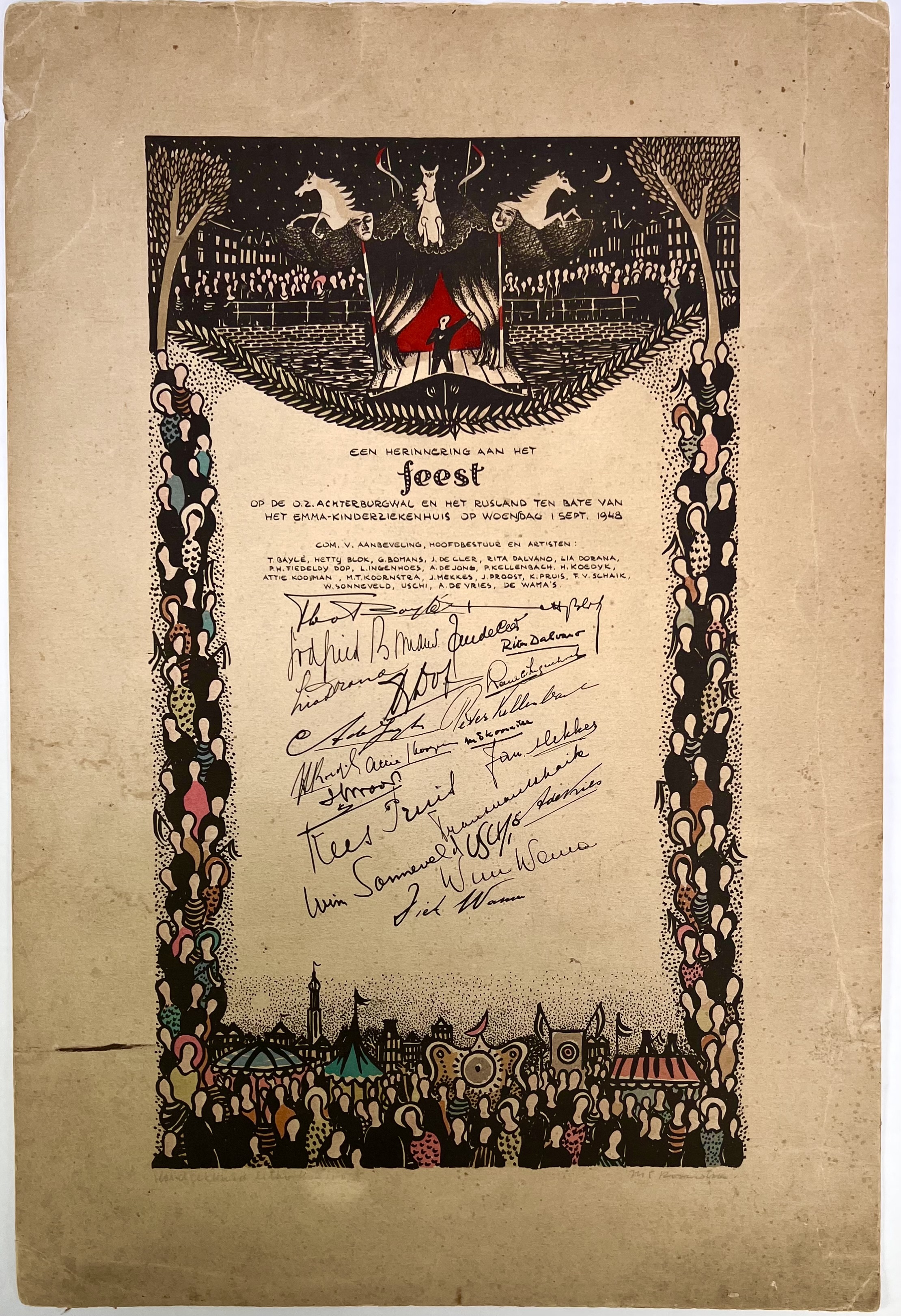 Kleurhoutsnede van Metten Koornstra (1912–1978), Nederland, 1948, papier en inkt, ontworpen als herinnering aan een benefietfeest voor het Emma-Kinderziekenhuis in Amsterdam. De prent toont een circusachtige voorstelling en is gesigneerd in potlood, met diverse handtekeningen van betrokken artiesten. Geïnteresseerd? Bezoek onze kijkdagen voor een persoonlijke bezichtiging! |