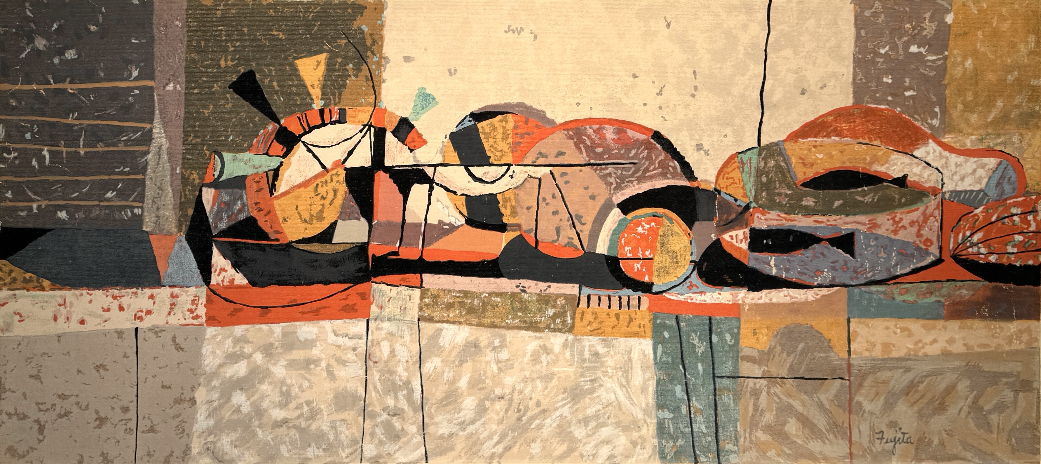 Een kleurenlitho van Sadamitsu Neil Fujita (1921–2010), uitgevoerd op papier en ingelijst in een houten lijst. De stijl is abstract figuratief met een gestileerde voorstelling van objecten en vissen in geometrische vormen. Het werk kenmerkt zich door contrasterende kleuren en texturen en is gesigneerd door de kunstenaar met Fujita. Ongedateerd, gemaakt in de periode 1959-1967. Kom langs tijdens de kijkdagen (29 t/m 31 augustus) en ontdek dit litho zelf! |