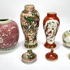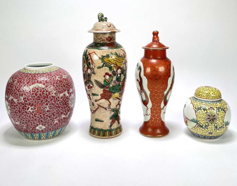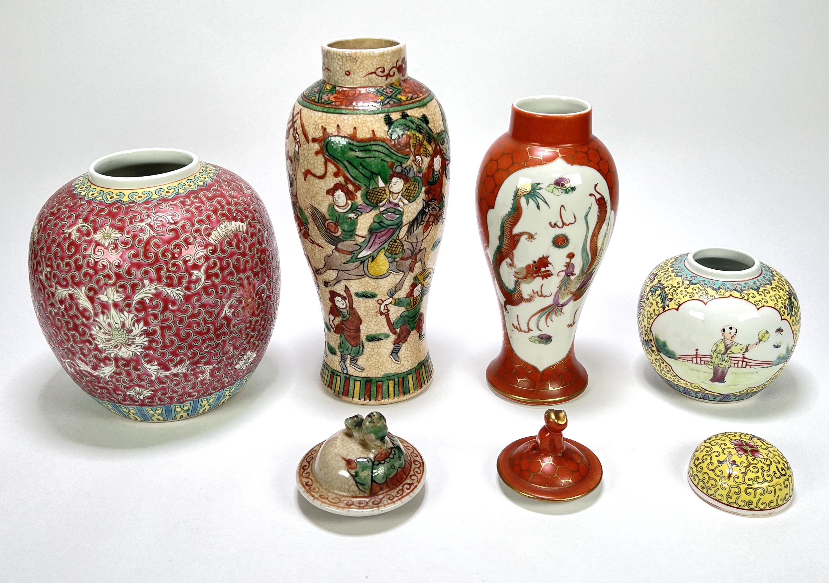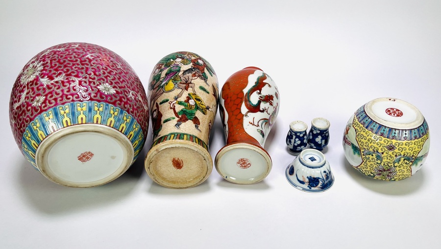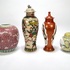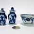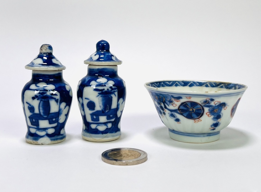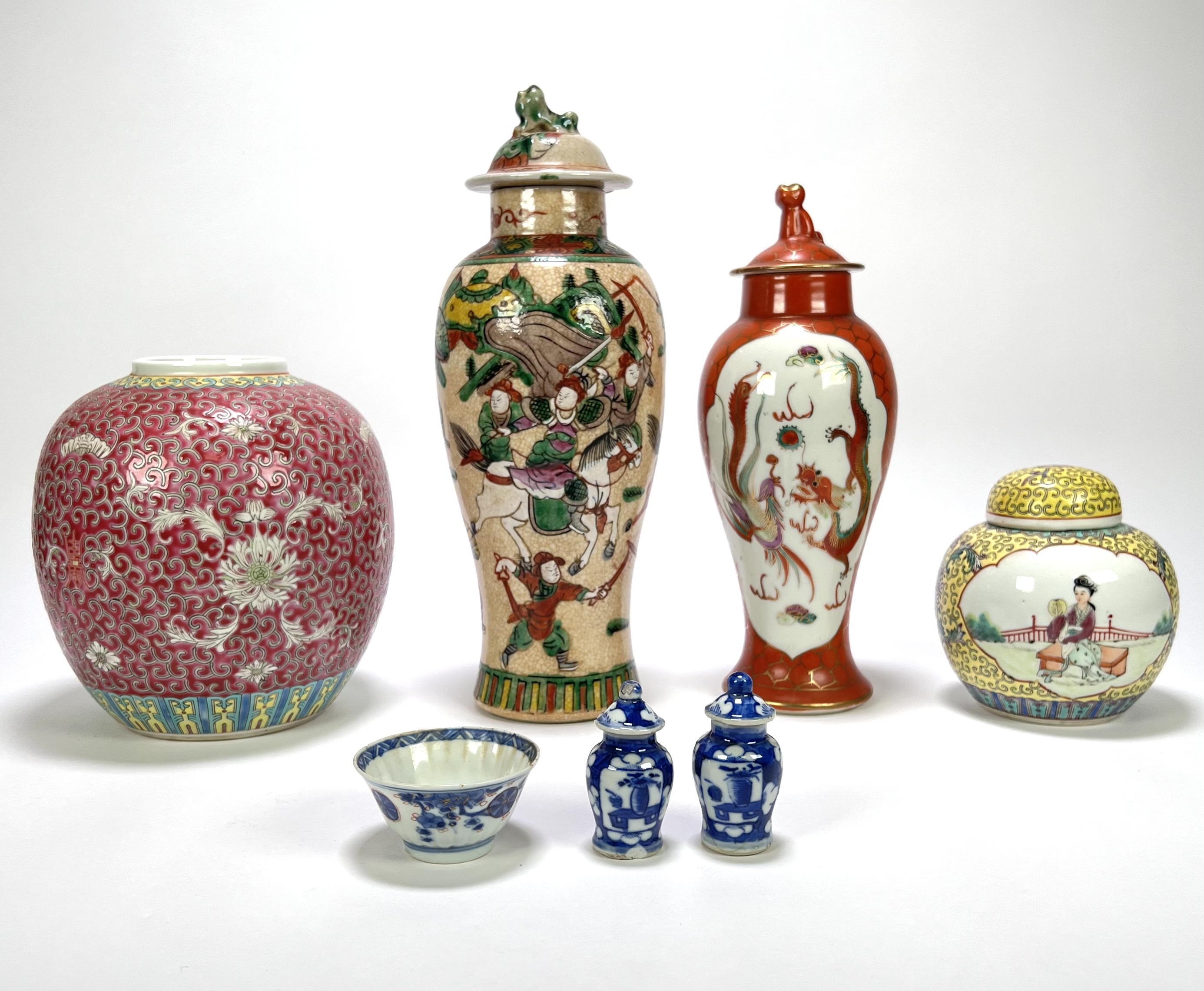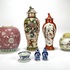 Convoluut Chinees porseleinen objecten bestaande twee gemberpotten, twee grotere dekselvazen met figuratieve decoratie, twee blauw-witte miniatuur dekselvaasjes en een klein blauw-wit kommetje. Datering circa 1750–1980. |