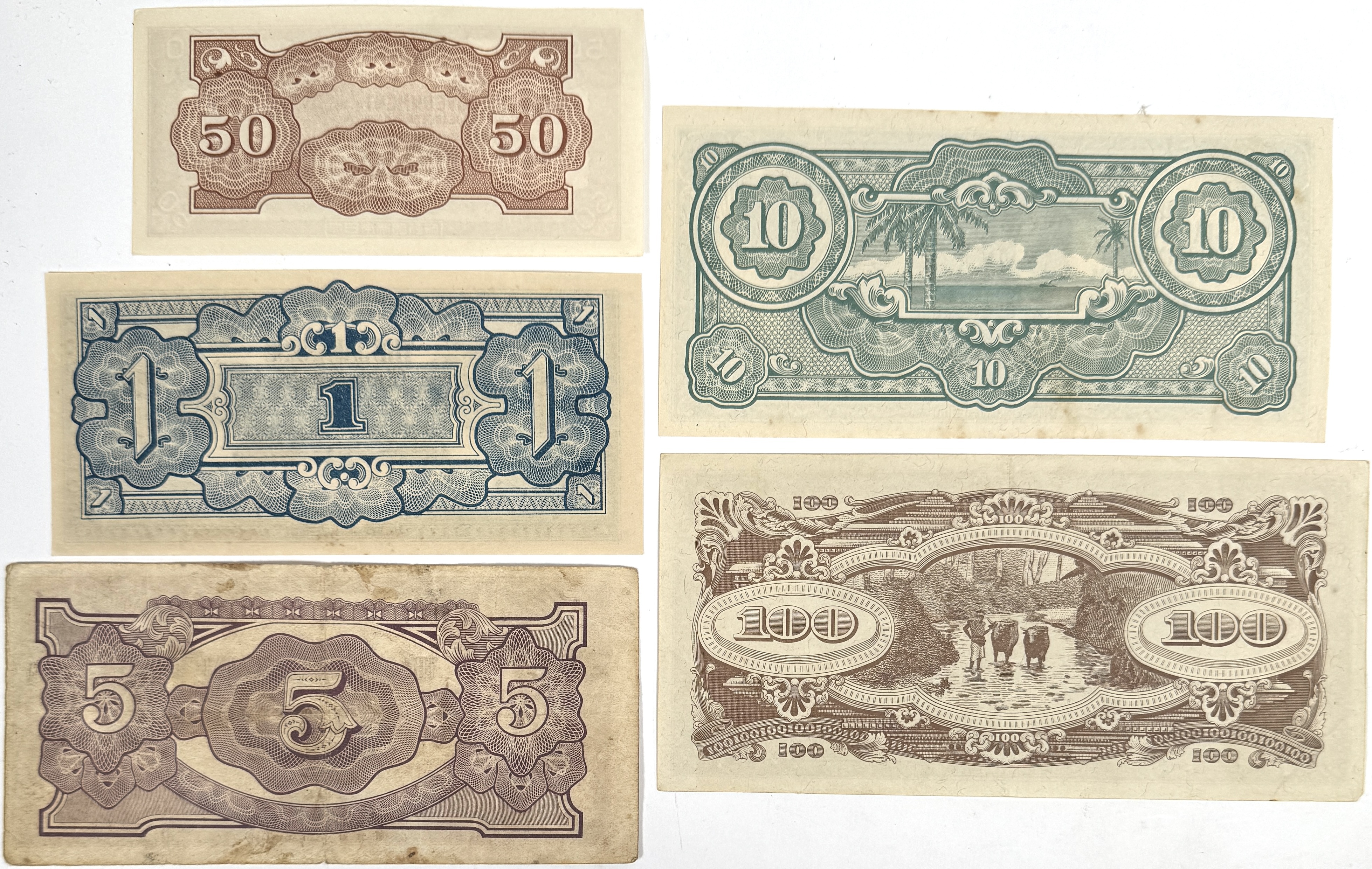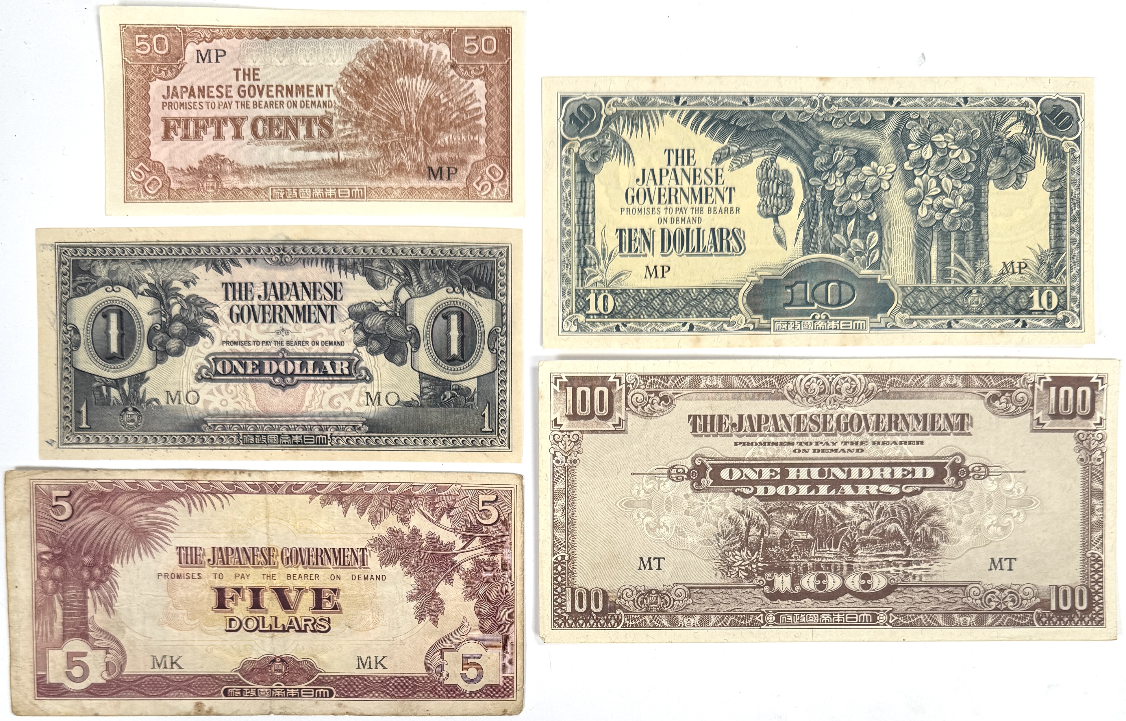 Vijf bankbiljetten ‘Japanese Invasion Money’, uitgegeven door The Japanese Government voor Brits Malaya, 1942–1945. Denominaties: 50 cents (MP), 1 dollar (MO), 5 dollars (MK), 10 dollars (MP) en 100 dollars (MT). Bedrukt bankpapier, meerkleurige lithografische druk met guilloches, tropische vignetten en Engelse opdruk. Voor- en achterzijde afgebeeld; zonder serienummers, zoals bij deze uitgiften gebruikelijk. Historisch contextmateriaal uit de Tweede Wereldoorlog. Wil je direct deelnemen? Plaats vanaf 22 augustus alvast een schriftelijk bod via onze website! |