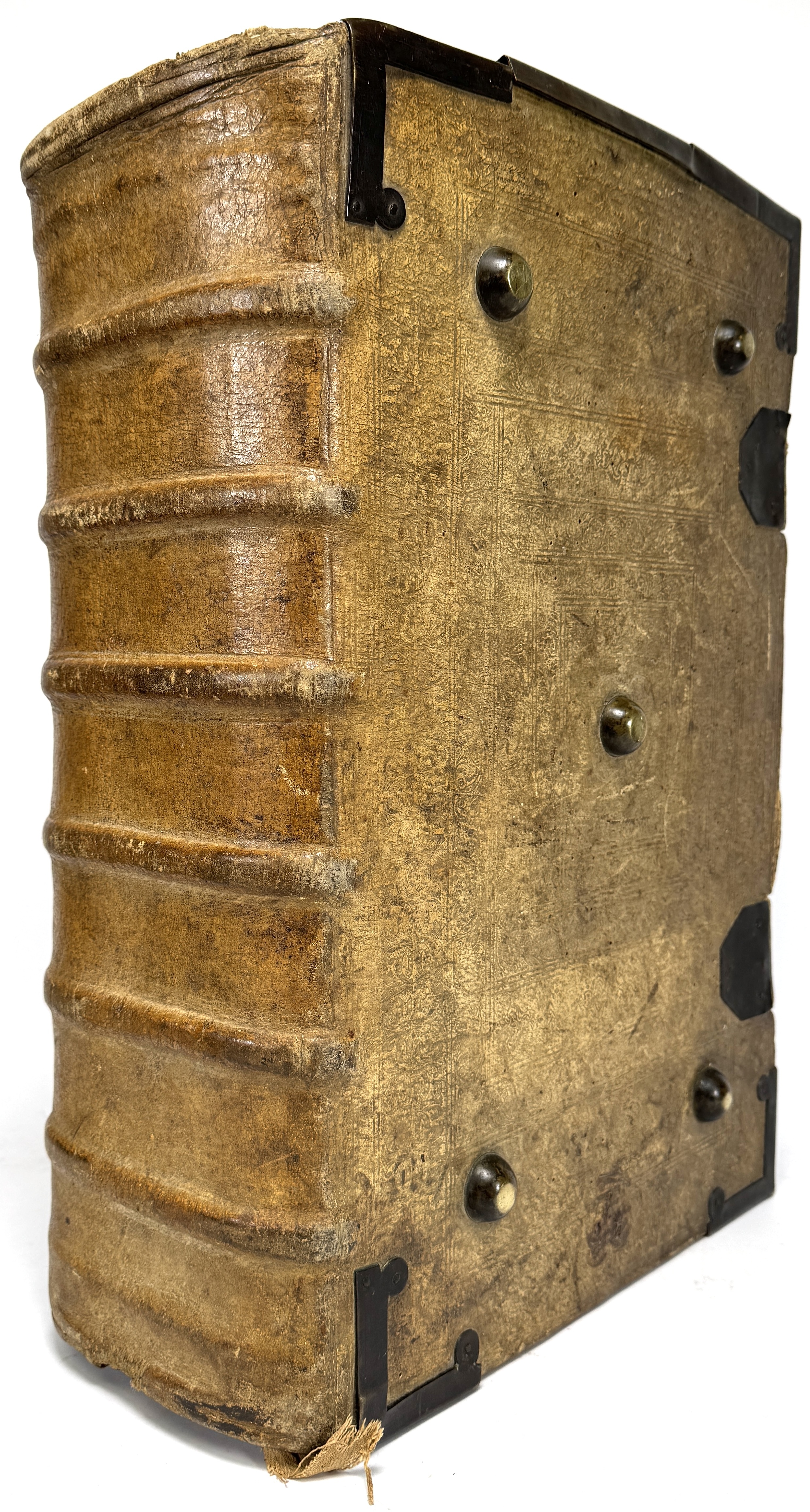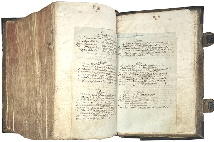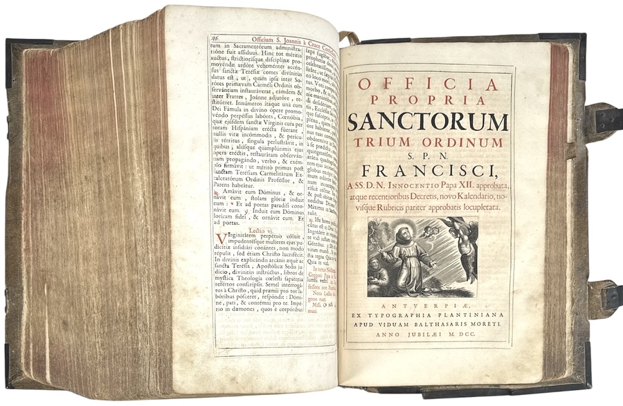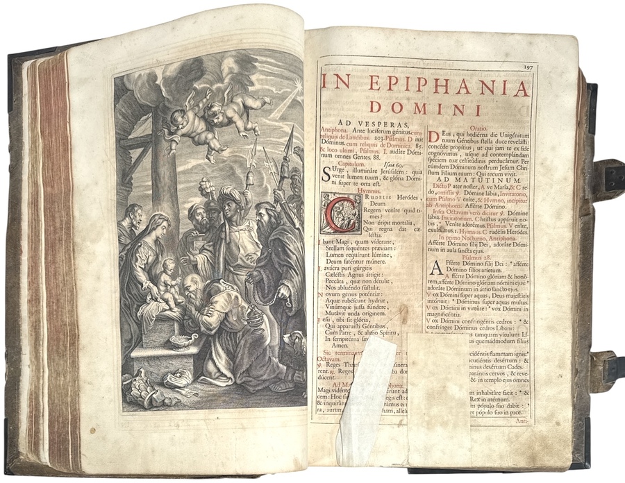 Perkamenten folio-uitgave "Breviarium Romanum", ex decreto Sacrosancti Concilii Tridentini restitutum, Plantijnse drukkerij Antwerpen, 1697. Dit traditionele gebedsboek van The Divine Office is uitgevoerd in barokstijl met druk in rood en zwart, kopergravures, geïllustreerde initialen en een tweede titelpagina voor Officia Propria Sanctorum. Het betreft een zogenoemde bossed vellum binding, met blindstempeling, metalen hoekstukken, beschermknoppen en twee sloten. Ingebonden zijn een manuscript titelpagina en index, aangevuld met handgeschreven notities in het Latijn die wijzen op historisch gebruik. Wil je direct deelnemen? Plaats vanaf 22 augustus alvast een schriftelijk bod via onze website! |