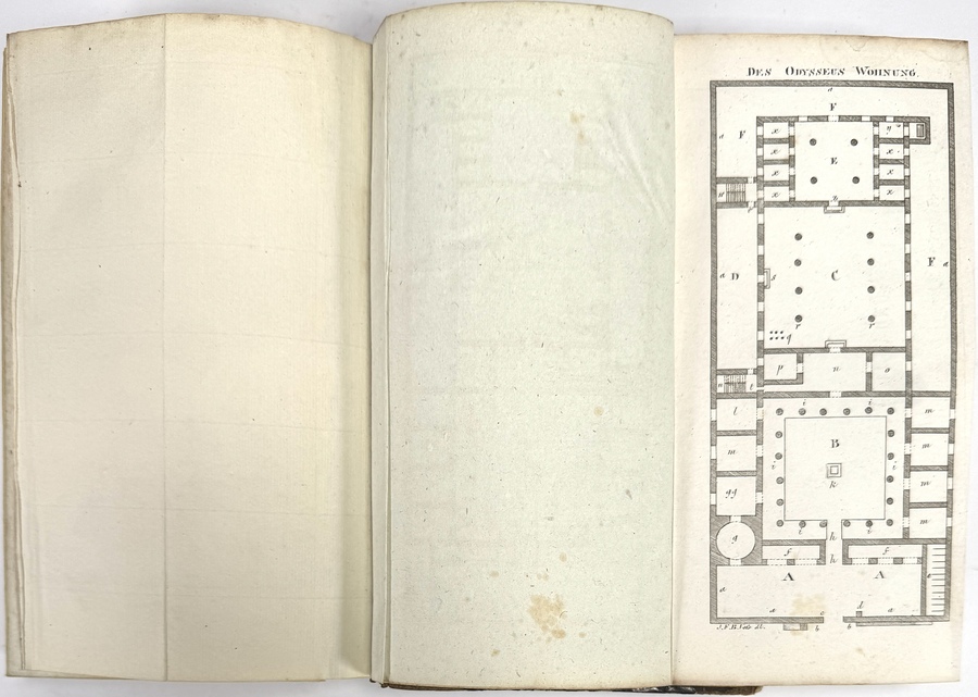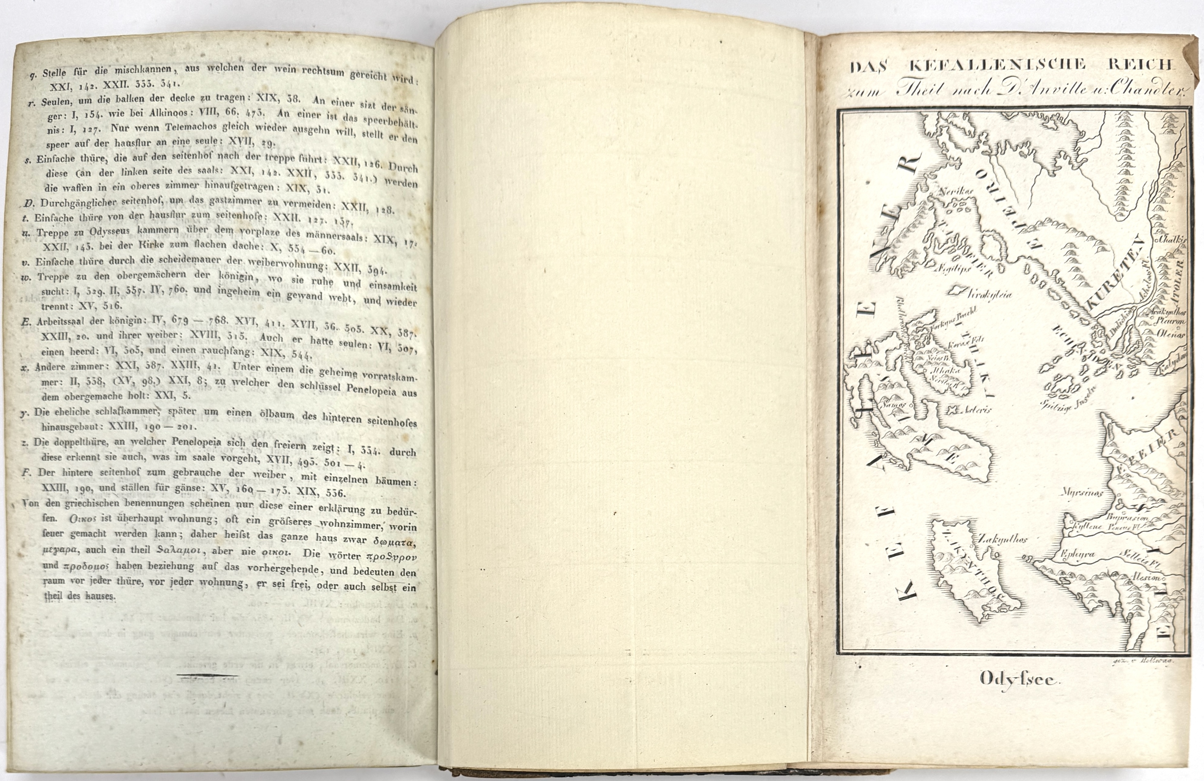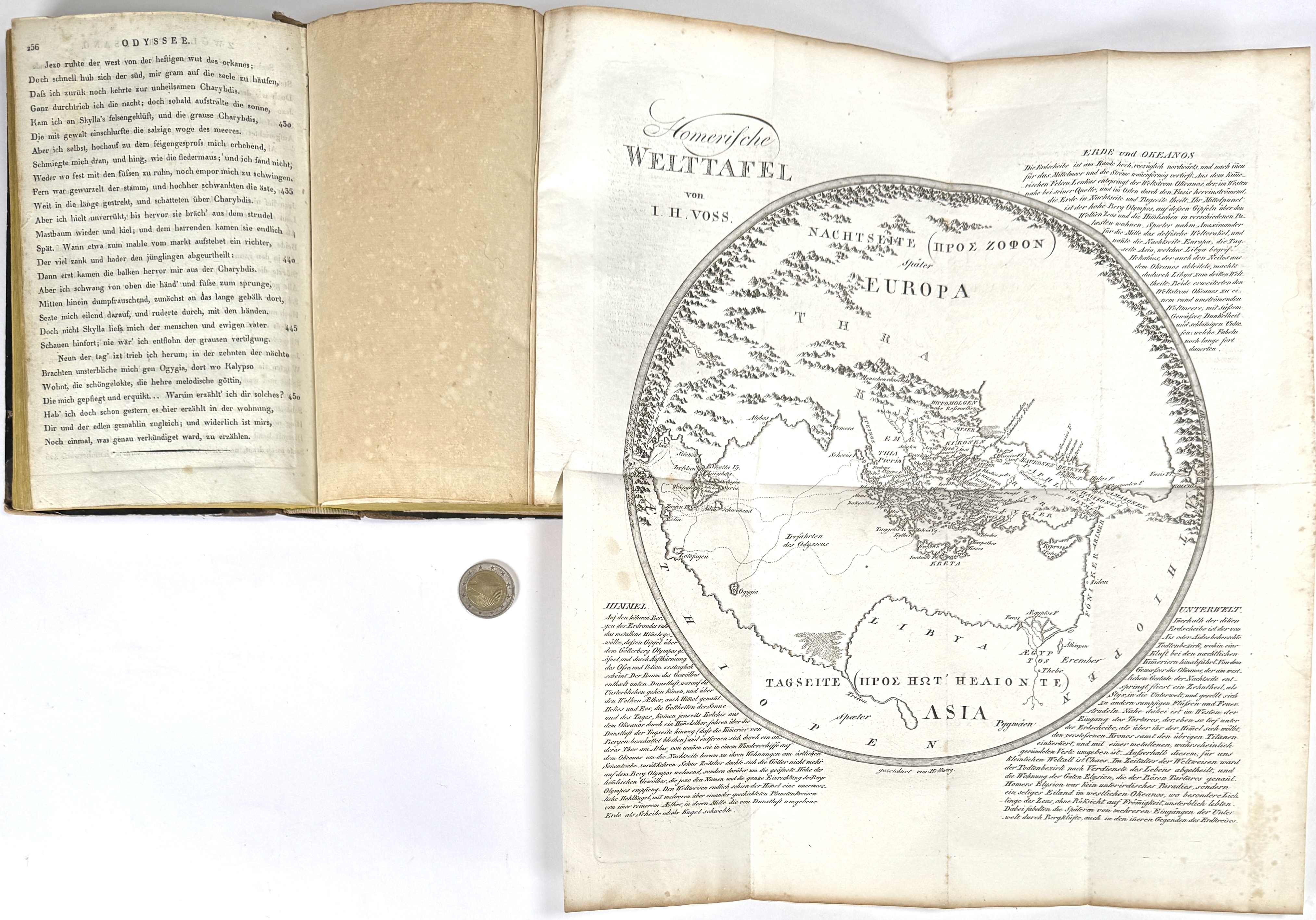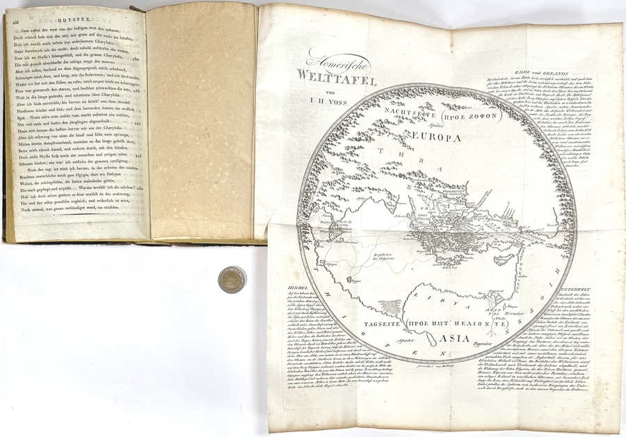 Boek Homerus Odyssee" van Johann Heinrich Voss (1751–1826). Uitgeverij Stuttgart und Tübingen. Vijfde sterk verbeterde editie uit 1821, uitgevoerd in halfleren banden gele snede. Bevat uitvouwbare kopergravures, waaronder een wereldkaart en plattegronden van het Odyssee-rijk. Kenmerkend voor academische filologische werken, bedoeld voor detailstudie van klassieke teksten en reisroutes van Odysseus. Geïnteresseerd? Bezoek onze kijkdagen op 29, 30 of 31 augustus van 11:00 tot 17:00 uur! |