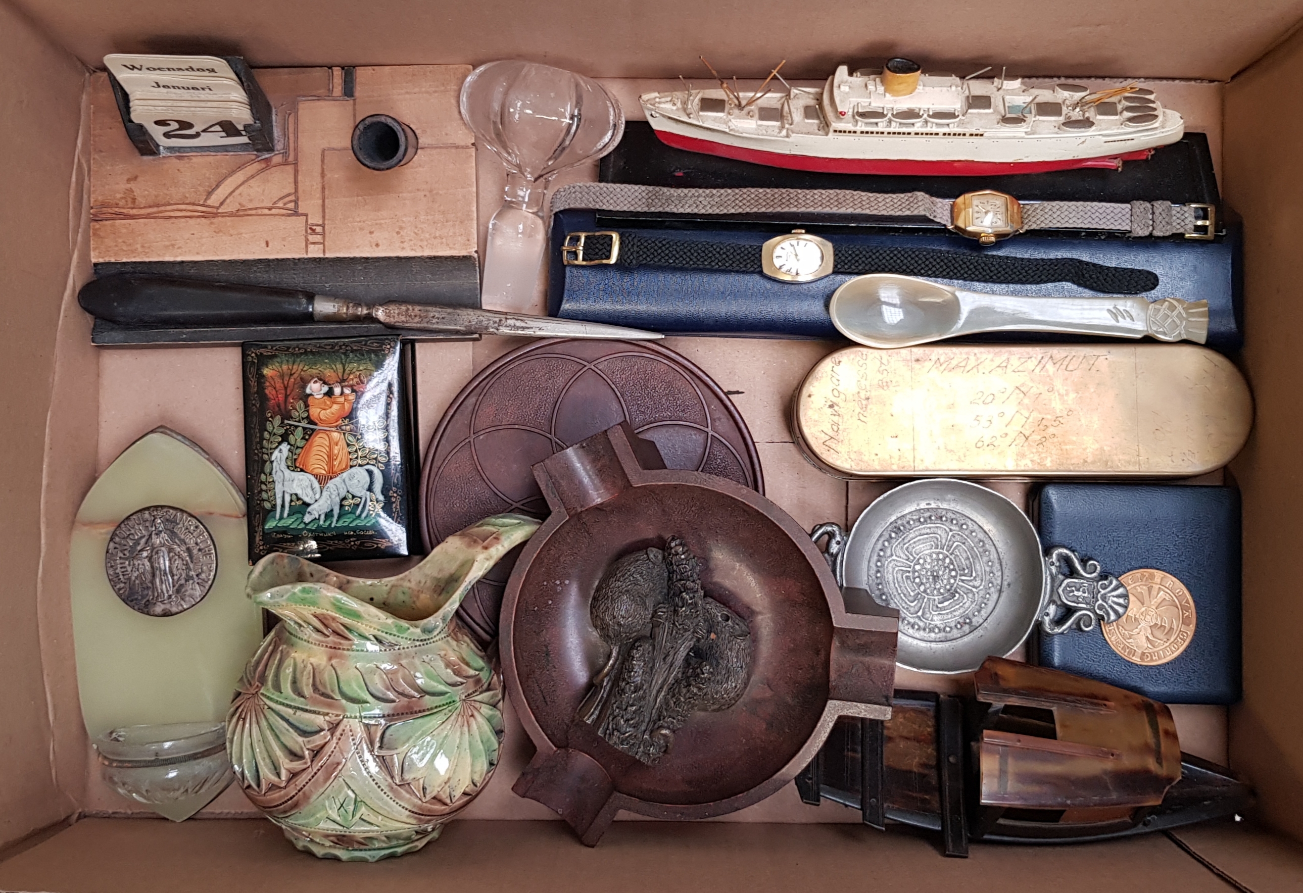 Lot curiosa samengesteld uit diverse objecten in metaal, keramiek, glas, kunststof en hout. Bestaande uit nautische schaalmodellen, religieuze plaquette, Russisch lakkistje, asbak met vogelmotief, keramische kan, penningen, horloges, glazen zandloper en schrijfgerei. 20e eeuw. Klaar om te bieden? Meld u aan voor de veiling en doe mee! |