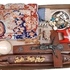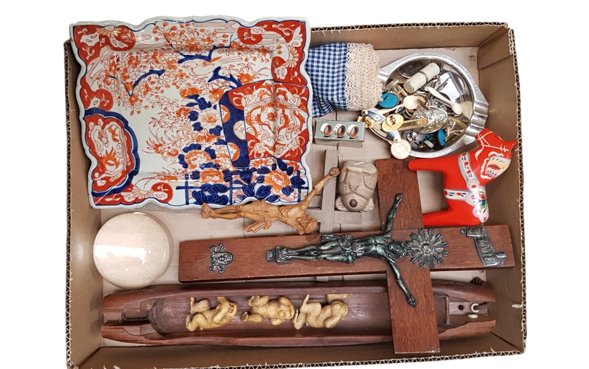 Lot curiosa, midden 20e eeuw, samengesteld uit decoratieve en religieuze objecten zoals een polychrome Imari schaal, houten en metalen kruisen met corpus Christus, rood beschilderd Dala-paardje, stenen bol, diverse kleine beeldjes in been en kunststof, metalen schaaltje met speldjes en knopen, en diverse accessoires. Eclectische stijl, uitgevoerd in hout, keramiek, metaal en textiel. |