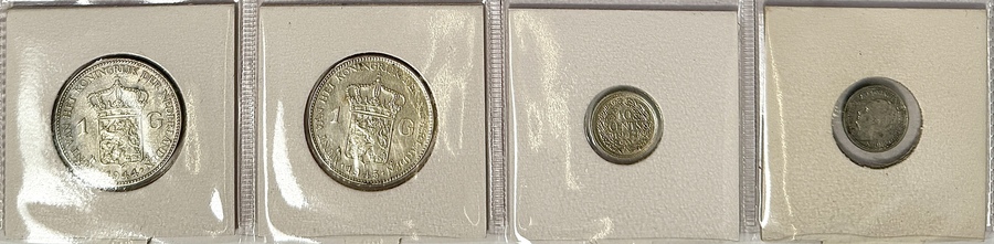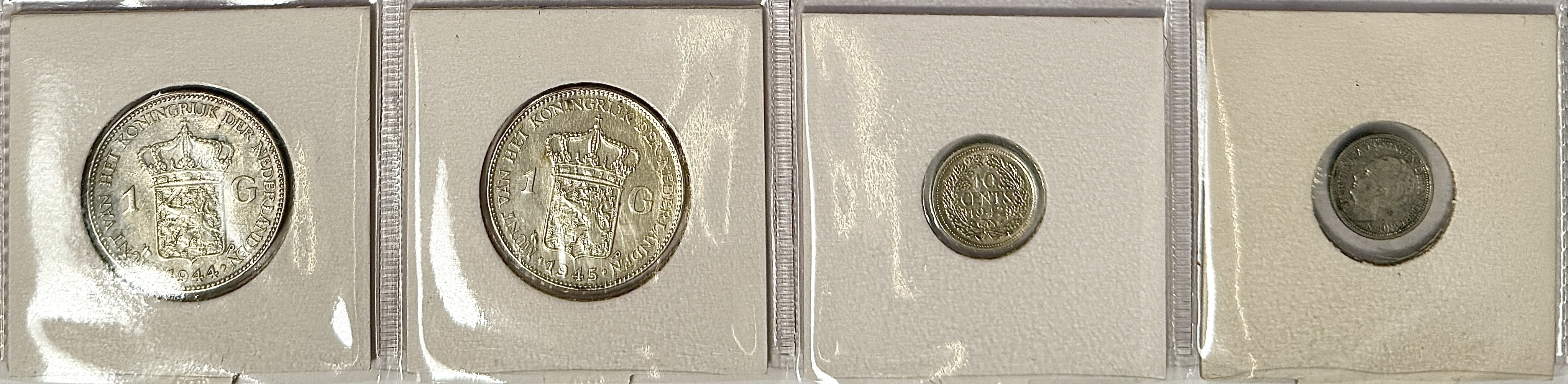 Vier Nederlandse munten uit de Tweede Wereldoorlog, geslagen onder koningin Wilhelmina (1880–1962): twee zilveren guldens van 1944 en 1945 en twee zilveren 10 cent stukken van 1941 en 1942. Uitgevoerd in zilver voorzien van portret van Wilhelmina en het gekroonde wapen van Nederland. Datering is op de keerzijde aangebracht met duidelijke jaartallen. Kom langs tijdens de kijkdagen (29 t/m 31 augustus) en ontdek deze munten zelf! |