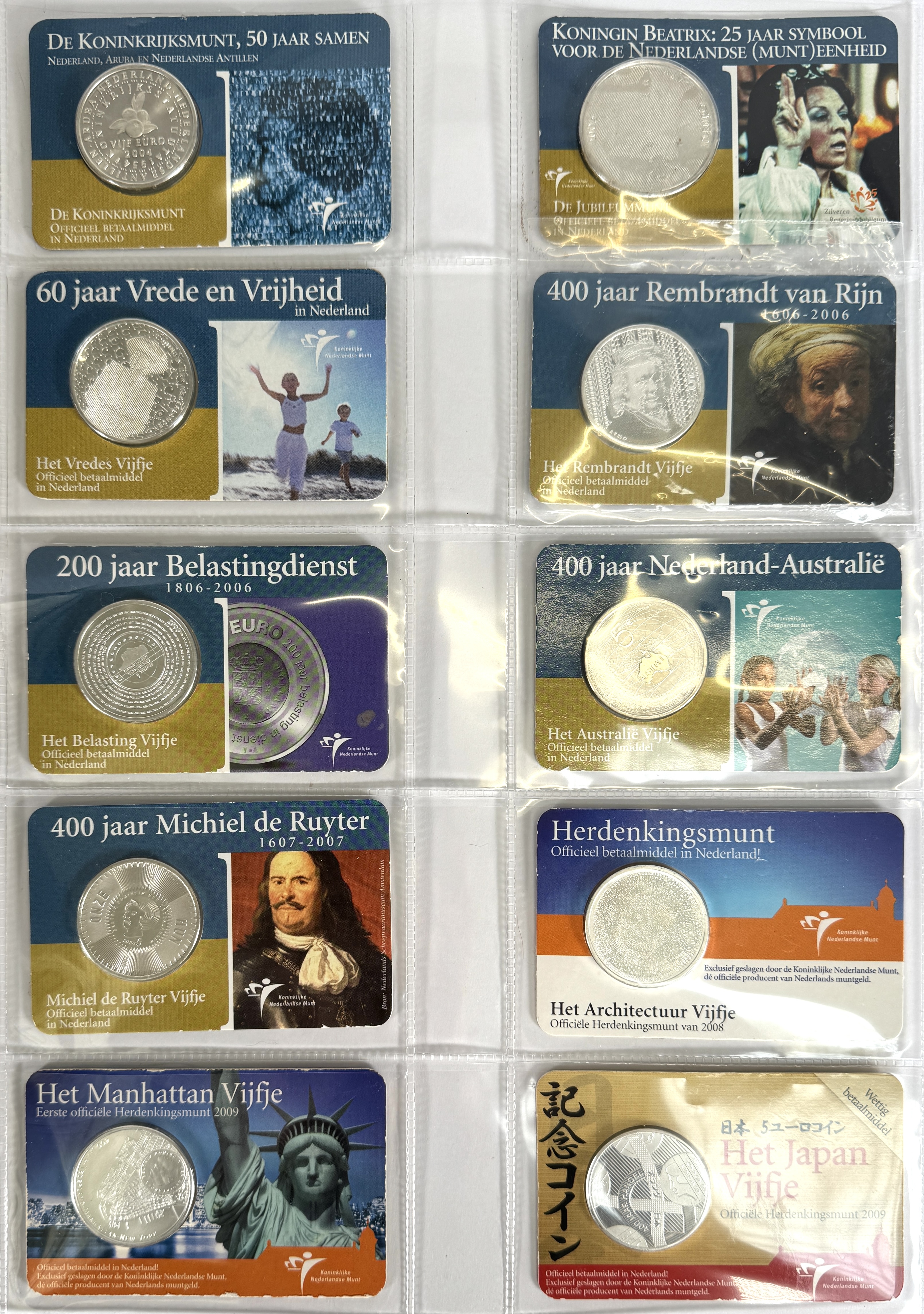 Verzameling van tien herdenkingsmunten uitgegeven door de Koninklijke Nederlandse Munt uit circa 2006-2009, negen €5-munten en één €10-munt, vervaardigd uit zilver en zwaar verzilverde metaallegeringen. De munten herdenken diverse thema's, waaronder "Rembrandt van Rijn", "Michiel de Ruyter" en "Het Manhattan Vijfje". Wil je deze munten in het echt bekijken? Kom naar de kijkdagen op 29, 30 en 31 augustus! |
