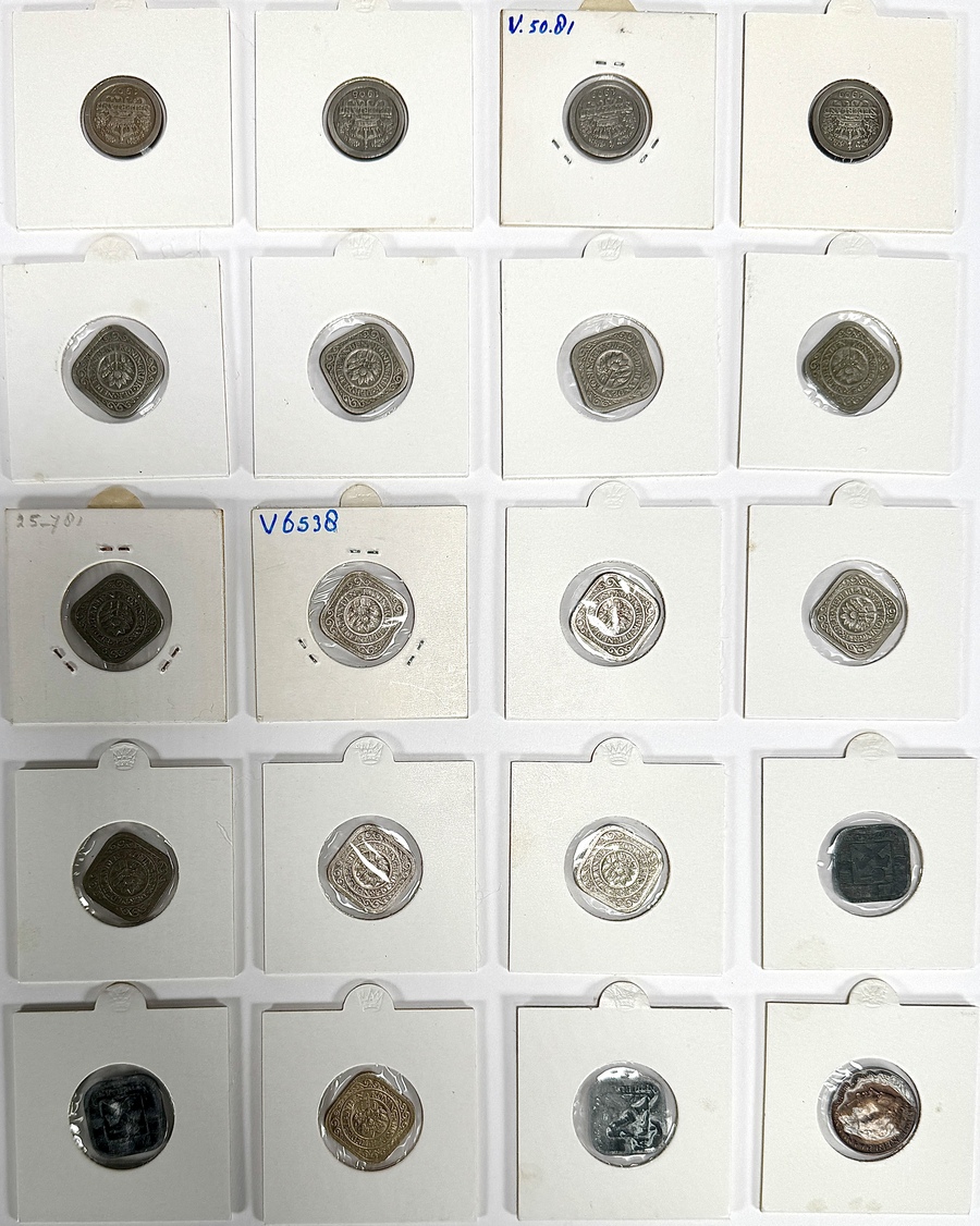 Een verzameling van twintig Nederlandse 5 cent munten, daterend uit de eerste helft van de 20e eeuw, geslagen uit koper, nikkel en zink. De munten hebben een vierkante vorm met afgeronde hoeken. Aan een zijde staat de nominale waarde in een krans, aan de andere zijde het Nederlandse wapen. De jaartallen zijn zichtbaar, waaronder 1914 en 1940. Jouw kans op deze munten begint met registreren – bied live of online mee!! |