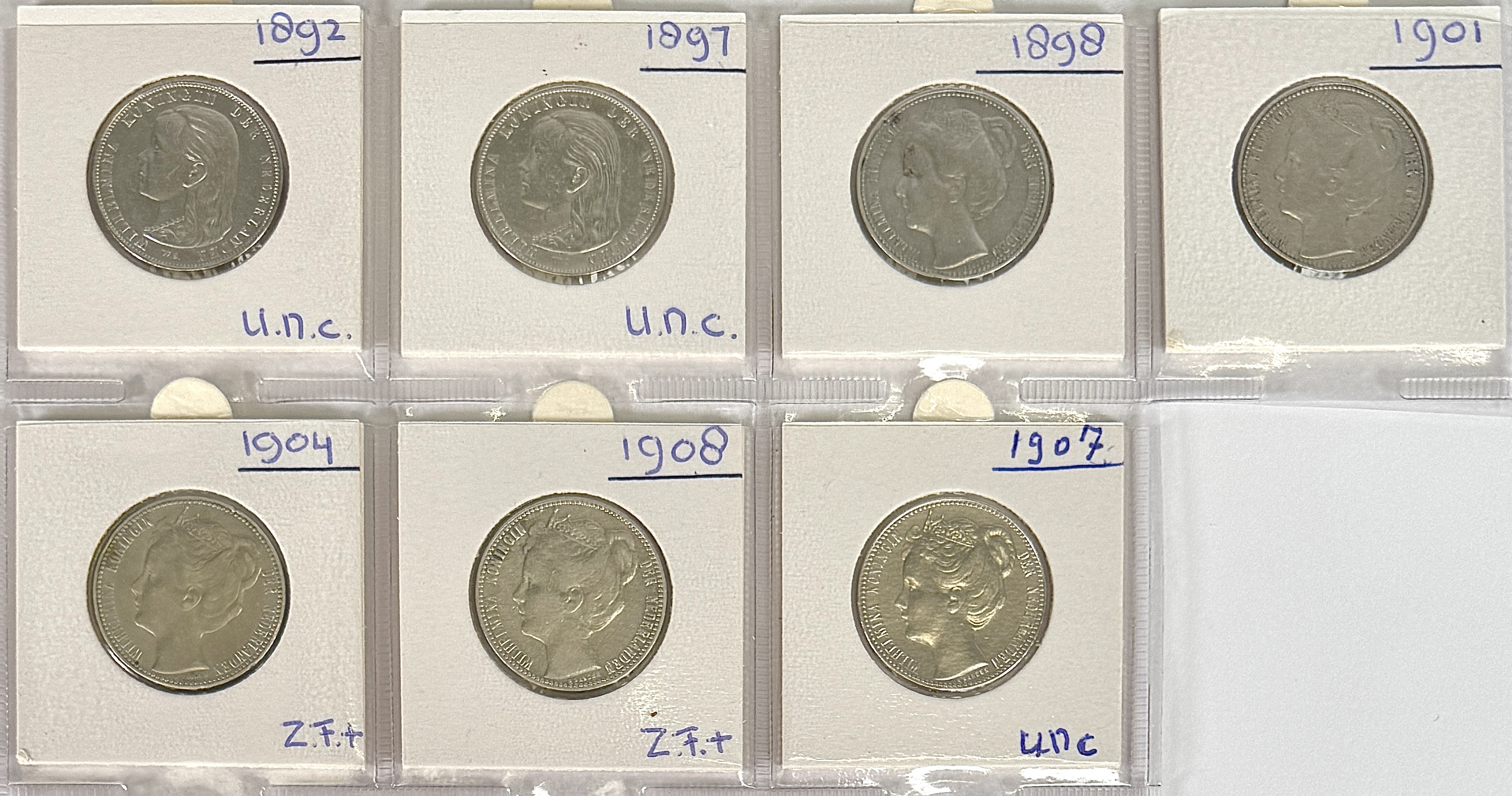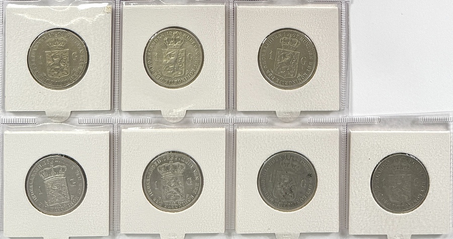 Zeven Nederlandse 1 guldenmunten, geslagen door de Rijksmunt Utrecht in zilver. Jaartallen: 1892, 1897, 1898, 1901, 1904, 1907 en 1908, verdeeld aan weerszijden van de kroon. Klassiek nationaal ontwerp jeugdbuste Wilhelmina (1892, 1897) en latere diadeem-buste, keerzijde met gekroond rijkswapen en waarde 1 G, met parelrand en rondschrift “MUNT VAN HET KONINKRIJK DER NEDERLANDEN”. Geïnteresseerd? Bezoek onze kijkdagen op 29, 30 of 31 augustus van 11:00 tot 17:00 uur! |