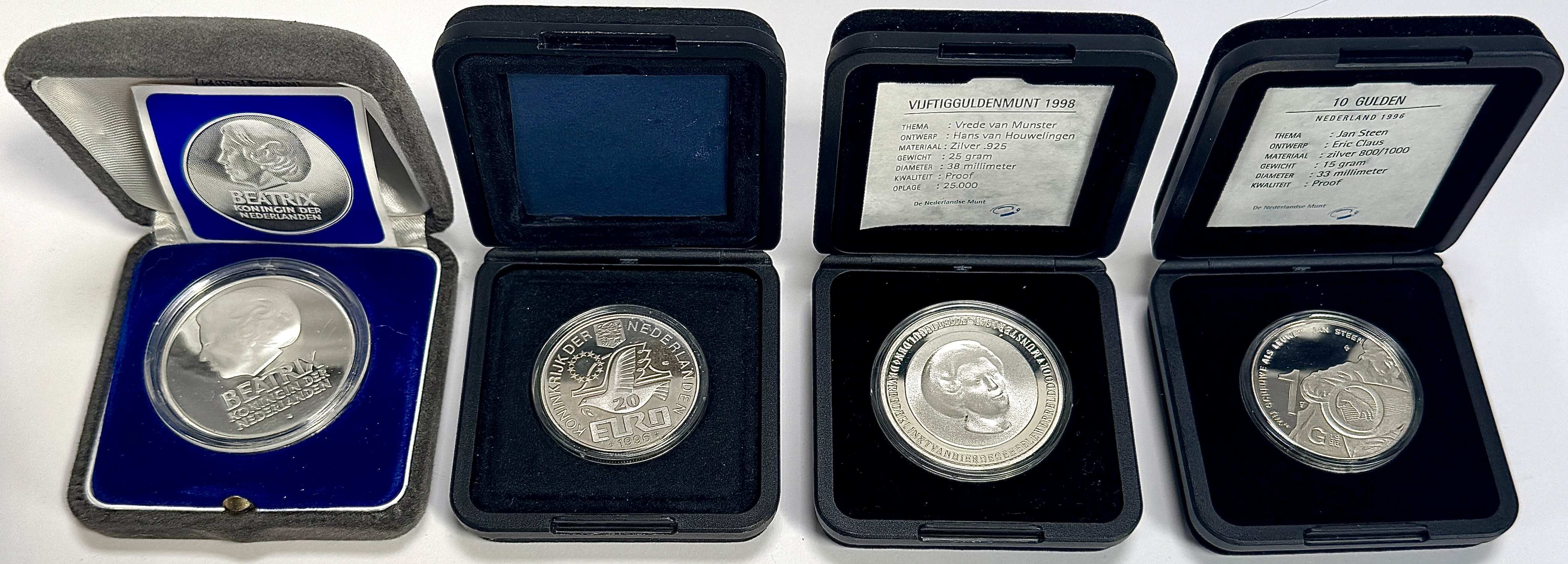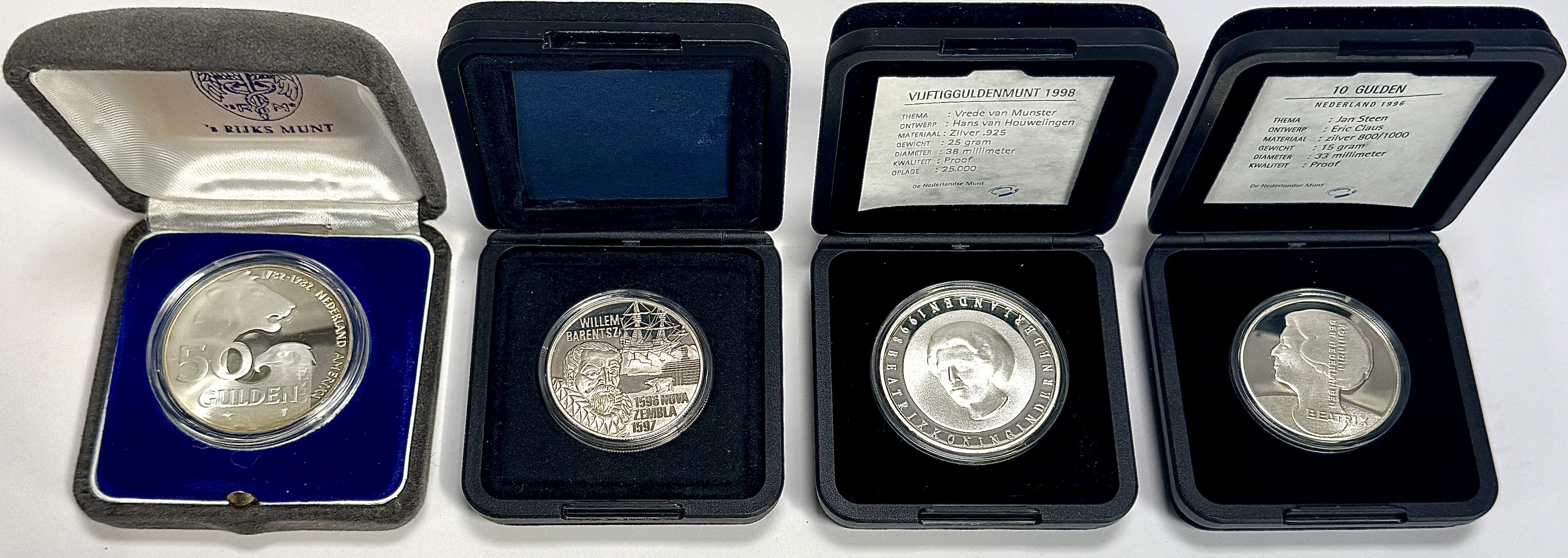 Vier Nederlandse zilveren herdenkingsmunten ontworpen door Hans van Houwelingen (1957) en Eric Claus (1936), gedateerd 1982, 1996 en 1998. Uitgevoerd in zilver, proof kwaliteit, geslagen door de Nederlandse Munt, met etuis en certificaten. Thematiek: portretten van koningin Beatrix, Willem Barentsz., de Vrede van Münster en Jan Steen, met waarde aanduidingen 50 gulden, 10 gulden en 20 euro. Klaar om te bieden? Registreer je nu en doe mee aan de veiling! |