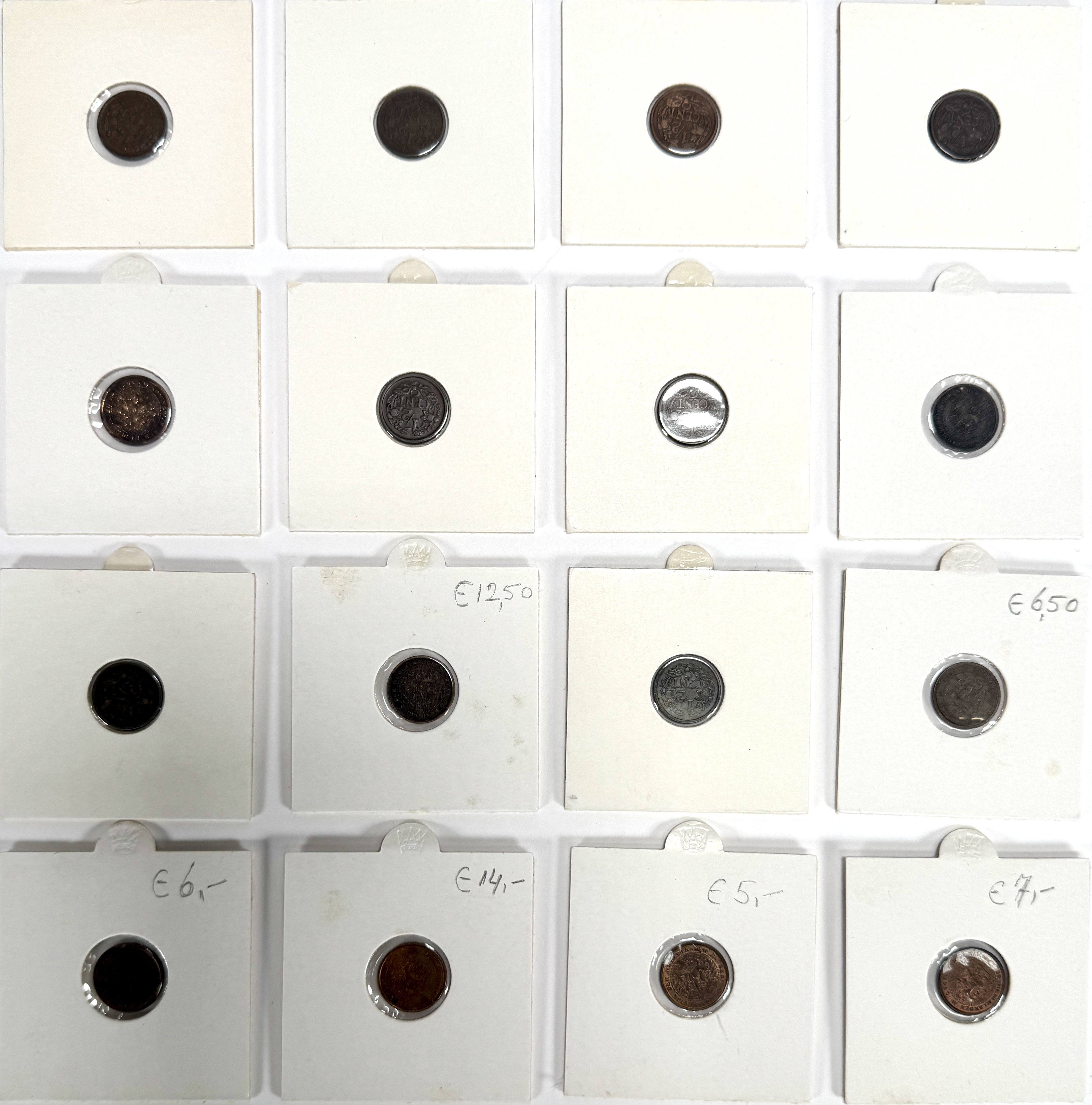 Verzameling van zestien Nederlandse ½ cent munten. Deze geslagen munten zijn gemaakt van brons en messing en dateren van 1909 tot 1940. De collectie toont diverse jaargangen met het Nederlandse wapen en de nominale waarde '1/2 CENT' op een krans van takken. Wil je de munten in het echt bekijken? Kom naar de kijkdagen op 29, 30 en 31 augustus! |