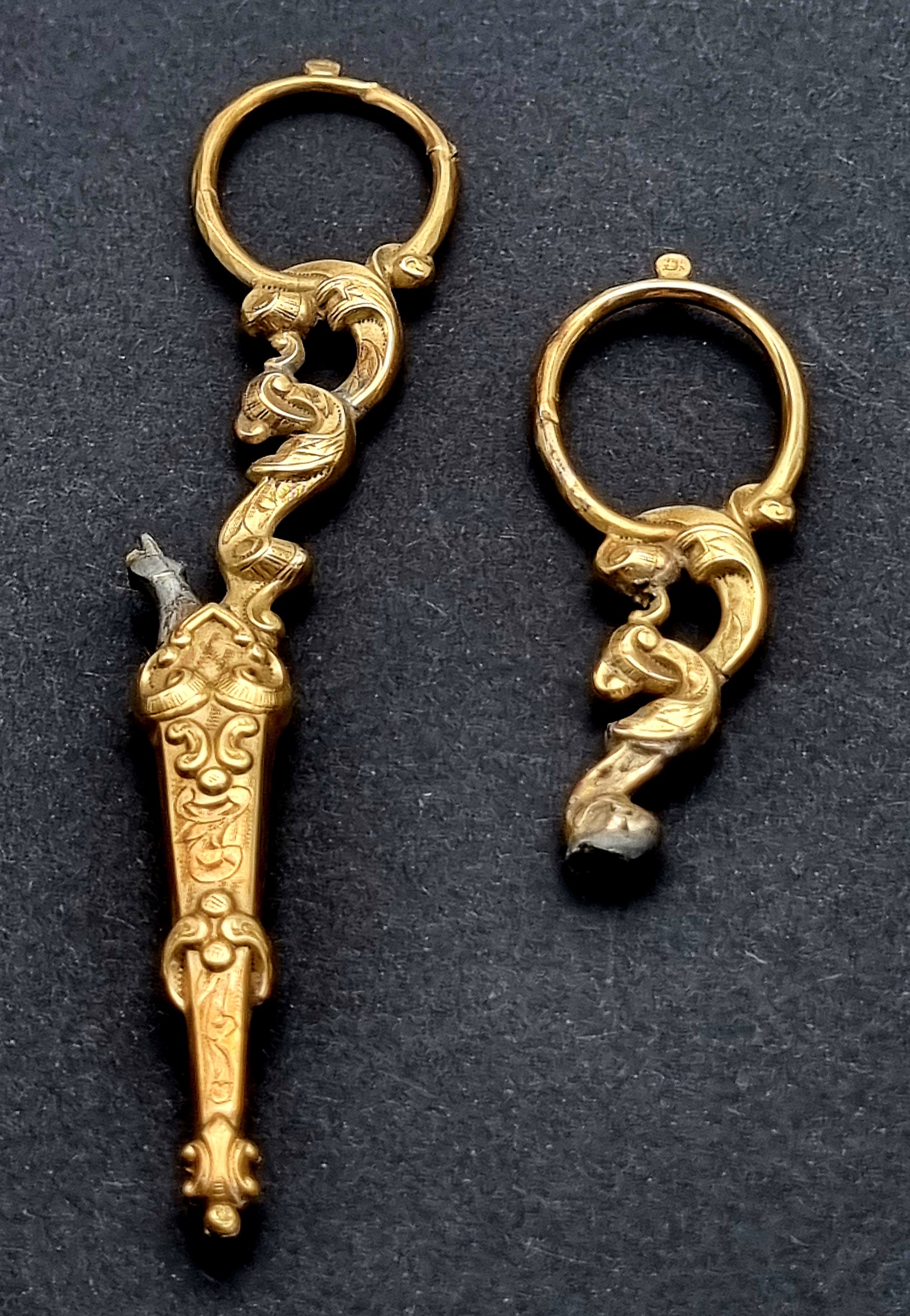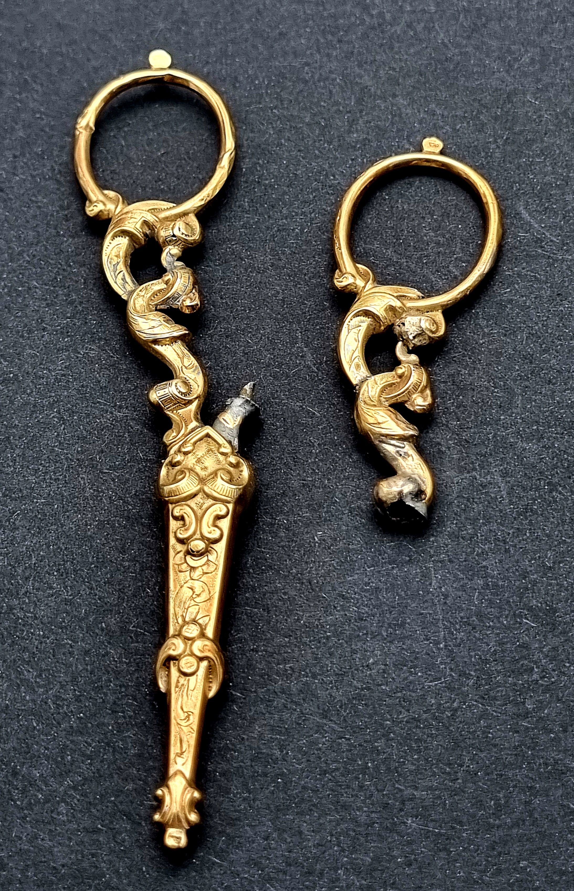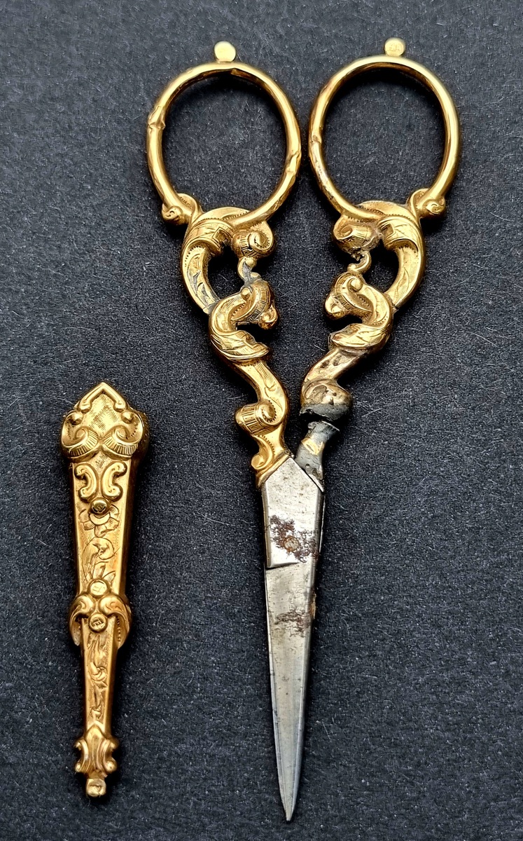 Empire naaigerei, midden 19e eeuw, uitgevoerd in 14 karaat goud, bestaande uit zes onderdelen waaronder schaar, vingerhoed en draadtrekker. De stukken tonen gegraveerde florale motieven en rocaille ornamentiek. Geplaatst in een tortoise doosje met rood fluwelen interieur. Getoetst 14 karaat en vervaardigd met fijn graveerwerk en handmatige afwerking, een representatief voorbeeld van 19e‑eeuwse luxe huishoudelijke gebruiksvoorwerpen. Eerst dit gouden naaigerei zien voordat je biedt? Bezoek onze kijkdagen op 29, 30 en 31 augustus van 11:00 tot 17:00 uur! |