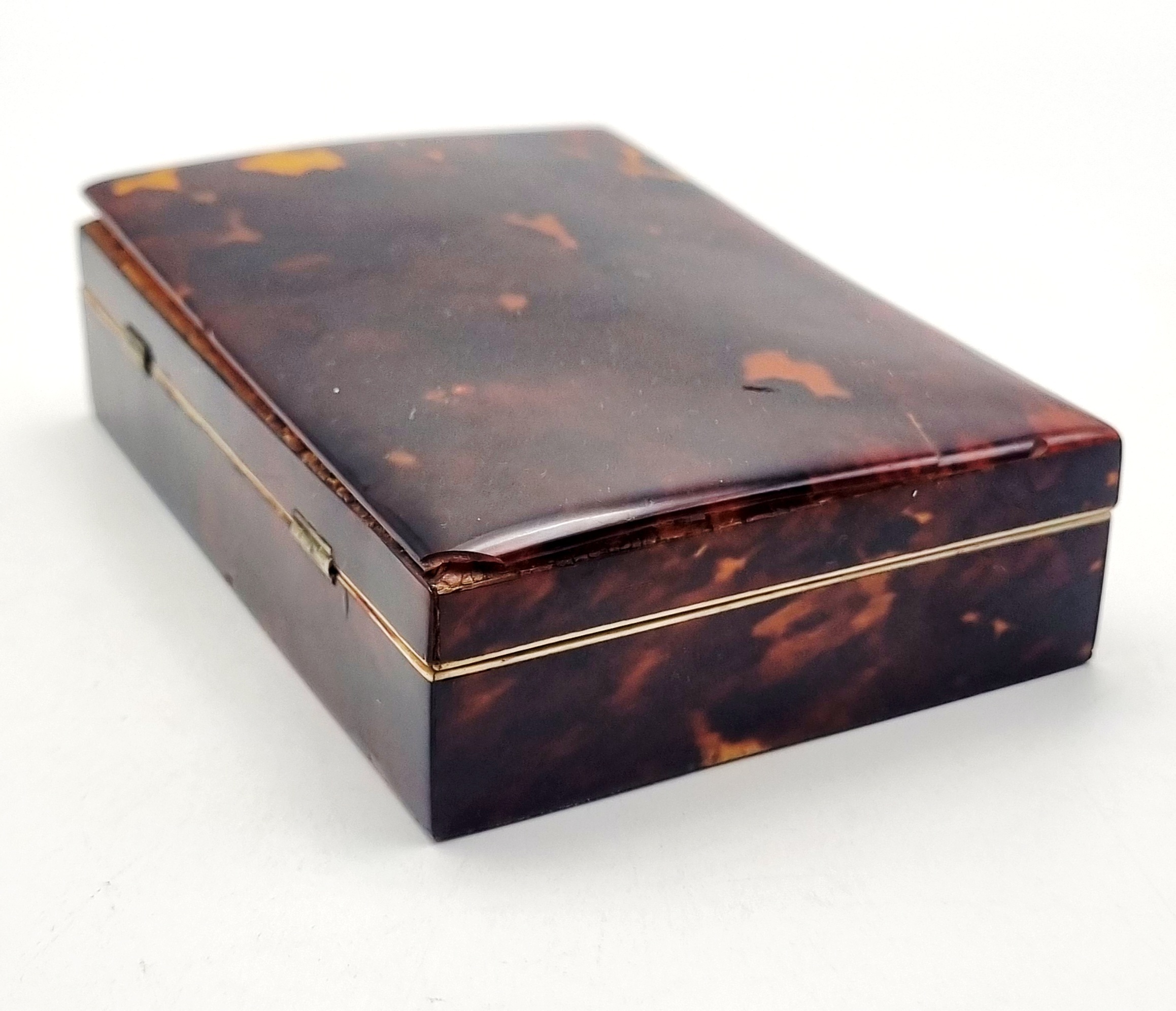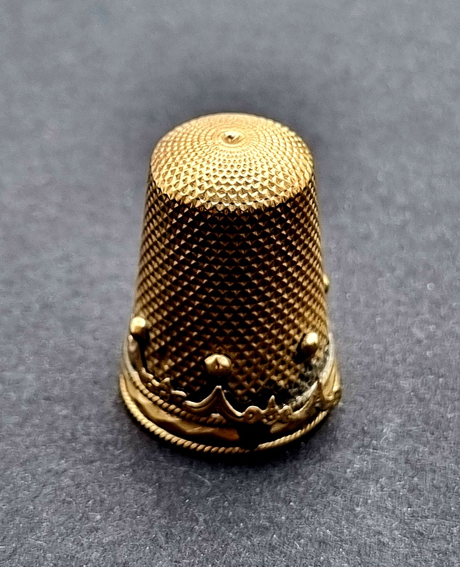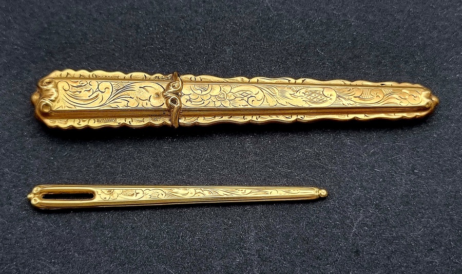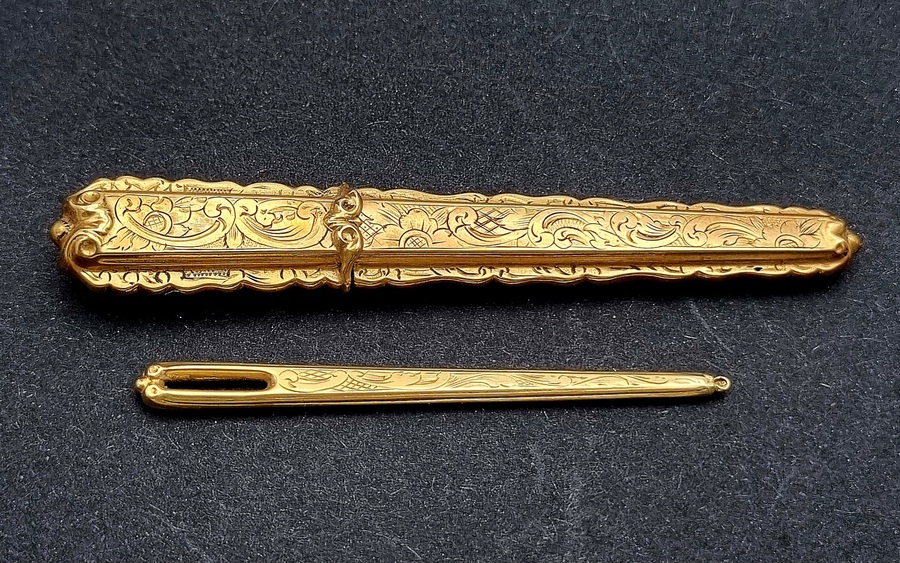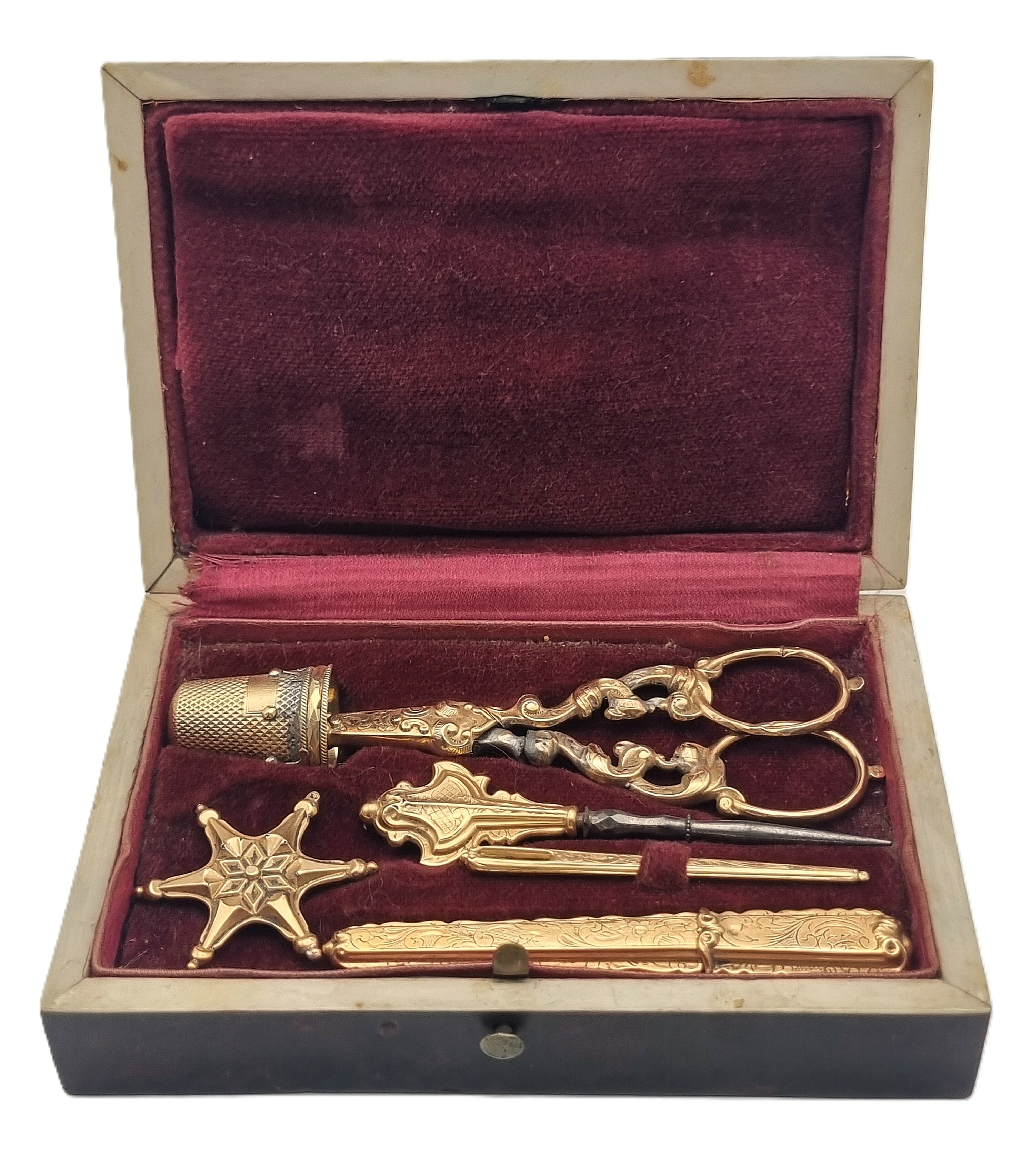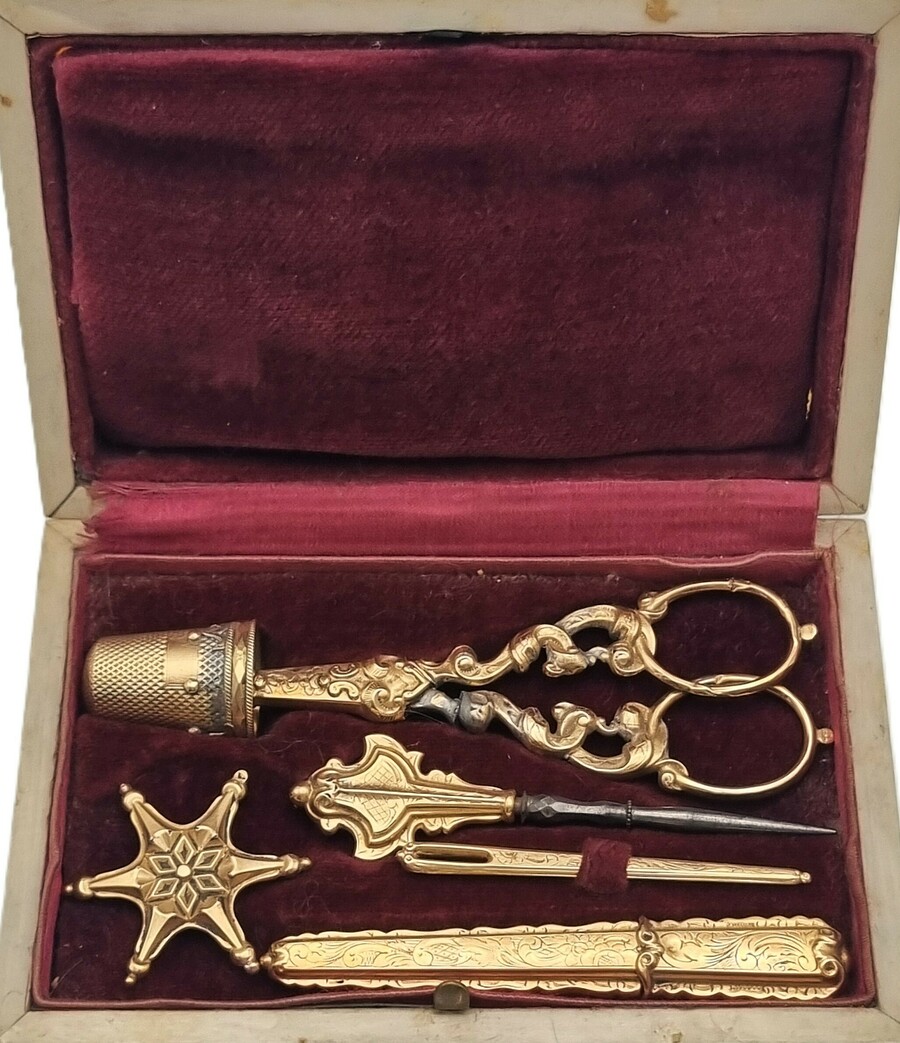 Gouden naaigerei in tortoise doosje, midden 19e eeuw