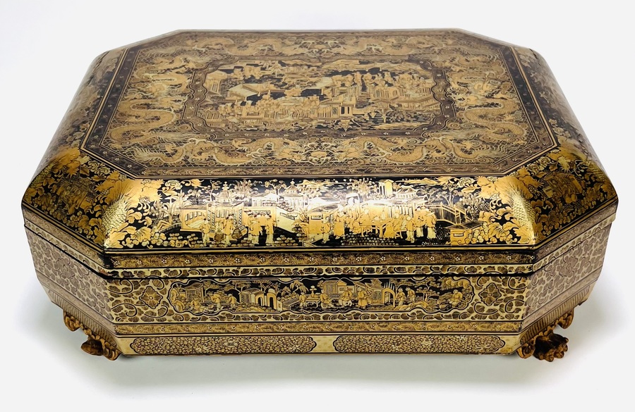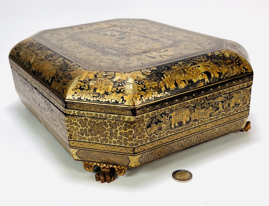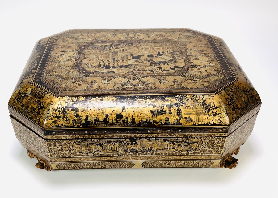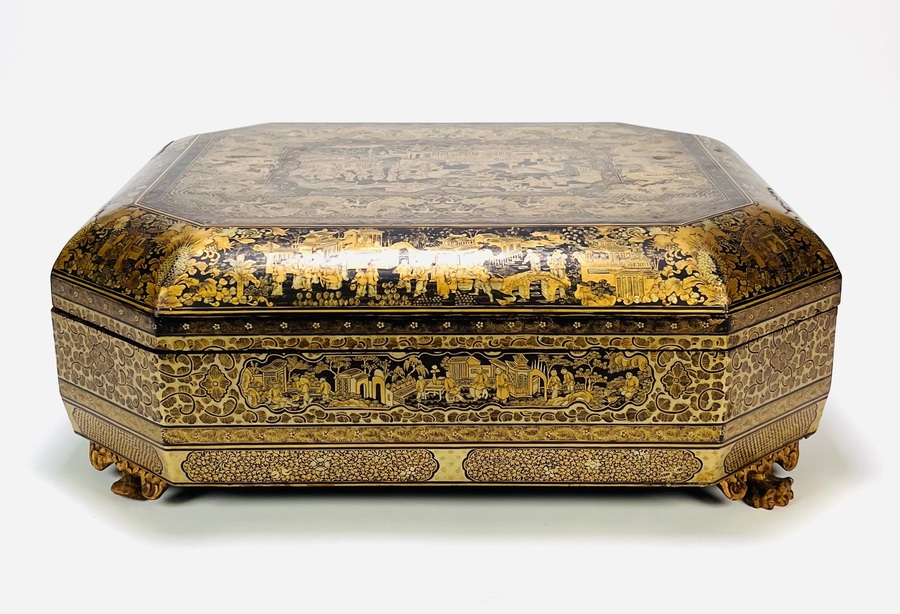 Chinese exportlak mahjong doos, achthoekig van vorm, vervaardigd in Canton, China, circa 1880. De doos is uitgevoerd in zwart gelakt hout met schilderingen en rust op klauwpoten. Het interieur bevat zeven losse gelakte dozen met speelstukken en decoratieve bakjes. De decoratie toont vergulde scènes met figuren in paviljoen- en tuinomgevingen, typerend voor de Canton exportlaktraditie. Zeker zijn van deelname? Plaats vanaf 22 augustus een schriftelijk bod online! |