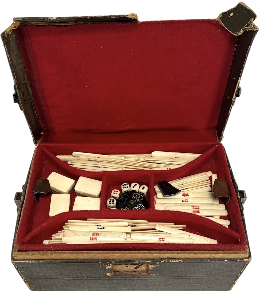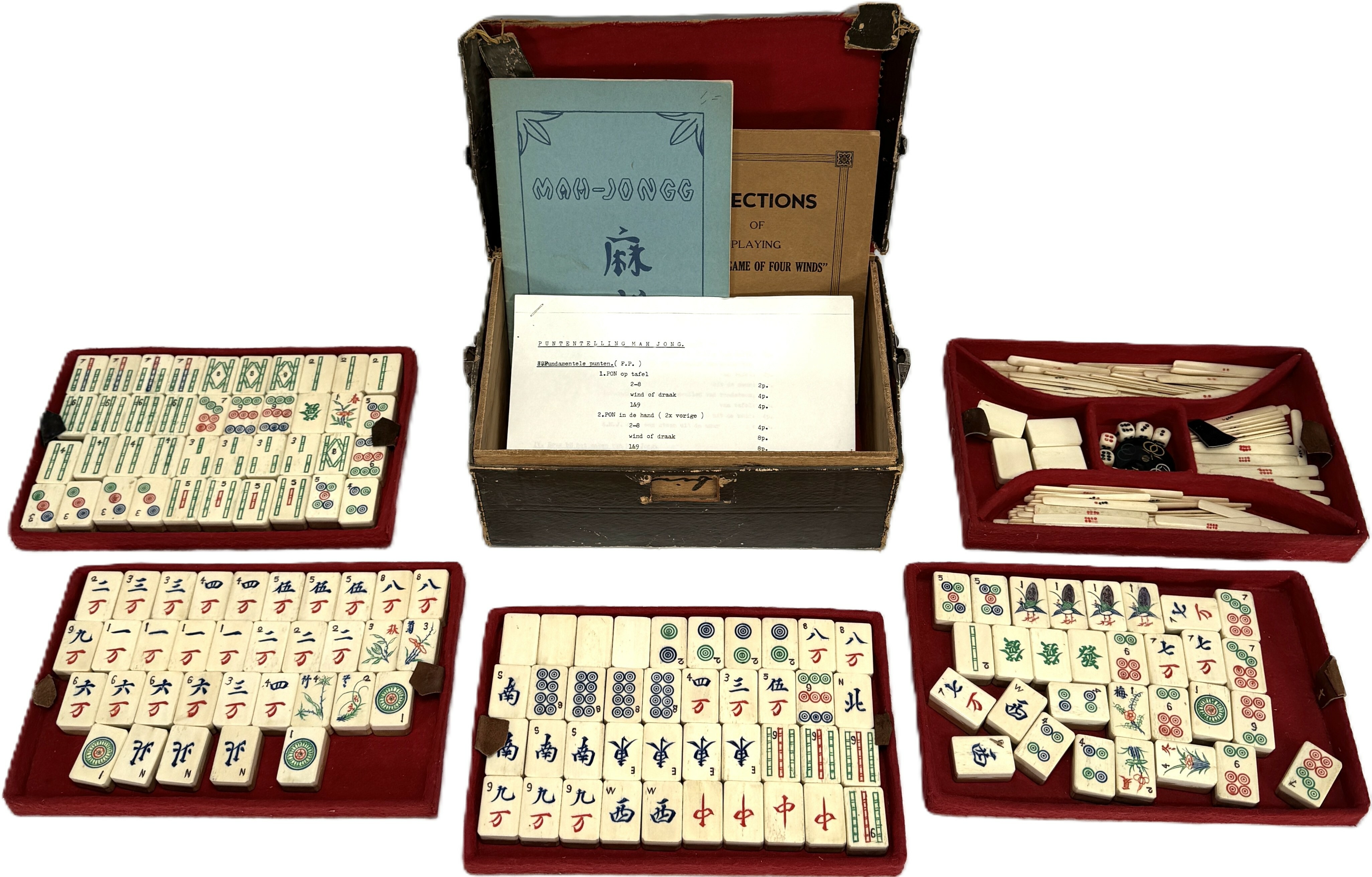 Mahjong omstreeks 1930, bestaande uit handgesneden been- en bamboetegels, houten en kartonnen doos met rode textielvoering. Compleet met fiches, dobbelstenen en handleidingen in Nederlands en Engels. Traditionele gravures in meerkleurig decor met karakters en bloemmotieven. Inclusief meerdere inzetbakken en originele sluiting. Wilt u meedoen aan de veiling? Registreer en bied live of online! |