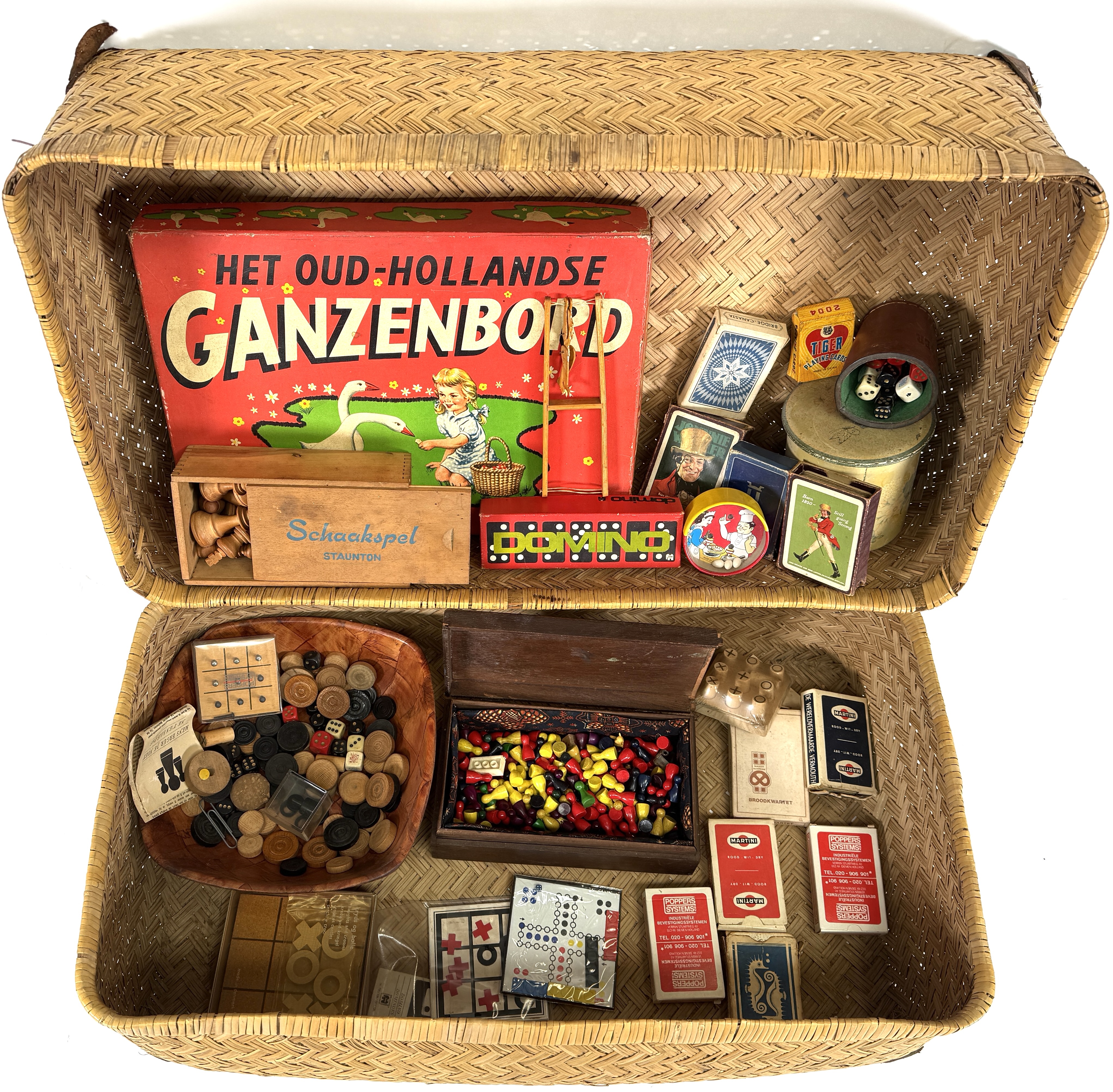 Rieten mand met gezelschapsspellen, midden 20e eeuw