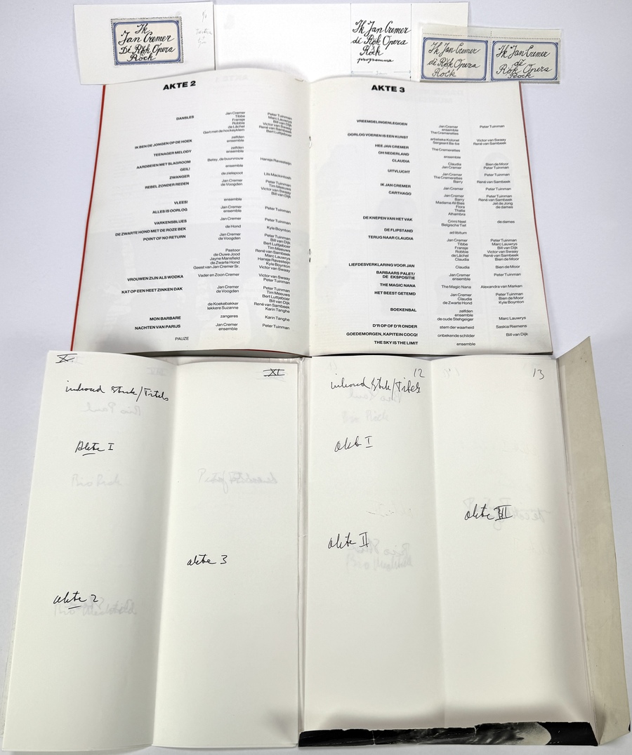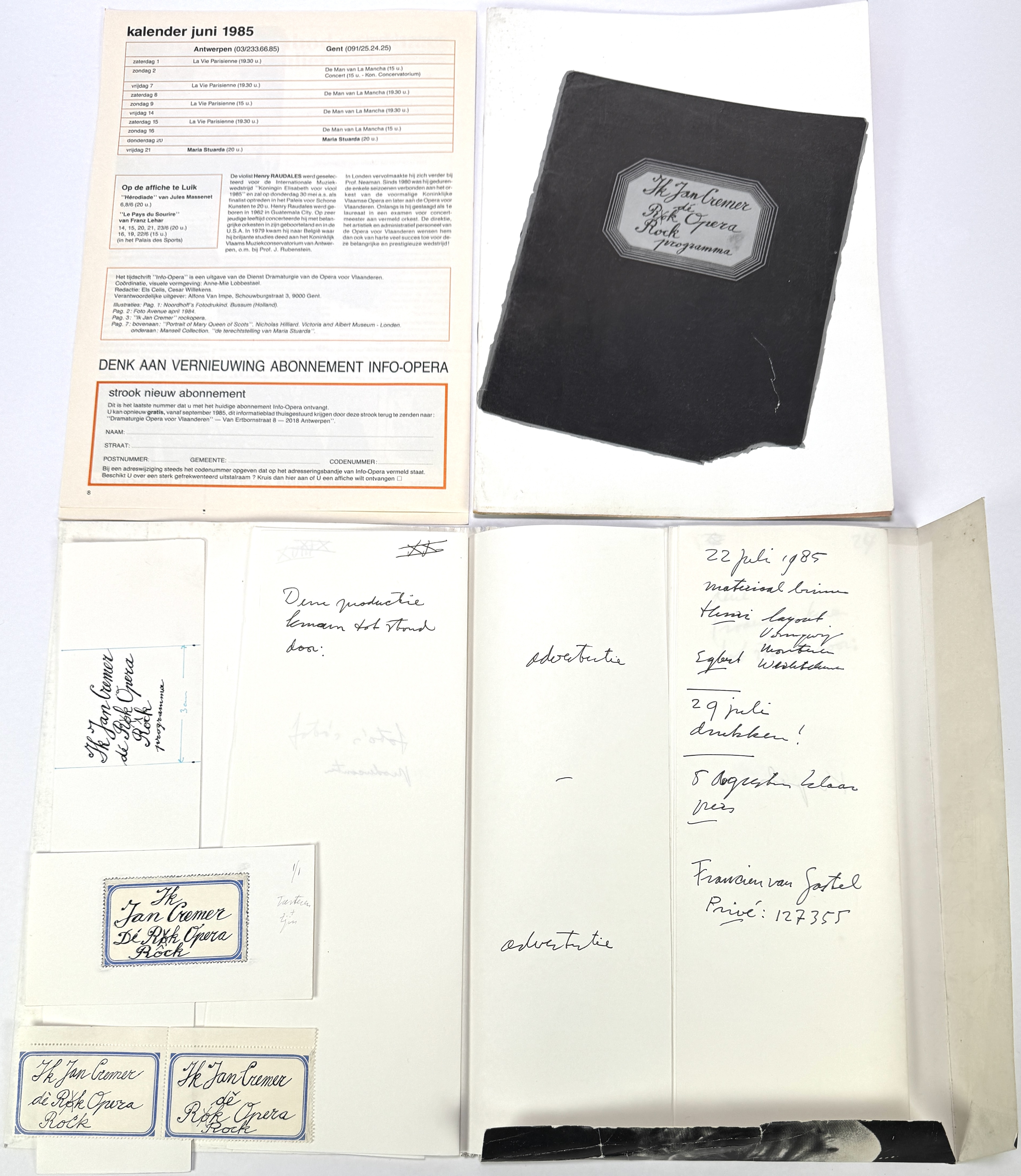 Map met promotiemateriaal, tickets en programma’s voor “Ik Jan Cremer-De Rock Opera”, 1985. Bevat actiefoto’s, handgeschreven notities, drukproeven en abonnementsstroken. Deze uitgebreide set documenteert de visuele identiteit en productievoorbereiding van deze experimentele Nederlandse rockopera.
