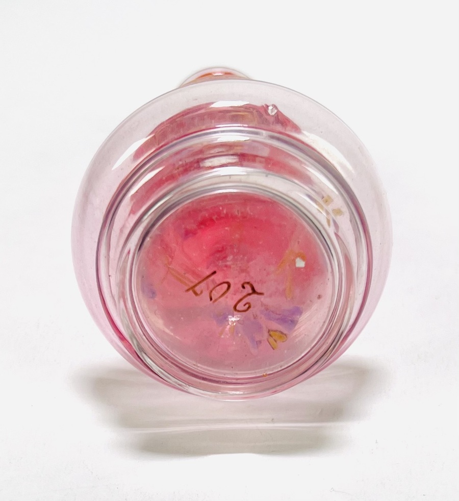 Eind 19e-eeuwse Boheems glazen parfumflesje van gekleurd glas, overlopend van roze naar rood, met handgeschilderde florale motieven. Uitgevoerd met kristallen stop. De fles is onderaan gemerkt met het getal 207. Typisch voorbeeld van historiserend decoratief glas uit Midden-Europa. Wil je het parfumflesje in het echt bekijken? Kom naar de kijkdagen op 29, 30 en 31 augustus! |