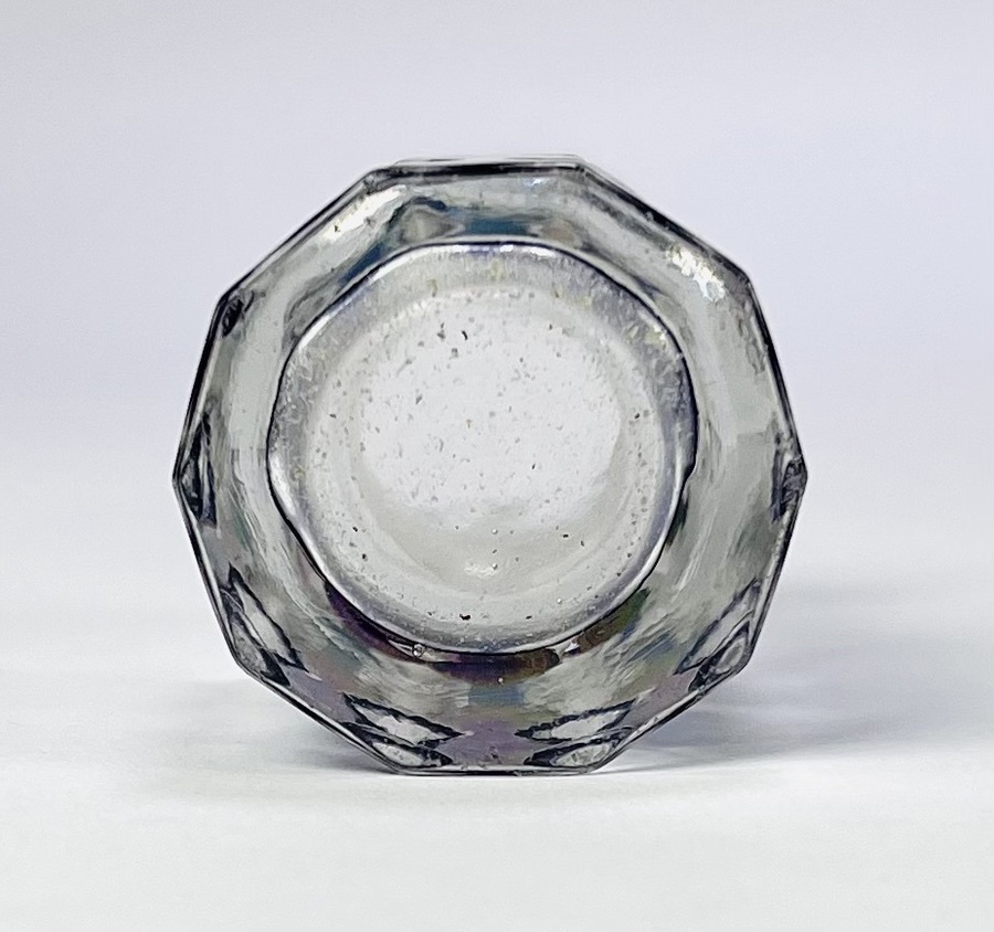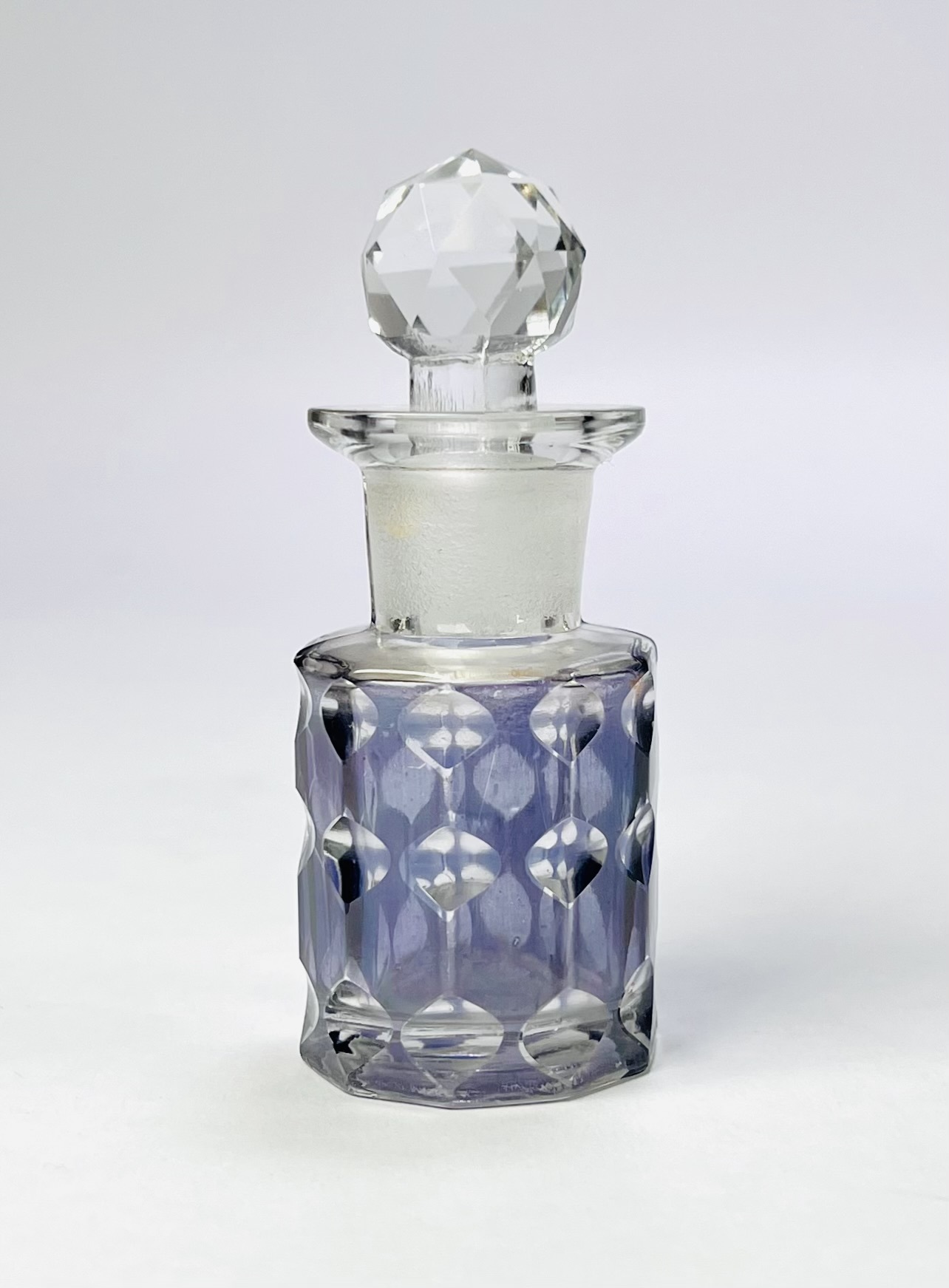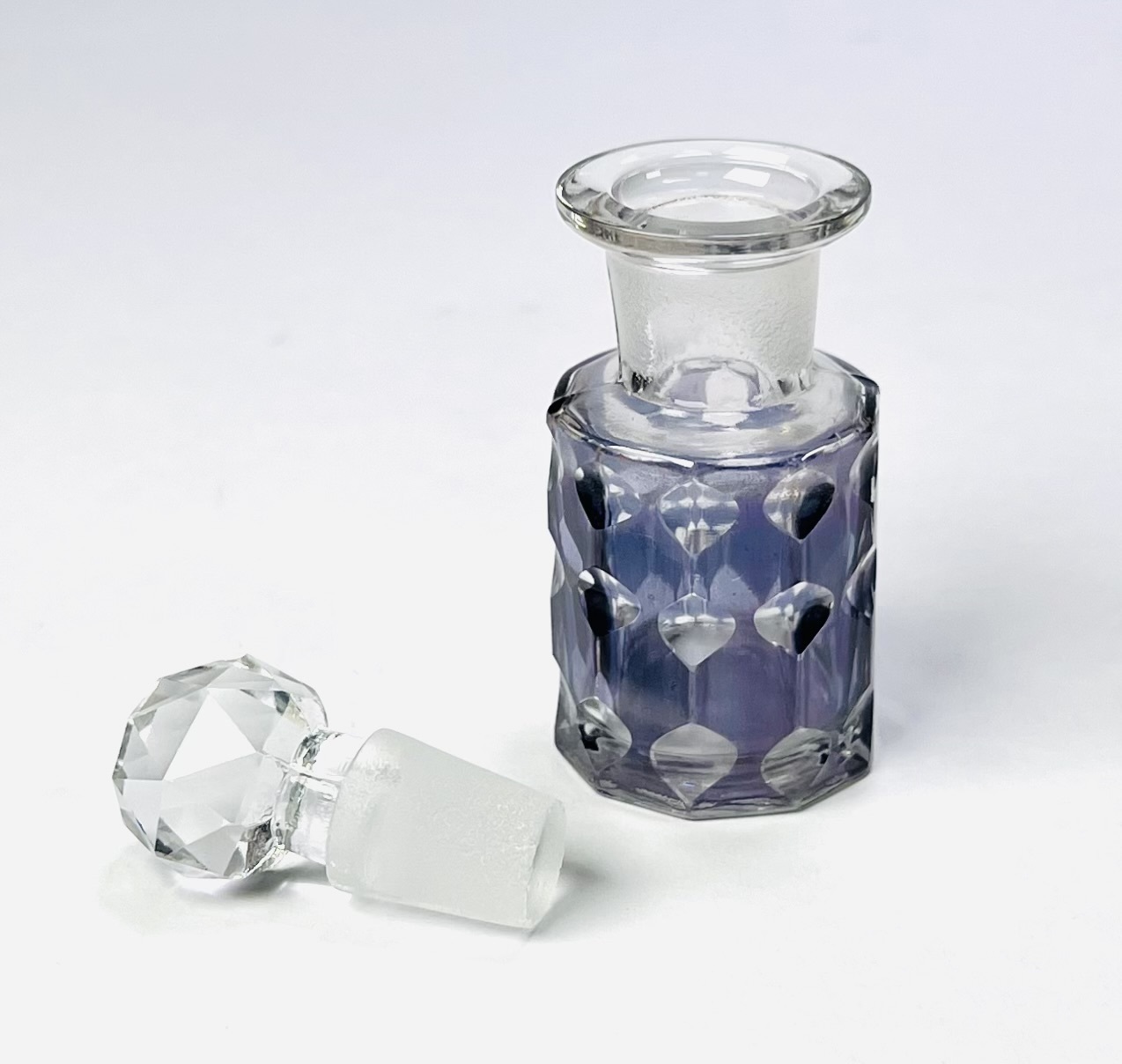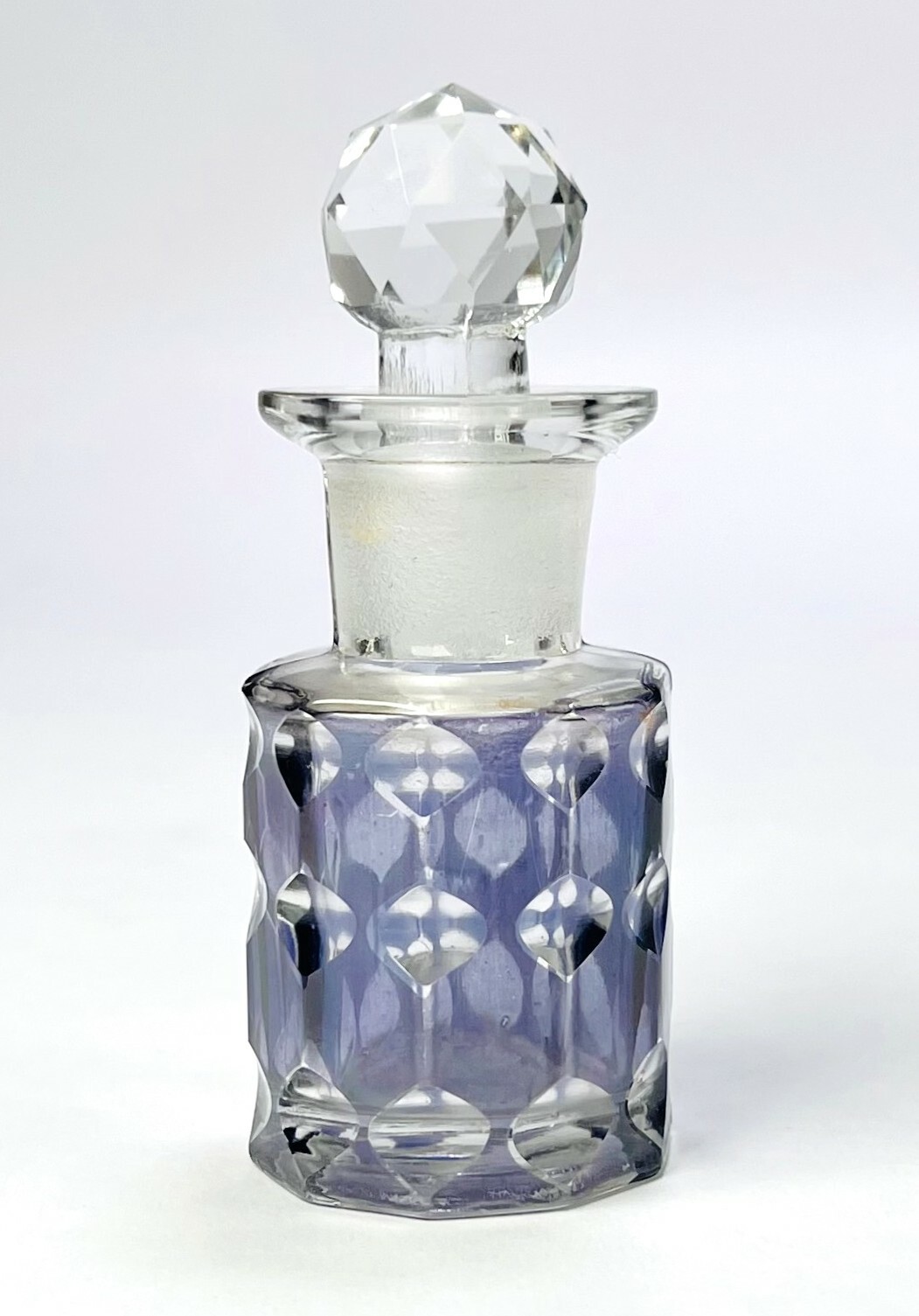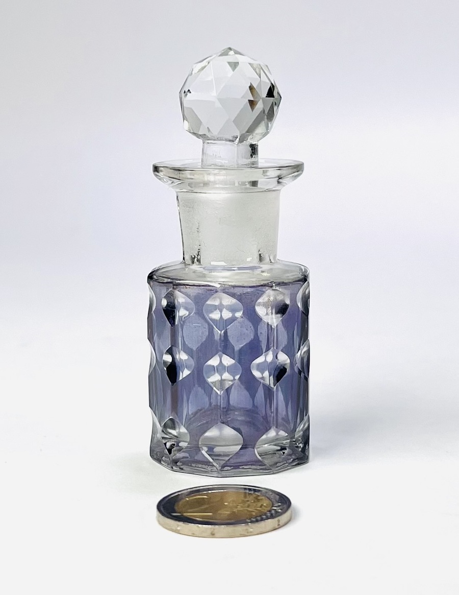 Parfumflesje van kleurloos en paars getint geslepen kristalglas, eind 19e/begin 20e eeuw. Achthoekige vorm met diep geslepen geometrisch patroon en bijpassende facetgeslepen stop. Typisch Midden-Europees gebruiksglas met kenmerkende technische precisie en afwerking, vervaardigd via slijpen en polijsten. Bied eenvoudig mee, live of online. Registreer nu! |
