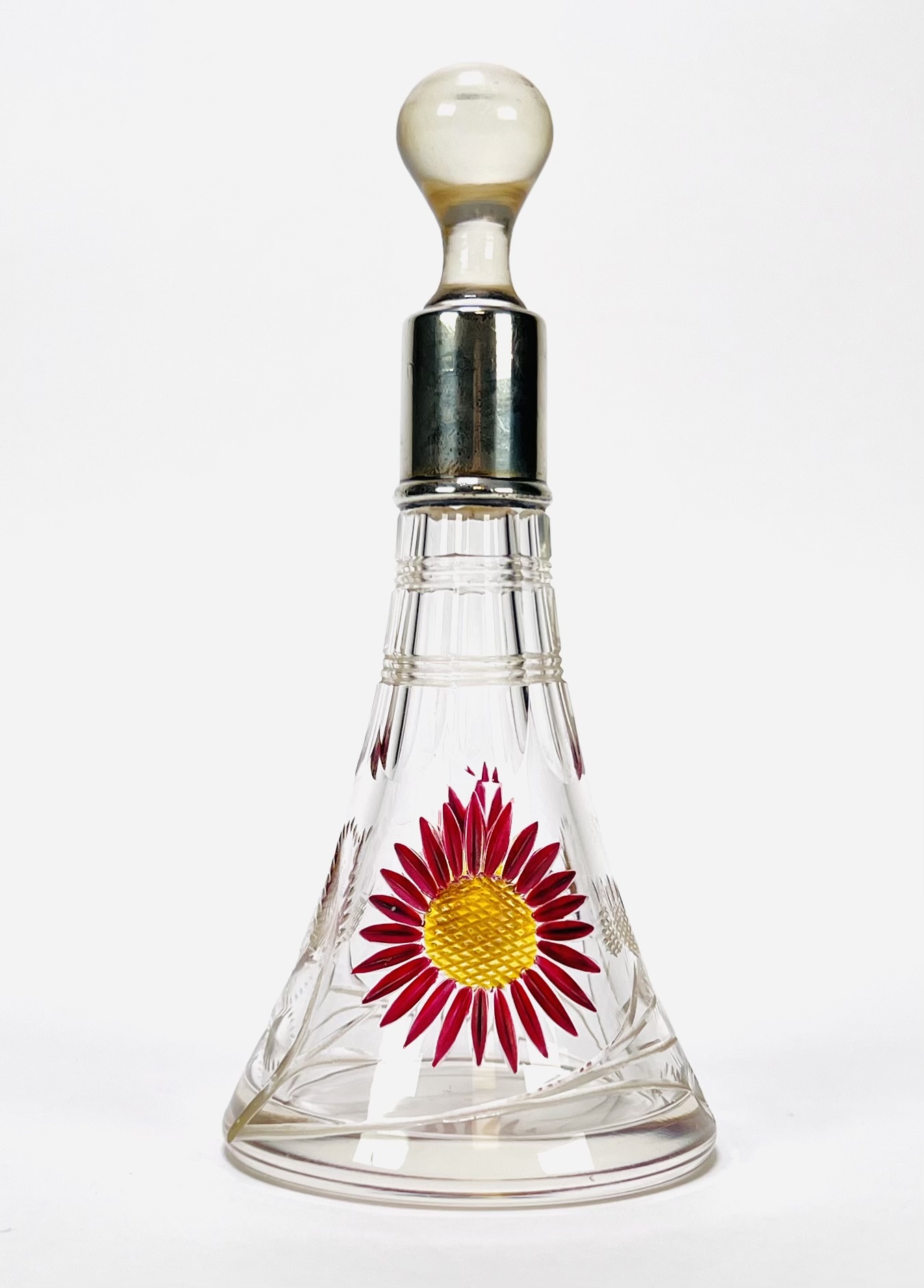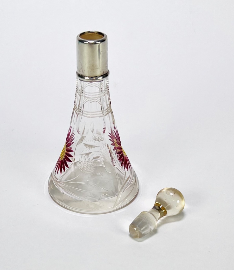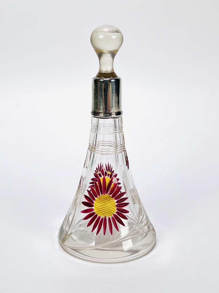 Kristallen parfumflesje, circa 1900–1920, met geslepen florale motieven en handgeschilderde emaille bloemen, voorzien van glazen stop en zilverkleurige montuur. Het conische model en de combinatie van slijpwerk en emaille zijn kenmerkend voor Boheems glas uit deze periode. Geïnteresseerd? Bezoek onze kijkdagen voor een persoonlijke bezichtiging! |
