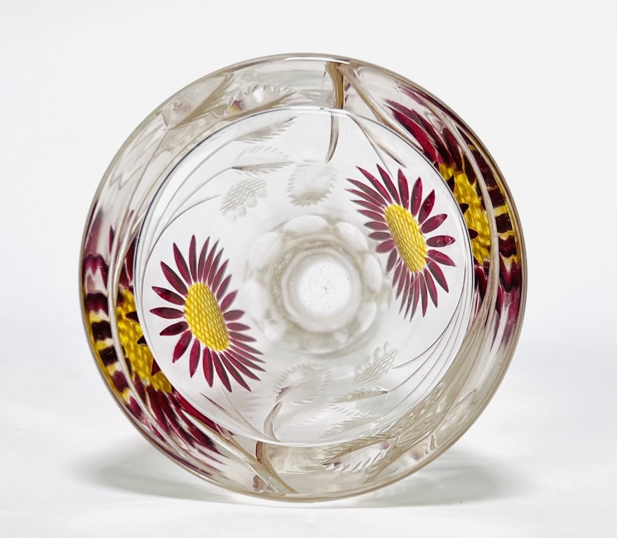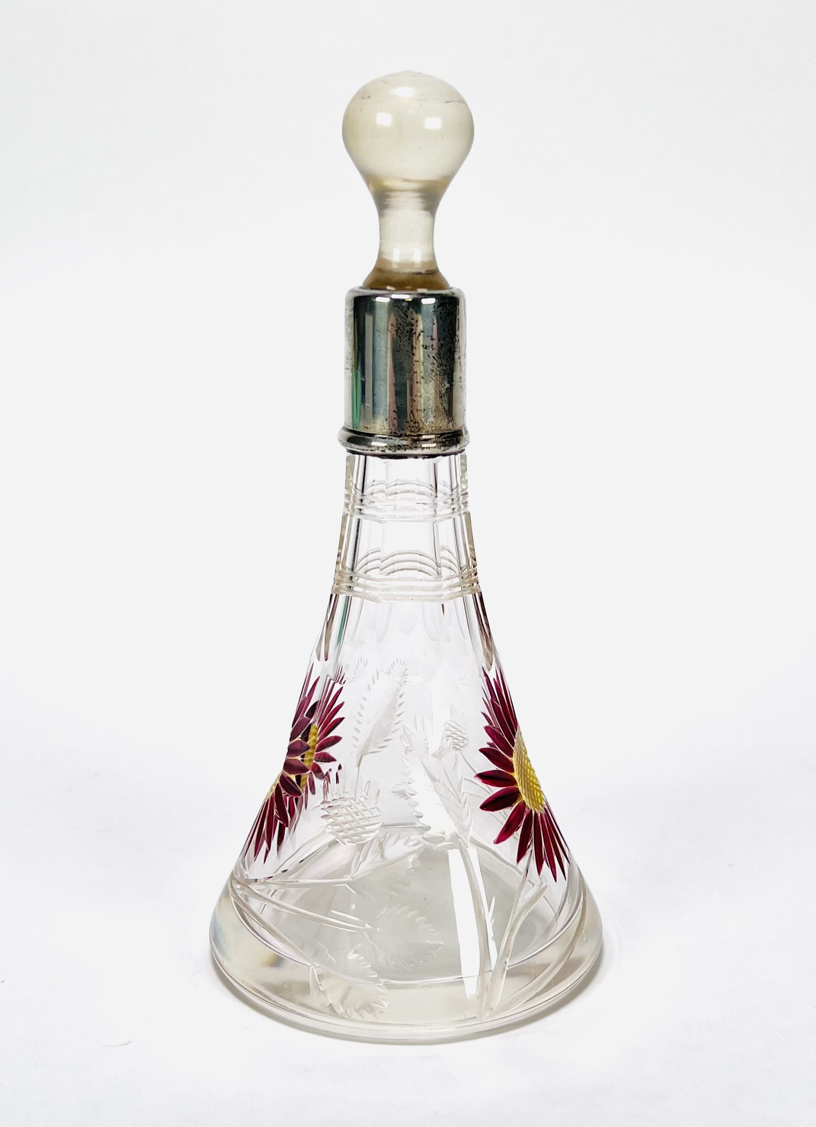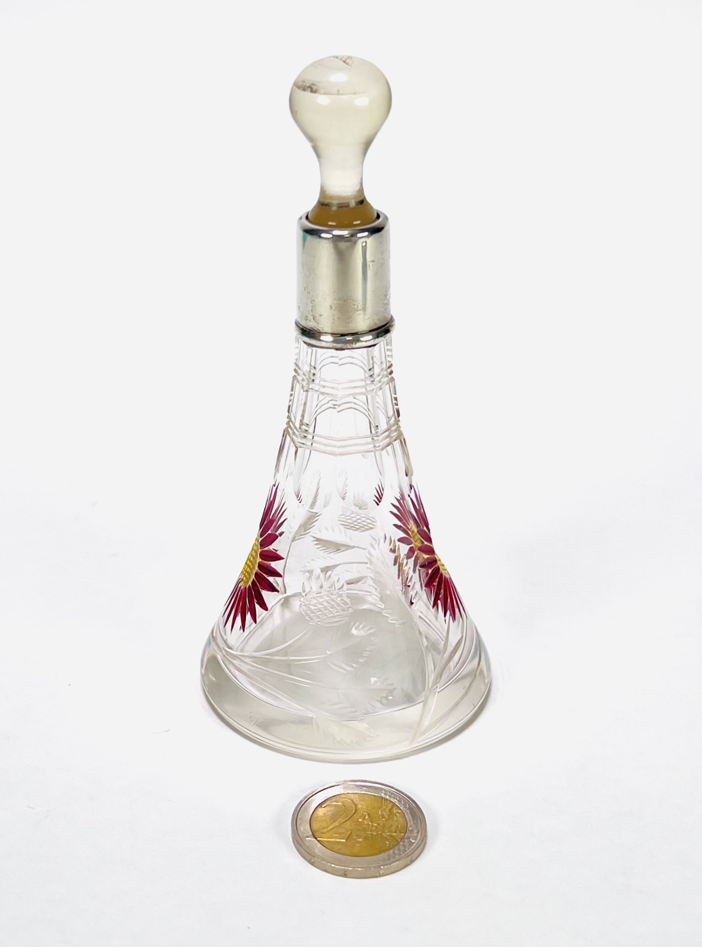 Kristallen parfumflesje, circa 1900–1920, met geslepen florale motieven en handgeschilderde emaille bloemen, voorzien van glazen stop en zilverkleurige montuur. Het conische model en de combinatie van slijpwerk en emaille zijn kenmerkend voor Boheems glas uit deze periode. Geïnteresseerd? Bezoek onze kijkdagen voor een persoonlijke bezichtiging! |