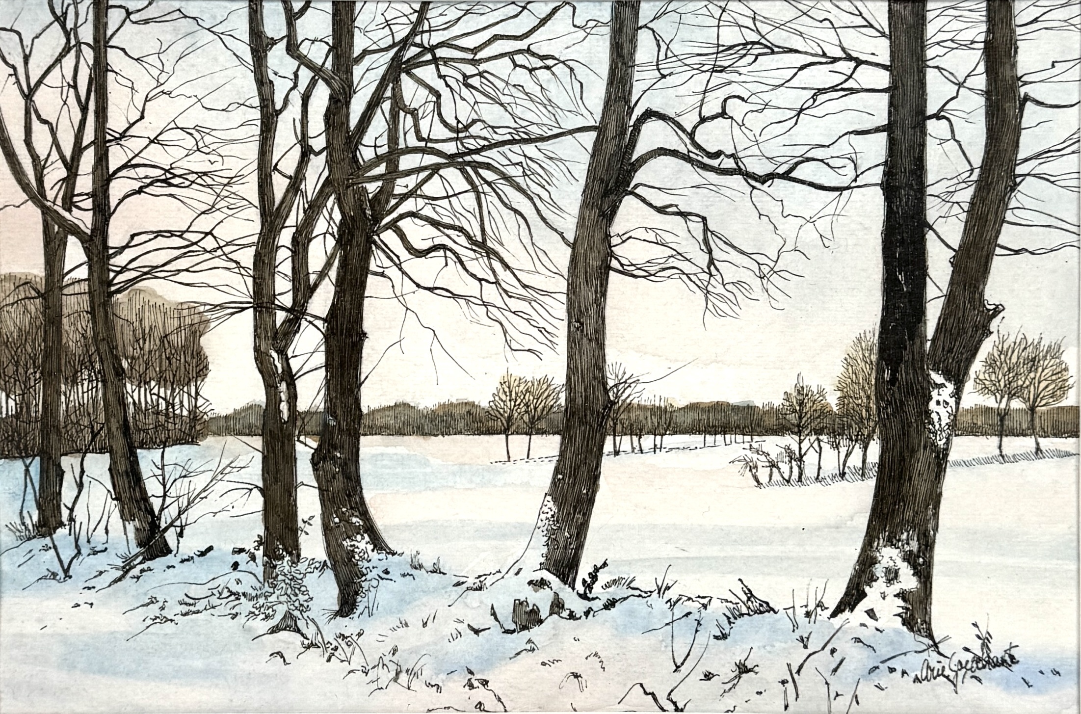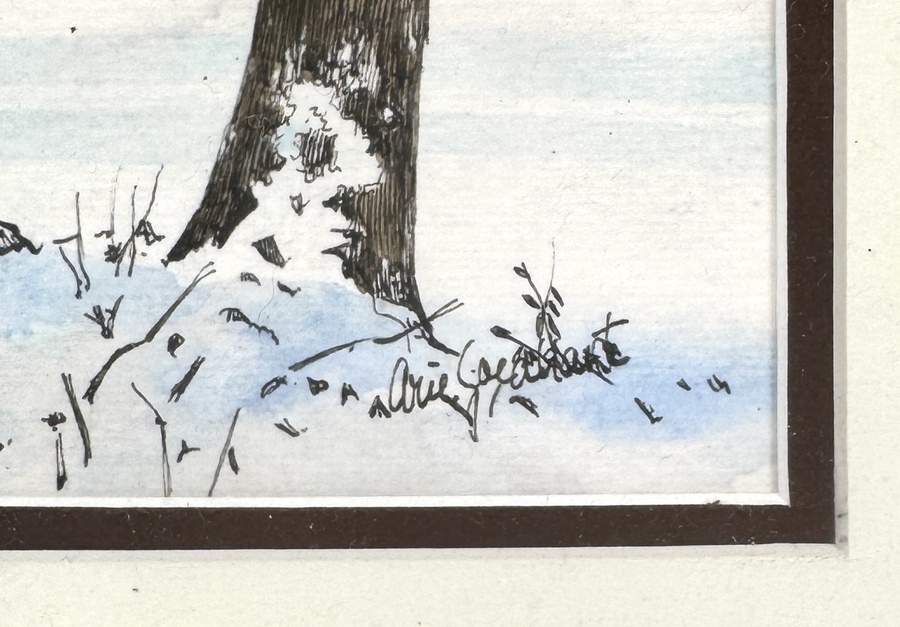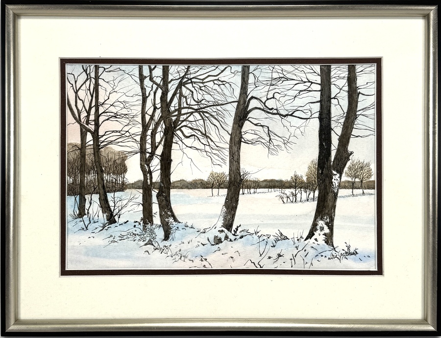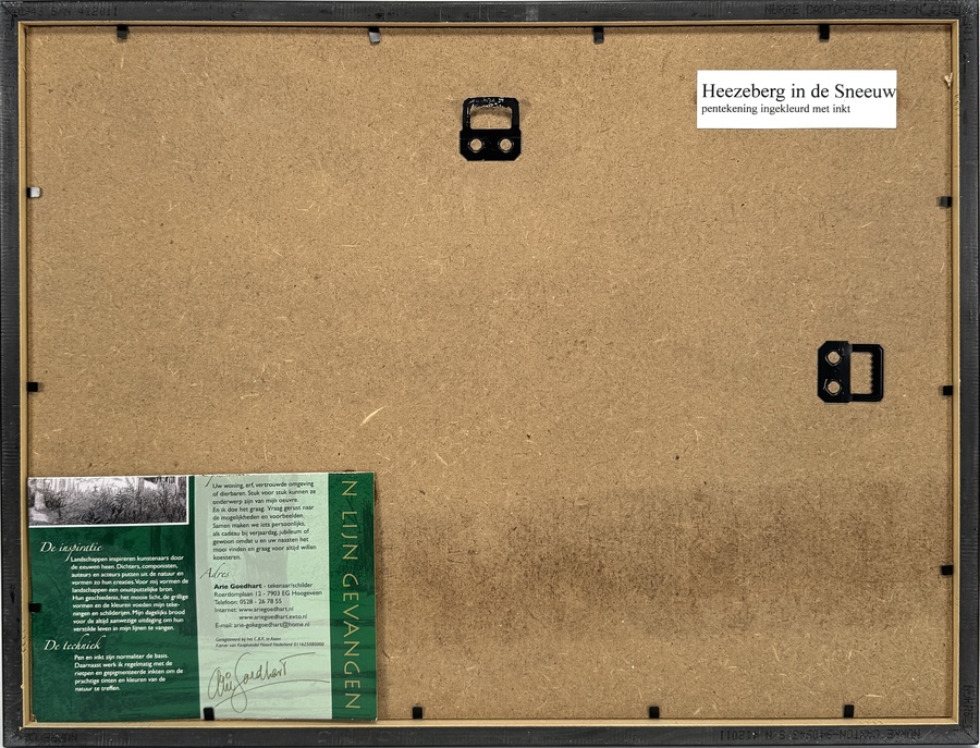 Gemengde techniek met inkt en aquarel op papier door de Hoogeveense kunstenaar Arie Goedhart (1944-2020), bekend van zijn vele hunebed tekeningen. Het werk toont een besneeuwd winterlandschap met kale bomen en een open veld, zorgvuldig opgebouwd in fijne lijnen en subtiele kleurvlakken. Ingelijst met passe-partout en verso informatie. Gesigneerd rechtsonder. De titel "Heezeberg in de Sneeuw", begin 21e eeuw. Kom kijken tijdens de kijkdagen op 29, 30 of 31 augustus van 11:00 tot 17:00 uur! |