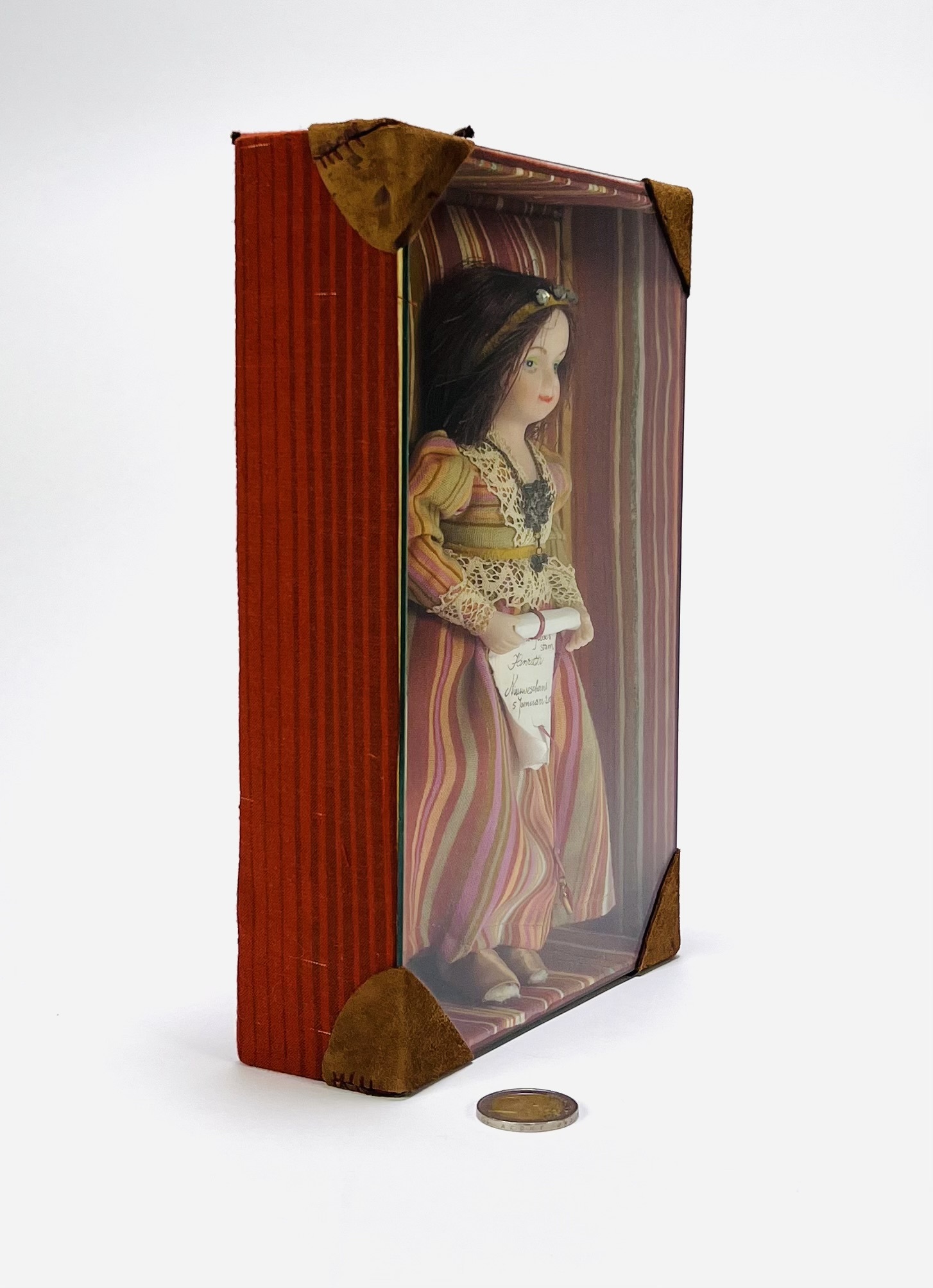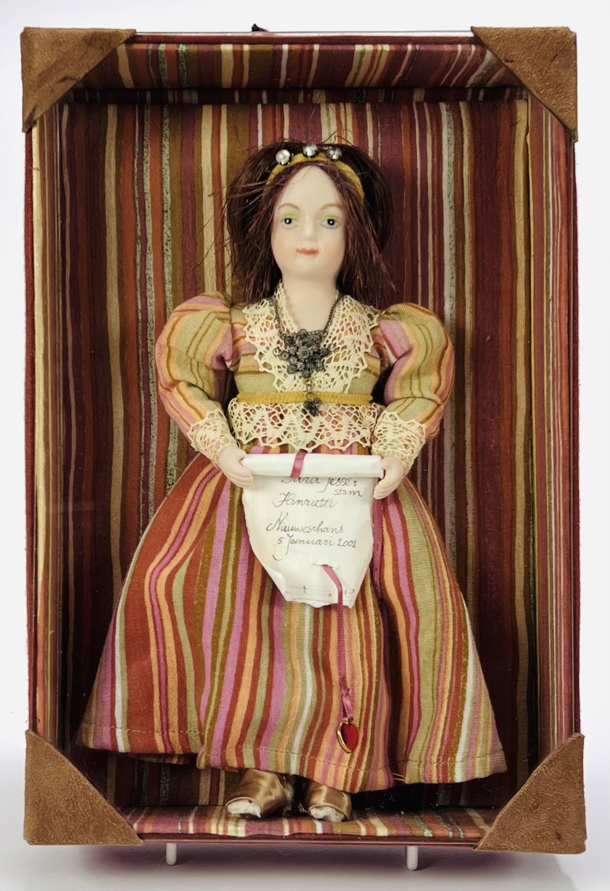 Pop in doos van Arts Sanders, begin 21e eeuw, vervaardigd uit textiel, porselein, glas en karton. Handgemaakt en beschilderd, gekleed in gestreepte historische jurk met kant en sierketting, voorzien van handgeschreven tekst "Sara Jesse’s Stam Henriëtte Nieuweschans 5 januari 2001". De pop wordt gepresenteerd in een met stof beklede doos met lederen hoekbeschermers. Direct deelnemen? Plaats vanaf 22 augustus alvast een schriftelijk bod via onze website! |