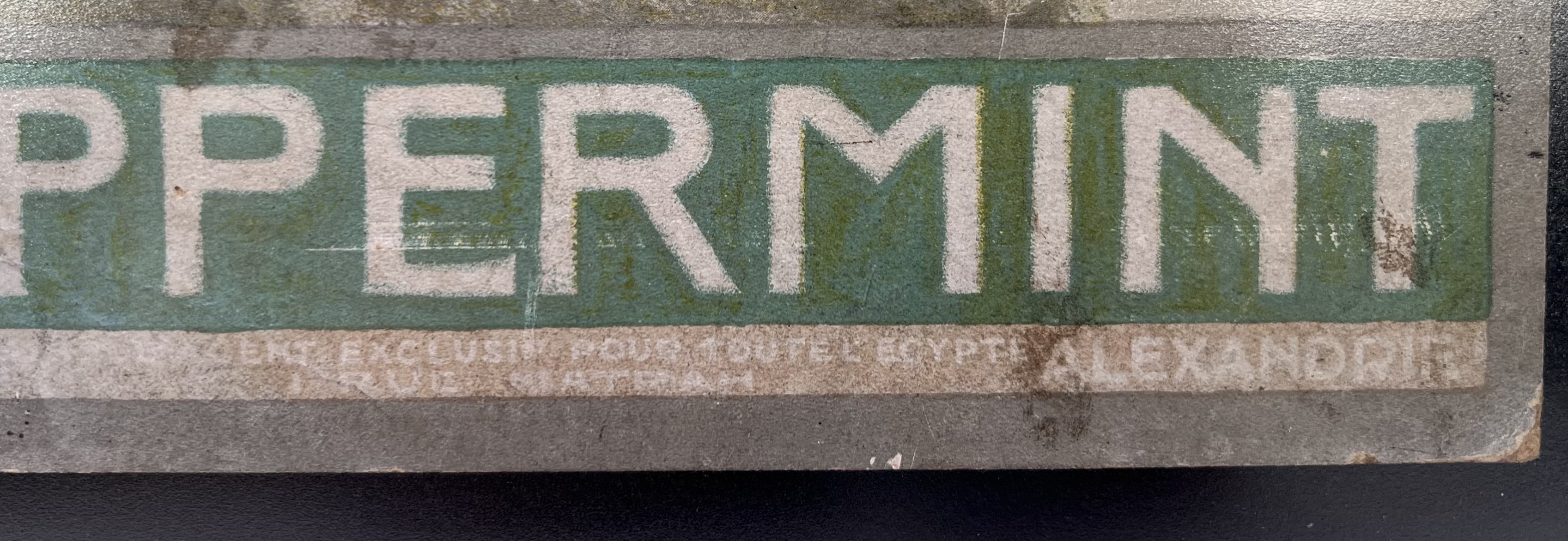 Affiche voor Vaal's Peppermint uit circa 1925, met groot portret van een piloot met bril en helm in groengele tinten. Vroeg voorbeeld van internationale reclamekunst in lithografie, geproduceerd voor export naar Egypte via Alexandrië. Registreer nu en bied eenvoudig online mee op dit affiche!! |
