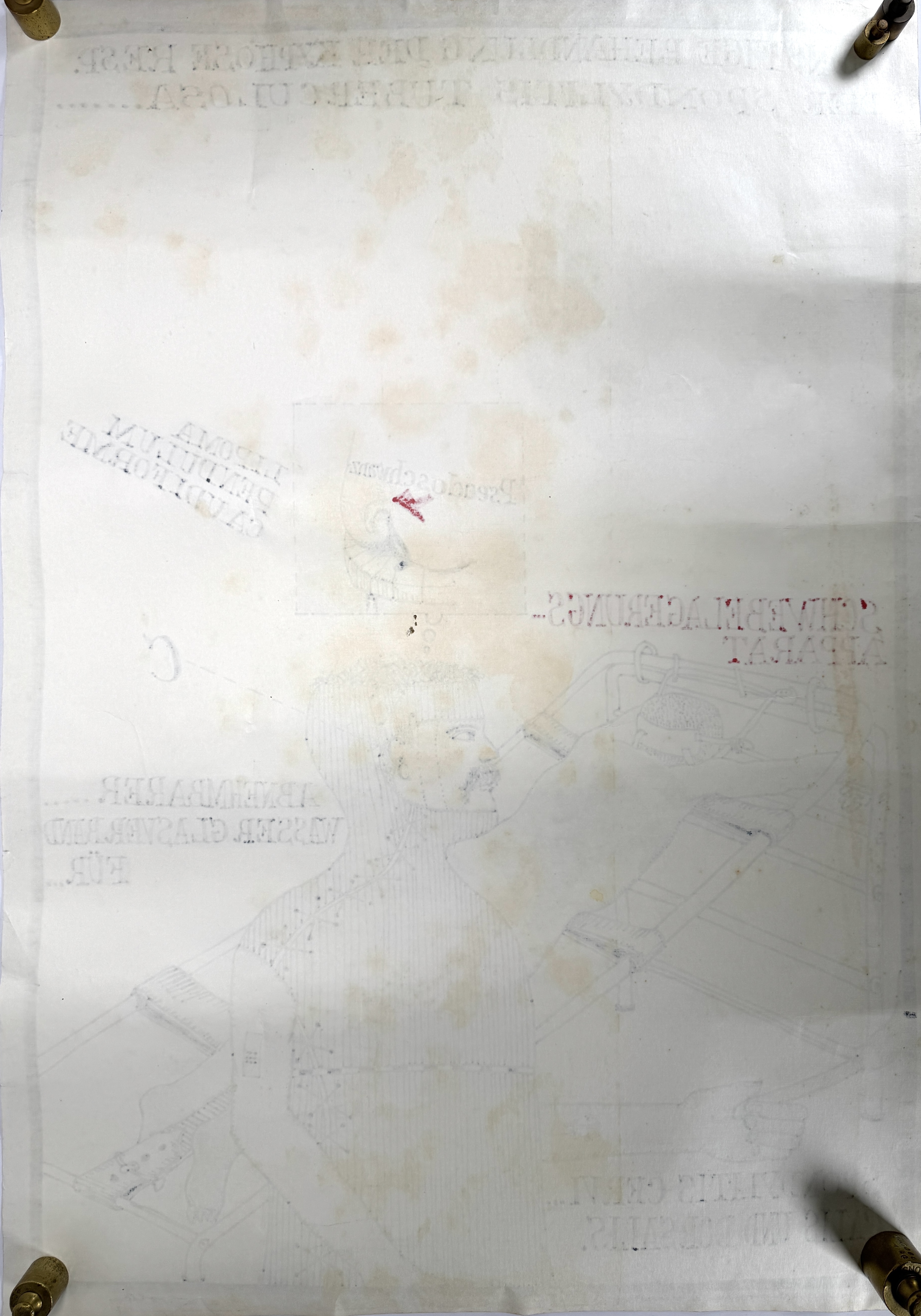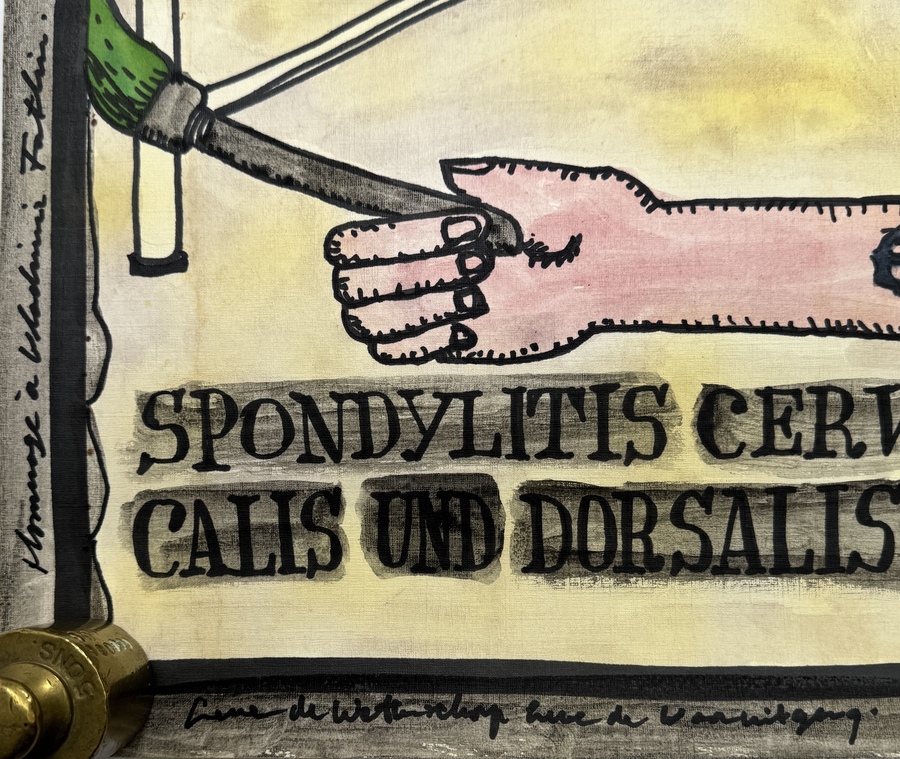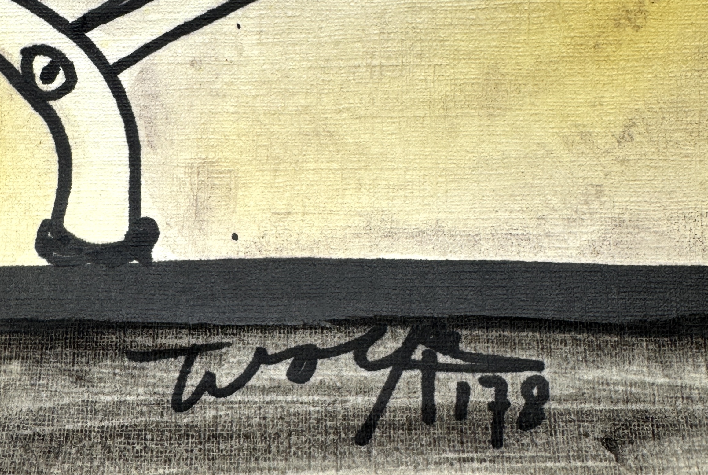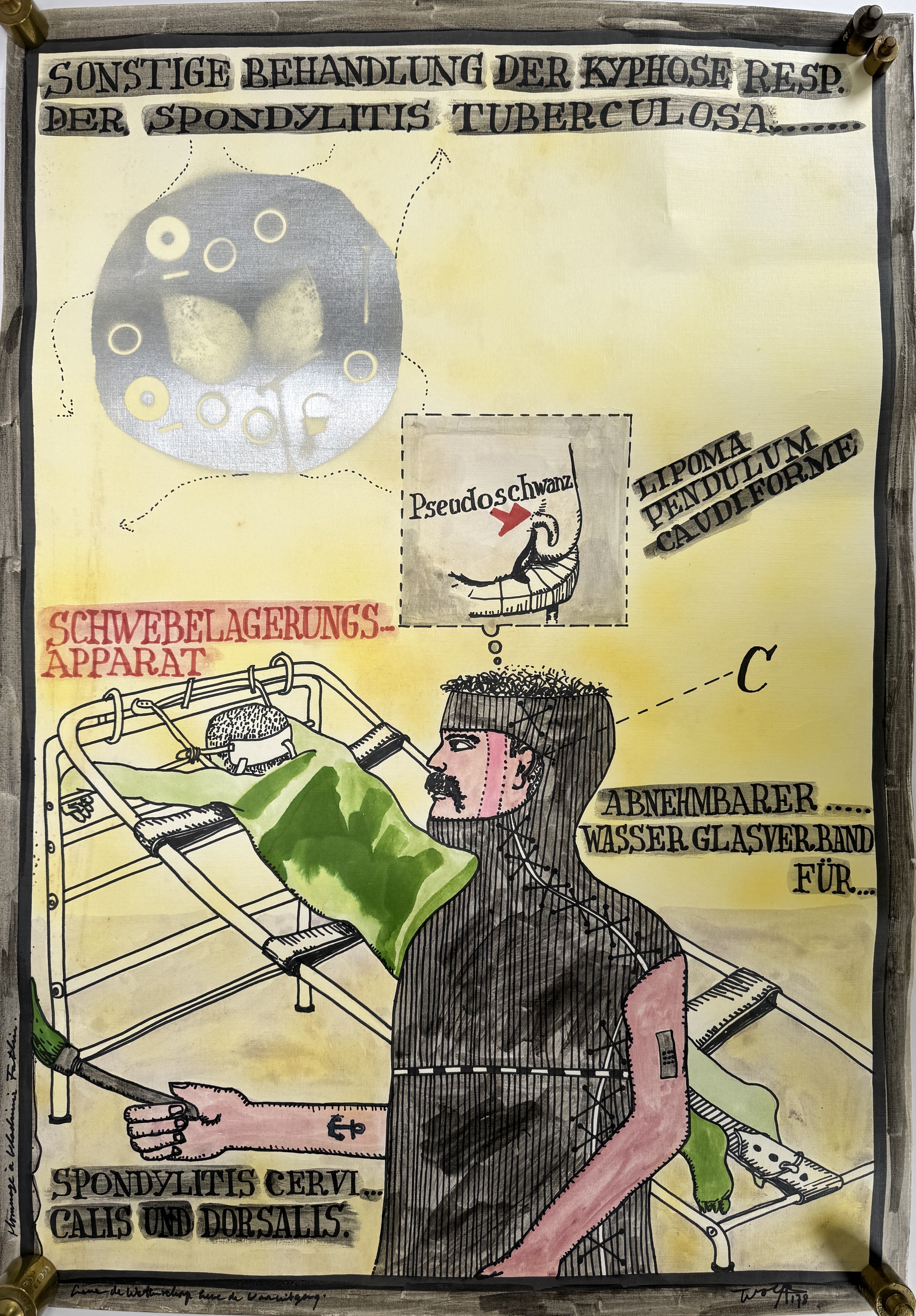 Werk op papier van Henri de Wolf (1938-1986), gemengde techniek met inkt, aquarel en collage-elementen, gedateerd 1978. Getiteld "Leve de wetenschap, leve de vooruitgang". Conceptuele compositie met medische en anatomische verwijzingen, begeleid door Duitse tekst. Met verwijzing naar Vladimir Tatlin. Rechtsonder gesigneerd en gedateerd Wolf '78. Interesse in dit stuk? Registreer en bied eenvoudig online mee! |