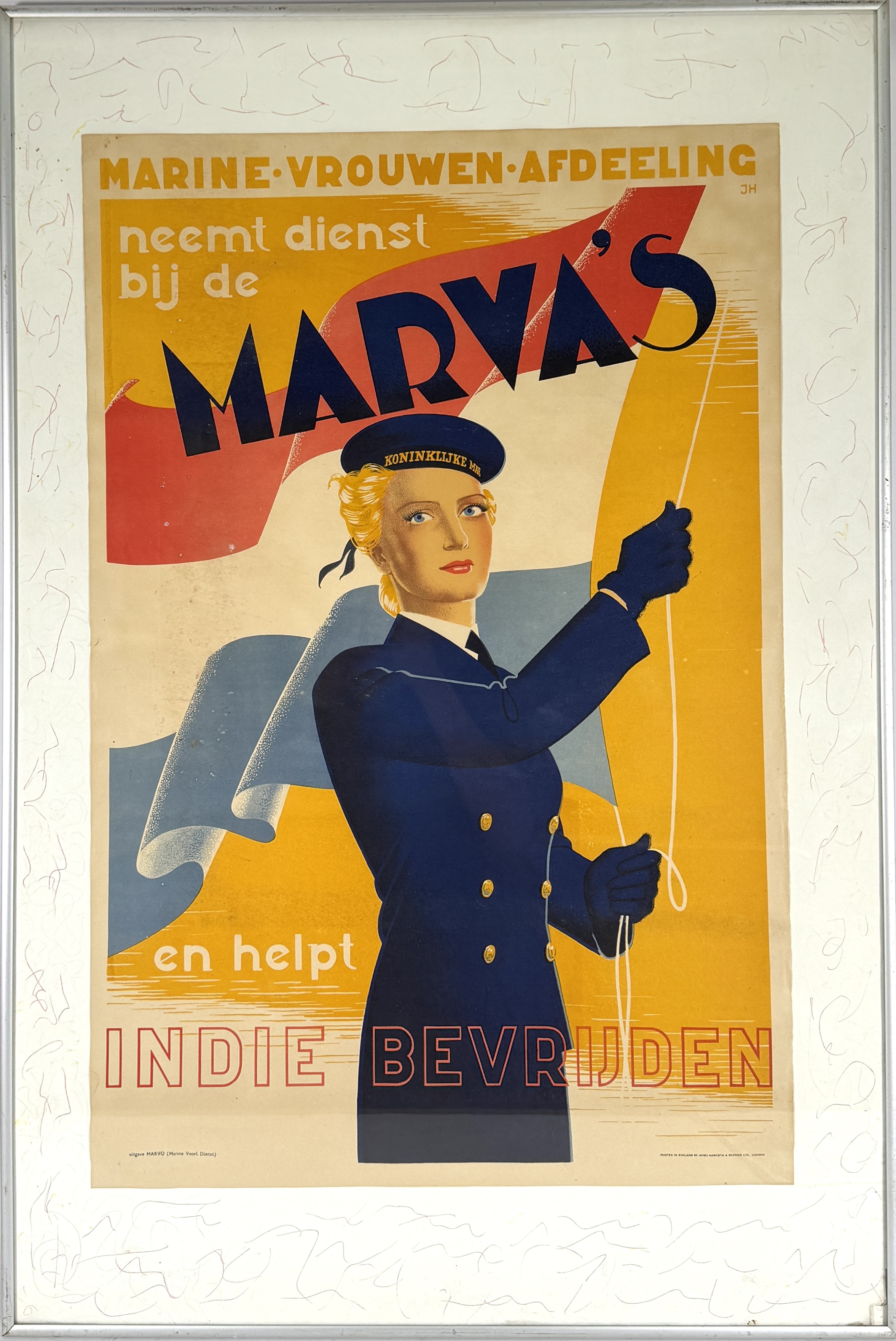 Wervingsposter voor de Marine-Vrouwen-Afdeling, omstreeks 1944–1945, gedrukt door James Haworth & Brother Ltd., London, in opdracht van MARVO (Marine Voorl. Dienst). Lithografische druk op papier, met krachtige grafische stijl en felle kleuren. Voorstelling van vrouw in marine-uniform voor Nederlandse vlag met opschrift “MARVA’s” en “helpt Indië bevrijden”. Kom kijken op 29, 30 of 31 augustus (11:00-17:00 uur) en ervaar het zelf! |