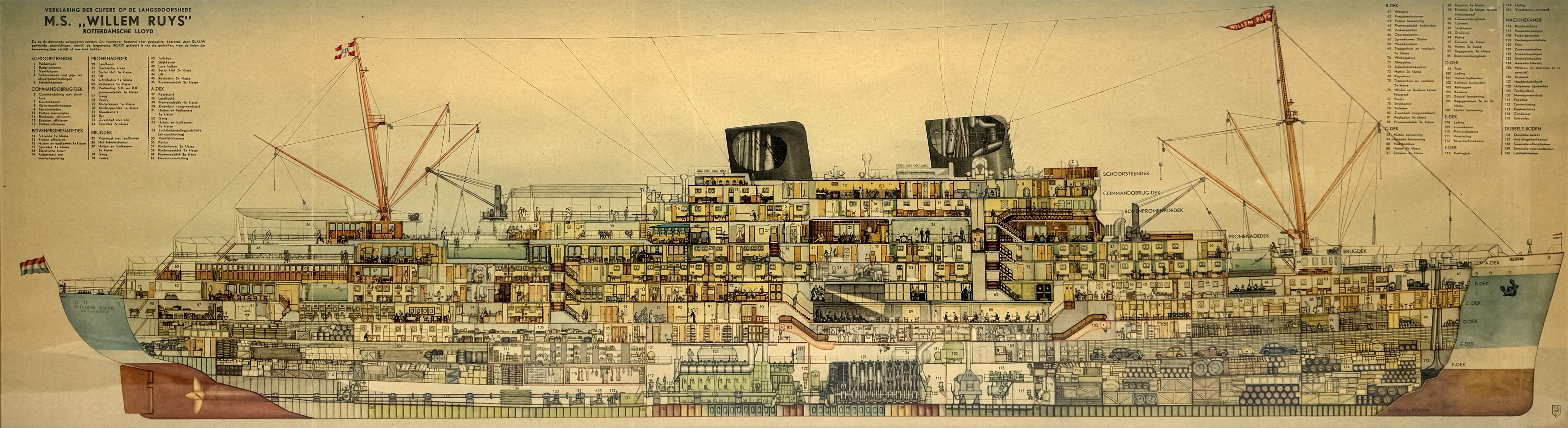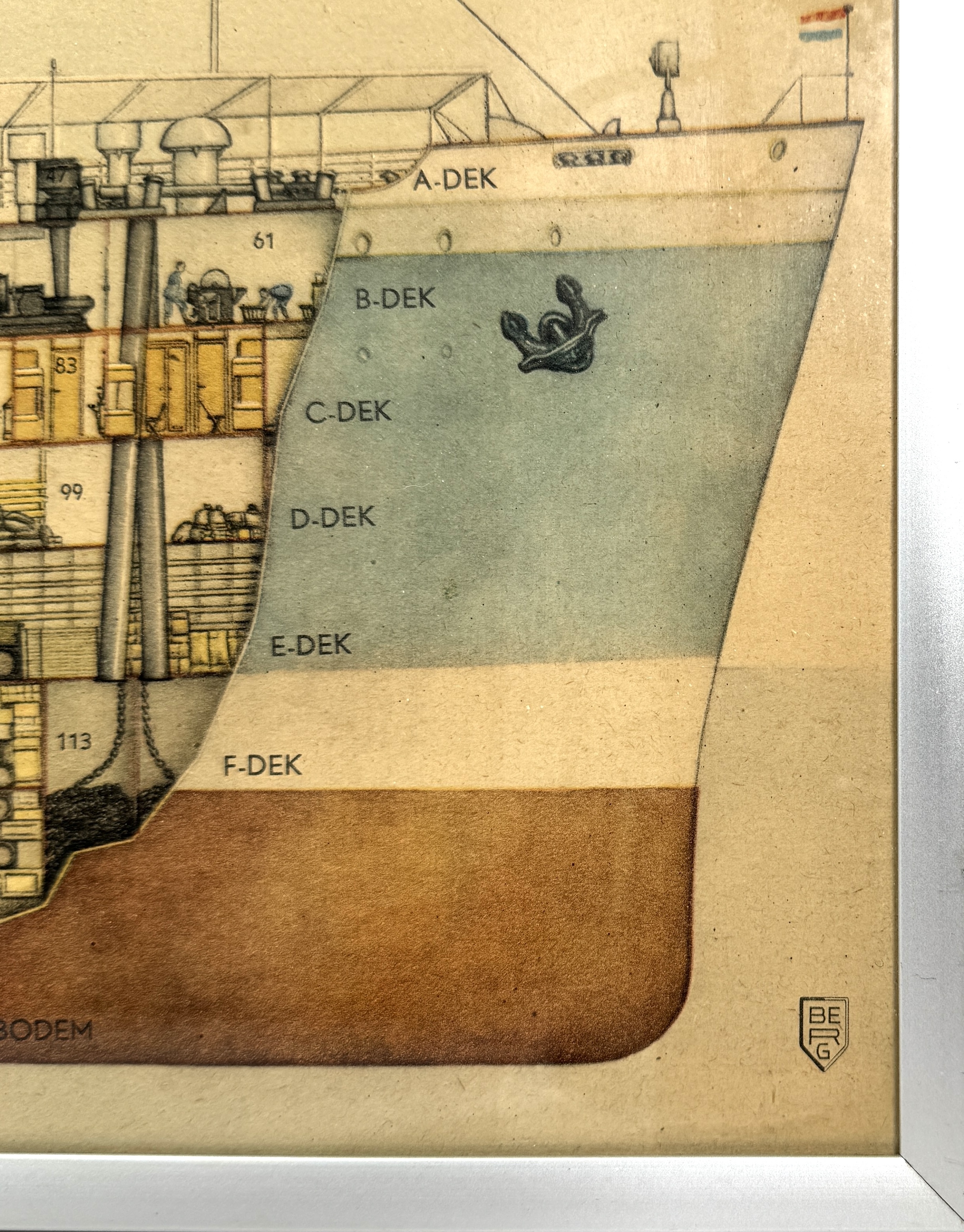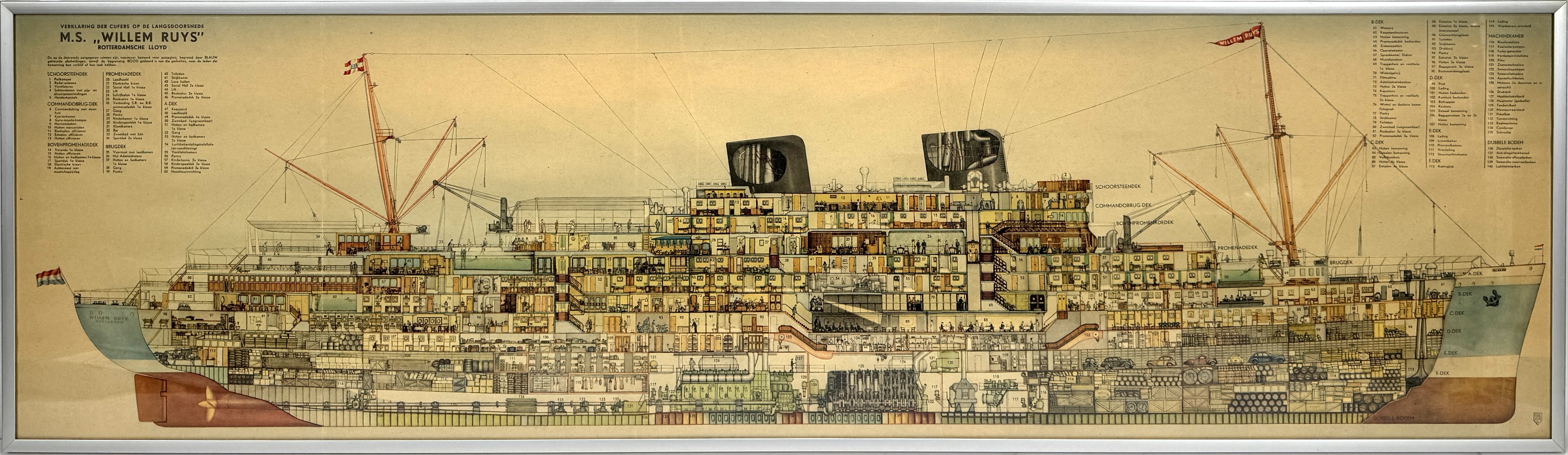 Technische langsnedetekening van het passagiersschip M.S. Willem Ruys van de Rotterdamsche Lloyd, uitgevoerd in kleurenlitho met dekken A t/m F en dubbele bodem, voorzien van genummerde onderdelen en legenda in het Nederlands. Rechtsonder in druk gesigneerd met monogram BE FG. Gevat in moderne zilverkleurige lijst achter glas, met gedetailleerde weergave van scheepsindeling en functies. Ontdek deze prent en voeg het toe aan jouw collectie! Registreer nu voor de veiling. |