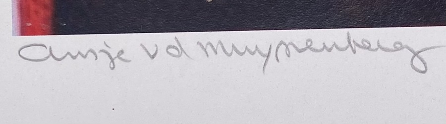 Een print van Anja van de Muynenberg uit 2014, uitgevoerd in een gemengde techniek van zeefdruk en monotype op papier. De stijl is abstract modern met een centraal, symmetrisch beeld in diepblauw en groen op een rode achtergrond. Het werk is links onder met potlood gesigneerd en rechtsonder gedateerd door de maker. Wil je deze print in het echt bekijken? Kom naar de kijkdagen op 29, 30 en 31 augustus! |