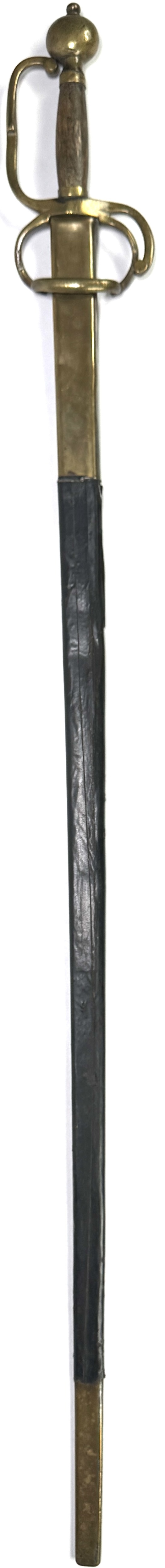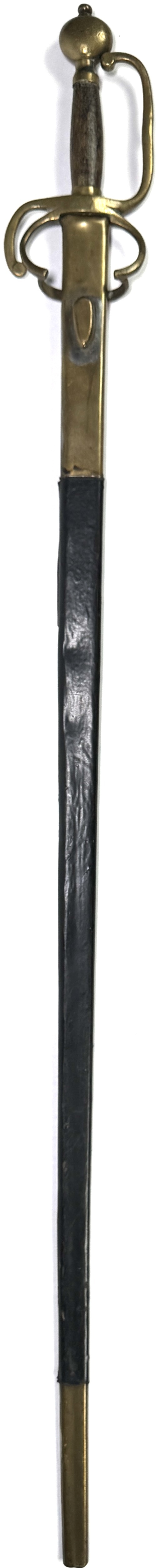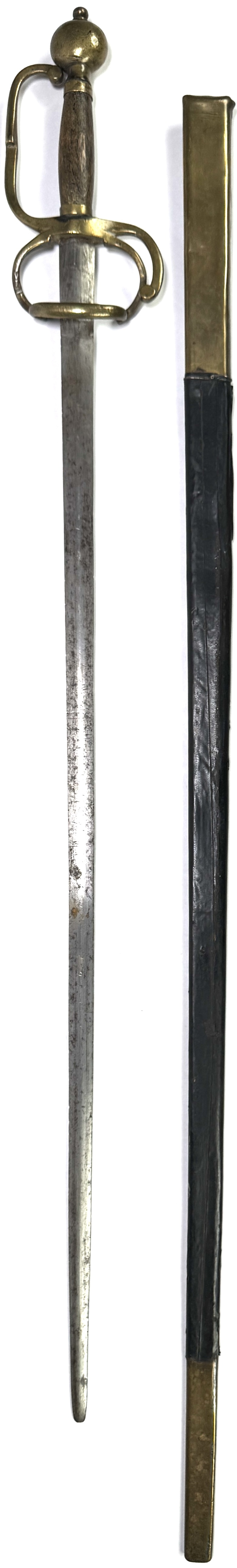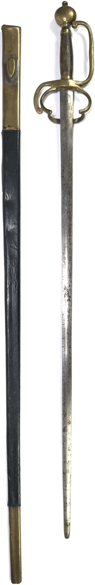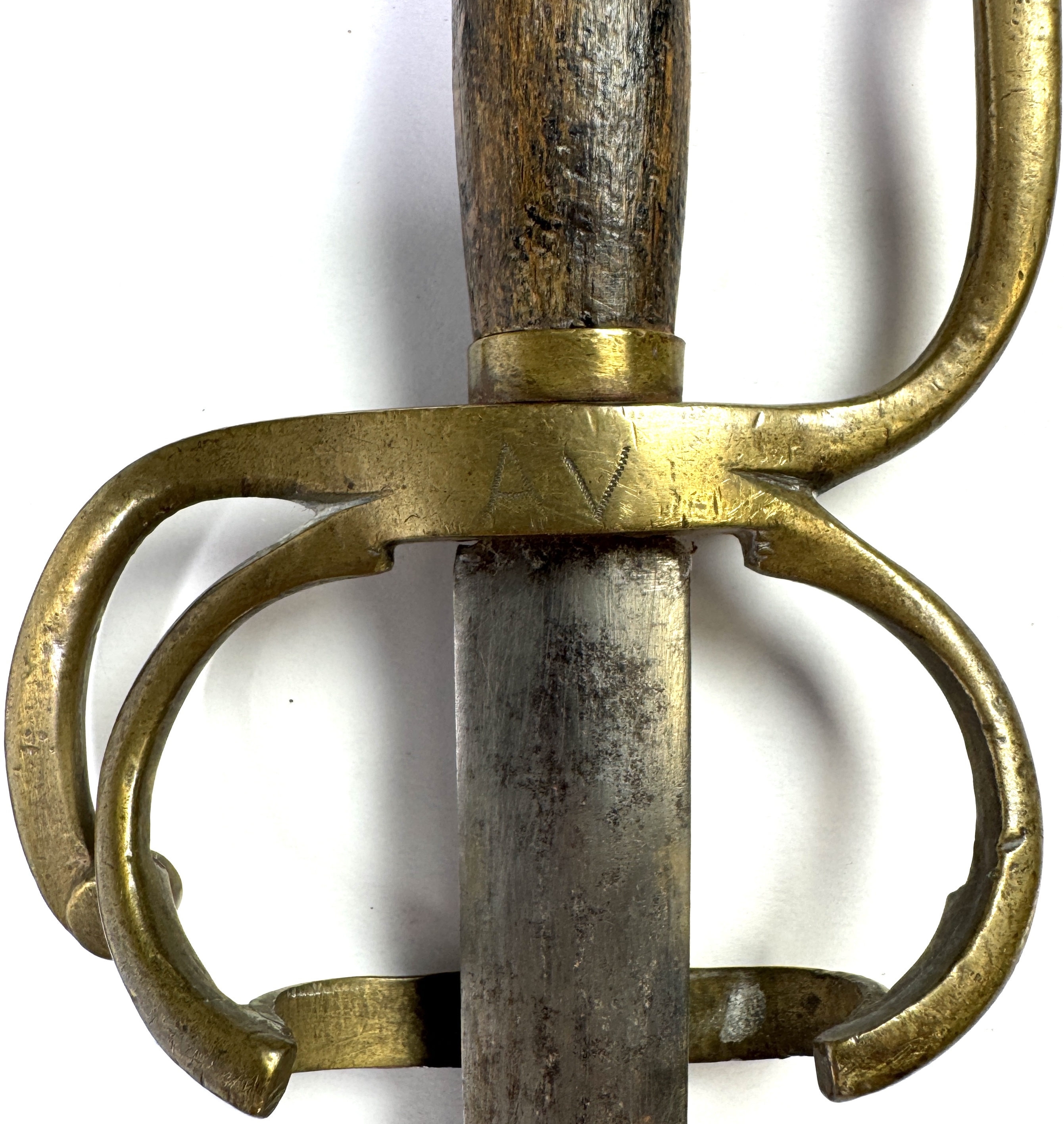 19e-eeuws Europees zwaard met ijzeren lemmet, messing gevest en houten handvat, voorzien van leren schede met messing beslag. Gegraveerde initialen “A.V.” op het gevest. Omstreeks 1850–1900. Geïnteresseerd? Bezoek onze kijkdagen voor een persoonlijke bezichtiging! |