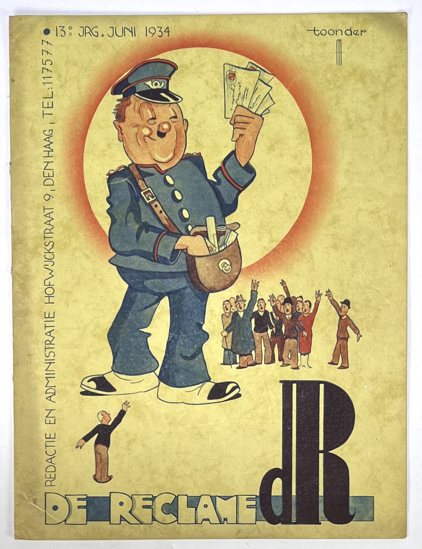 Origineel Nederlands reclameblad De Reclame, 13e jaargang, juni 1934, gedrukt op papier en ontworpen door Studio Toonder. Illustratief ontwerp in modernistische stijl met postbode, man in stoel en reclameboodschappen, typerend voor de commerciële grafiek uit de jaren dertig. Geïnteresseerd? Bezoek onze kijkdagen voor een persoonlijke bezichtiging! |
