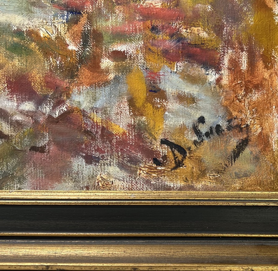 Schilderij in laat-impressionistische stijl door Erasmus Bernhard van Dulmen Krumpelman (1897–1987), boslandschap met wandelaar. Rechtsonder gesigneerd, datering omstreeks midden 20e eeuw. Uitgevoerd in olieverf op doek, gespannen op kruisregels spieraam en geplaatst in goudgekleurde houten lijst. Warme herfsttinten, contrasterende witte boomstammen en expressieve penseelvoering kenmerken het werk. Wil je direct deelnemen? Plaats vanaf 22 augustus alvast een schriftelijk bod via onze website! |
