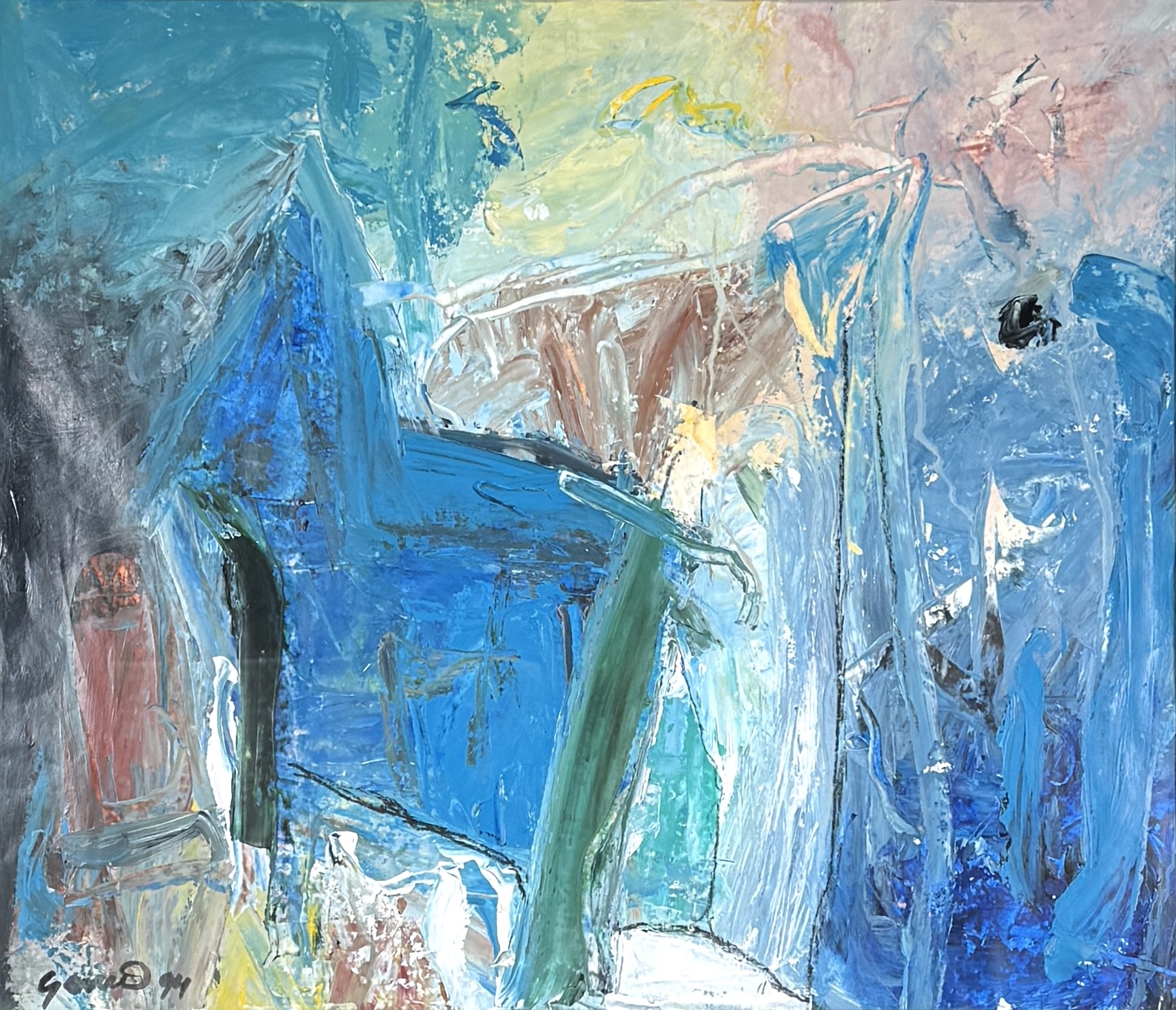 Schilderij, uitgevoerd in acryl op doek, abstract-expressionisme van Gerriet Postma (1932–2009). Het werk uit 1994 is gekenmerkt door een gelaagde verfstructuur met dikke, pasteuze penseelstreken in voornamelijk blauw- en wittinten. Het schilderij is linksonder in zwarte verf gesigneerd en gedateerd met G. Postma 94. Wilt u het werk in het echt bekijken? Kom naar de kijkdagen op 29, 30 en 31 augustus! |