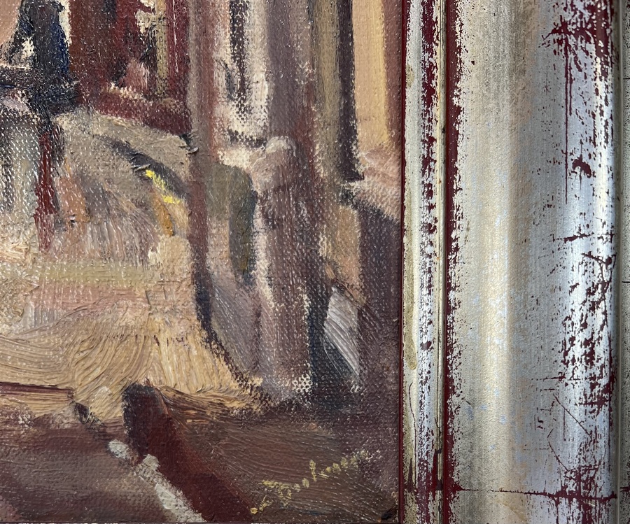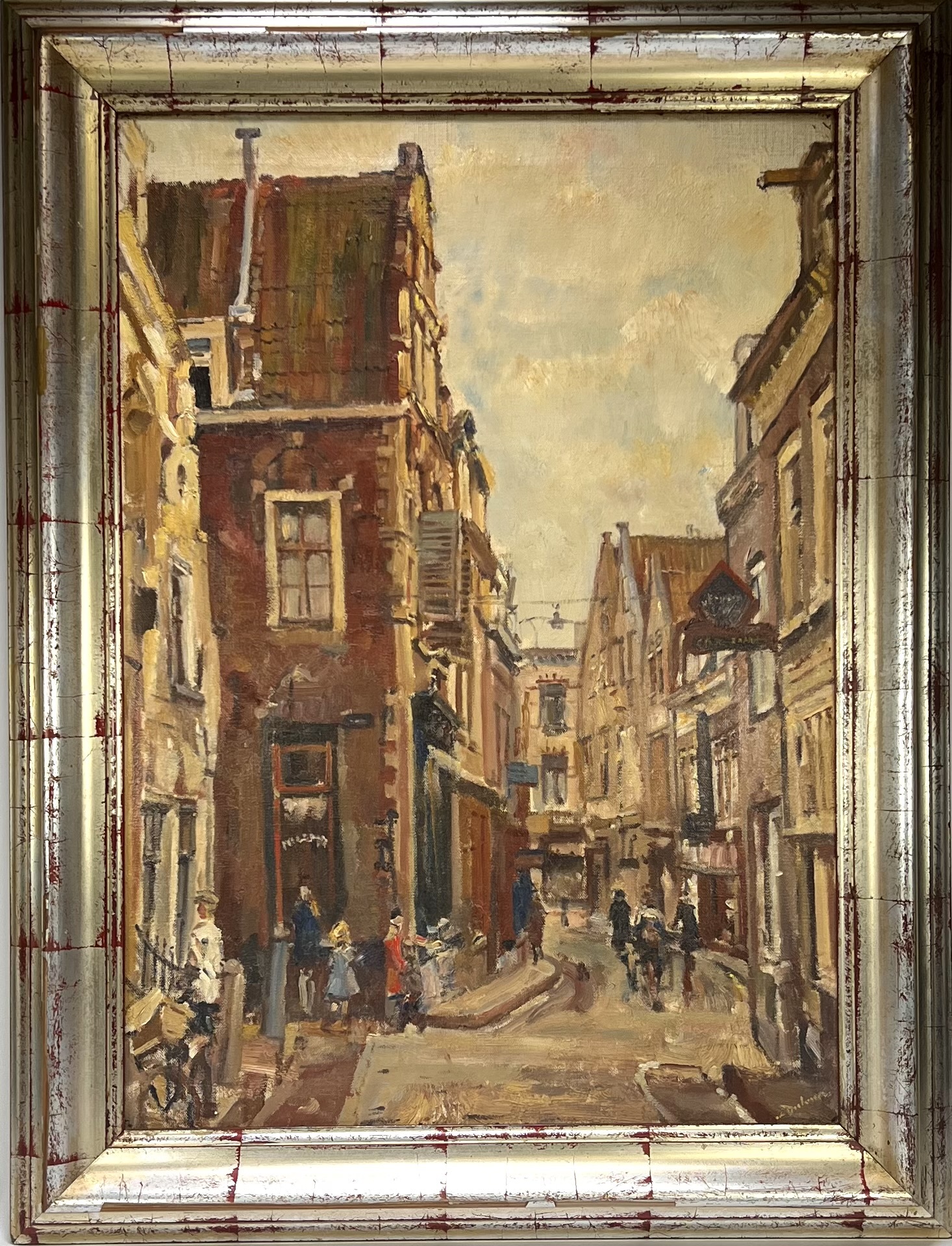 Olieverfschilderij van Erasmus Bernhard van Dulmen Krumpelman (1897–1987), circa midden 20e eeuw. Impressionistisch-realistisch stadsgezicht met hoge gevels, smalle straat en figuren in beweging. Olieverf op doek, met losse penseelvoering en dynamisch kleurgebruik, rechtsonder gesigneerd. Een karakteristiek werk binnen zijn oeuvre. Ontdek dit werk tijdens onze kijkdagen op 29, 30 en 31 augustus van 11:00 tot 17:00 uur. |