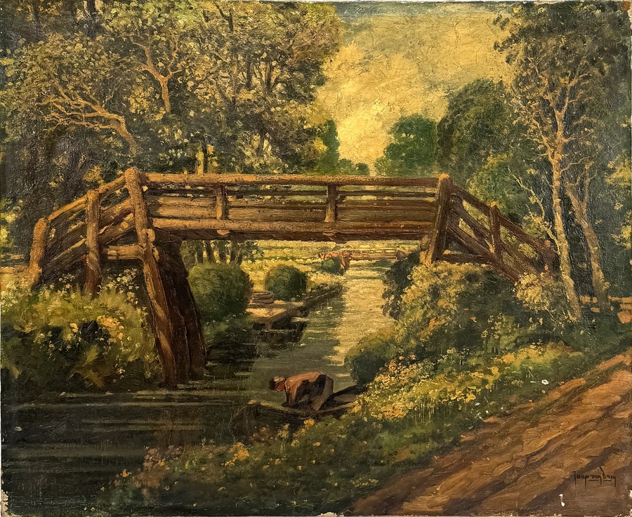Olieverfschilderij Jaap van Dam, landschap met loopbrug, begin 20e eeuw