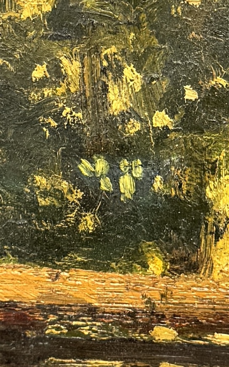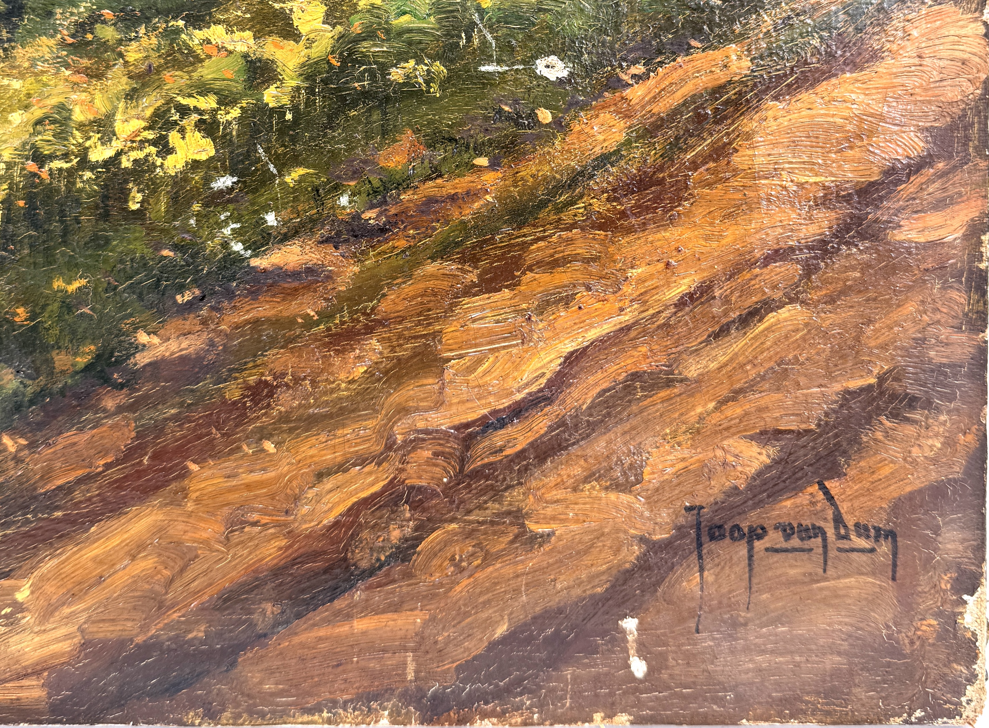 Schilderij van Jaap van Dam (1876-1972), uitgevoerd in olieverf op doek, toont een impressionistisch landschap met een houten loopbrug over een beek. De losse penseelvoering en dikke verflagen zijn kenmerkend voor de stijl, de kleuren zijn helder en licht. Het schilderij is rechtsonder gesigneerd, begin 20e eeuw. Eerst dit schilderij zien voordat je biedt? Bezoek onze kijkdagen op 29, 30 en 31 augustus van 11:00 tot 17:00 uur! |