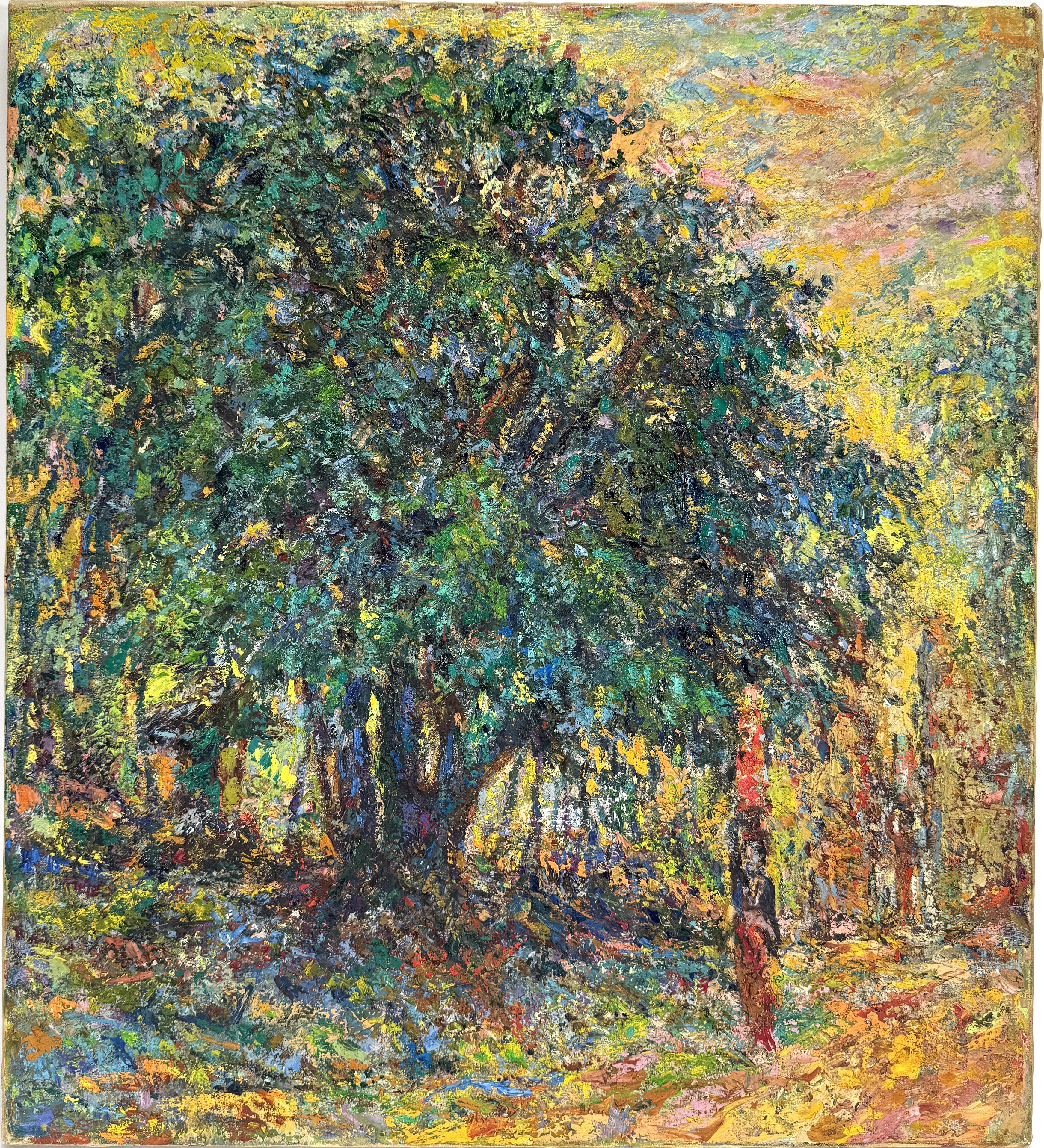 Schilderij uitgevoerd in olieverf op doek in een impressionistische stijl. Centraal een boomrijke bosomgeving met staande vrouwelijke figuren rechts, weergegeven met levendige kleurcontrasten en losse toets. Het doek toont een rijk geschakeerd landschap met nadruk op lichtval en vegetatie. Datering onbekend, stijl en techniek wijzen op eind 19e eeuw. Interesse in dit stuk? Registreer en bied eenvoudig online mee! |