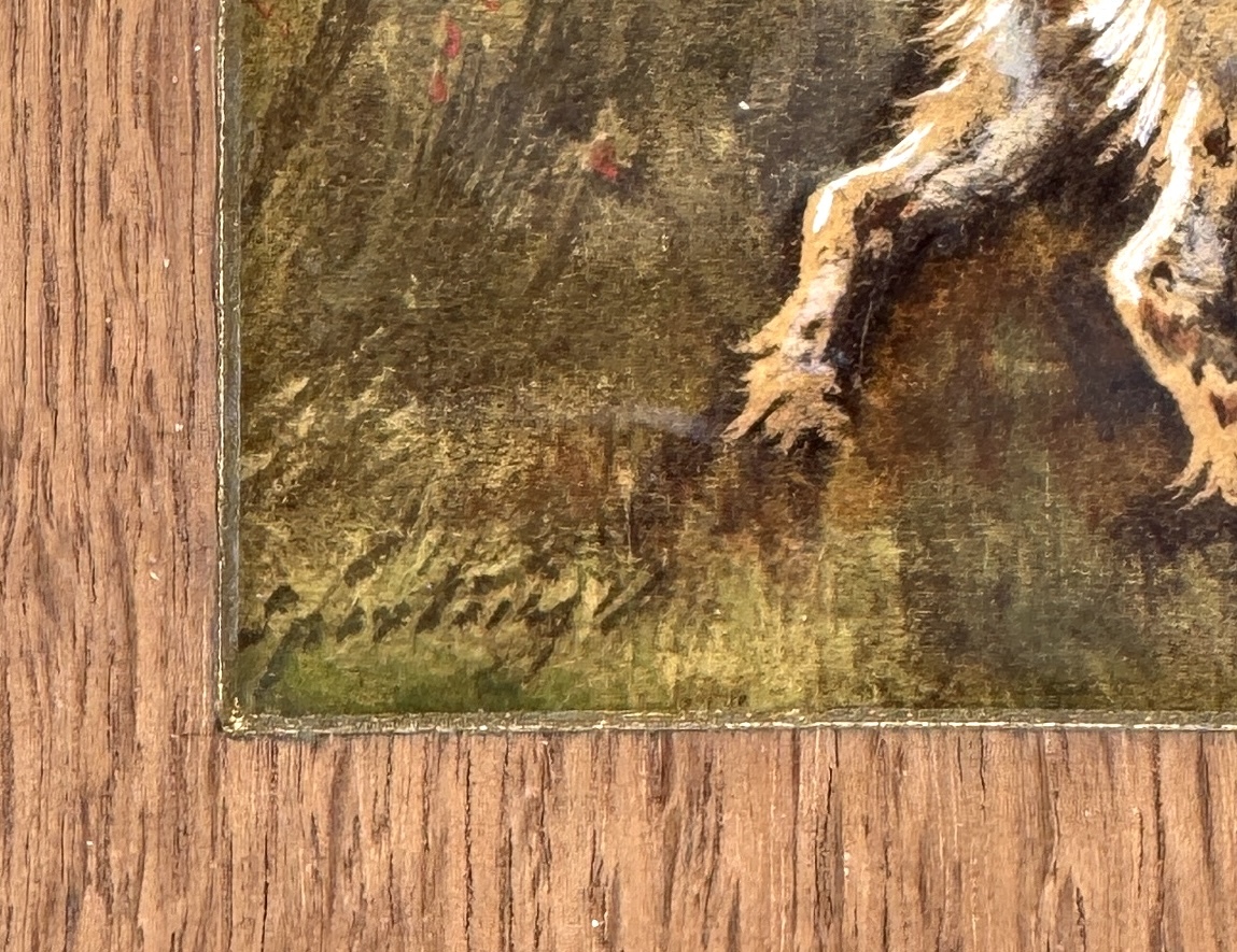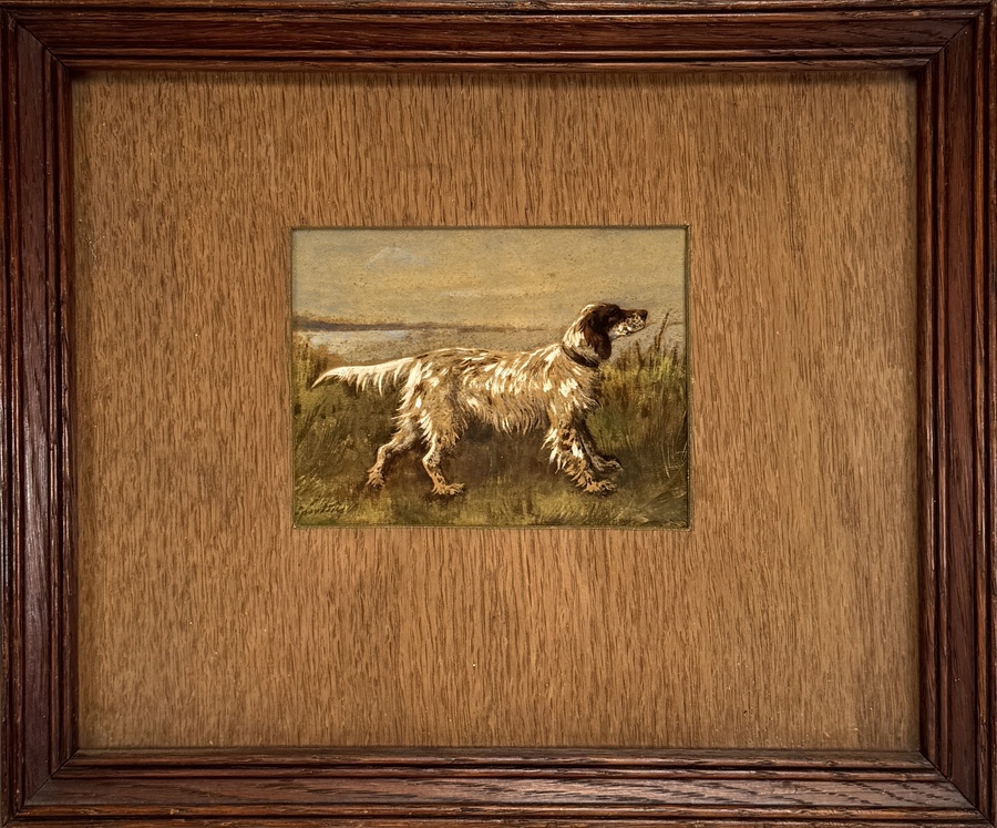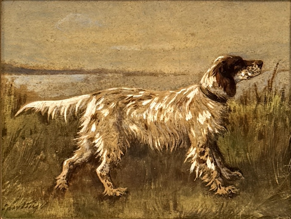 Olieverfschilderij, onduidelijk gesigneerd linksonder, datering eind 19e tot begin 20e eeuw, uitgevoerd op paneel. Het werk toont een staande jachthond in een open graslandschap met subtiele achtergrond. Fijne penseelvoering benadrukt de vacht en lichaamshouding. Herkomstlabel van kunsthandel Goudeket & Co. Amsterdam aanwezig. Wilt u bieden? Schrijf u in en doe mee aan de veiling! |