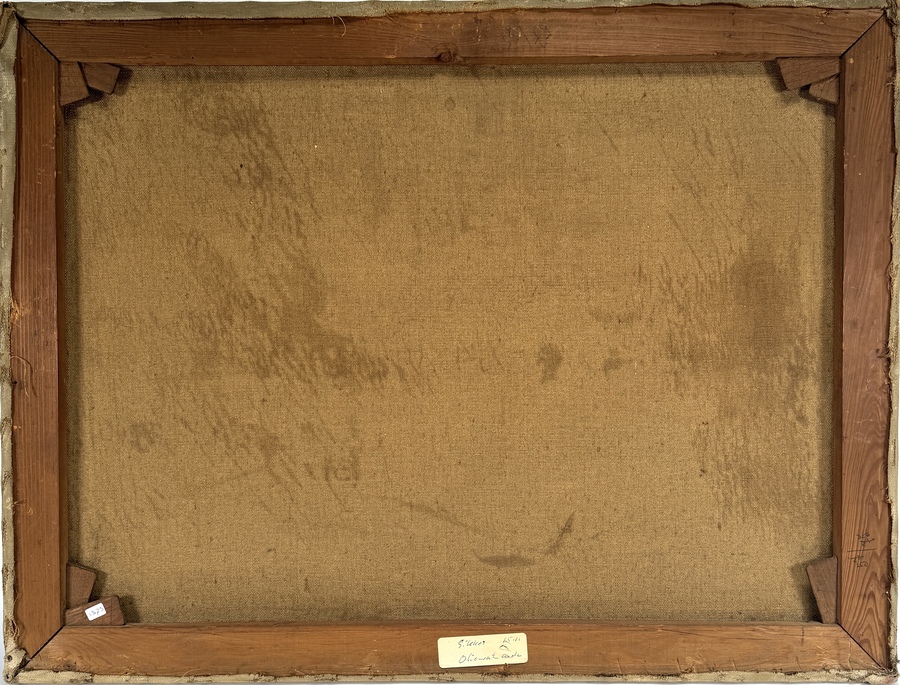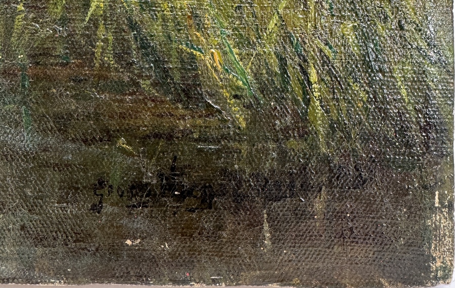 Schilderij, omstreeks begin 20e eeuw. Olieverf op doek in realistische stijl. Afgebeeld is een watermolen aan een beek omgeven door bomen, een boer met emmer en eenden. Zorgvuldig uitgewerkt in fijne penseeltechniek. Het werk is onduidelijk gesigneerd linksonder. Deze voorstelling vangt een idyllisch landelijk tafereel met oog voor natuurlijke details. Wil je het schilderij in het echt bekijken? Kom naar de kijkdagen op 29, 30 en 31 augustus! |