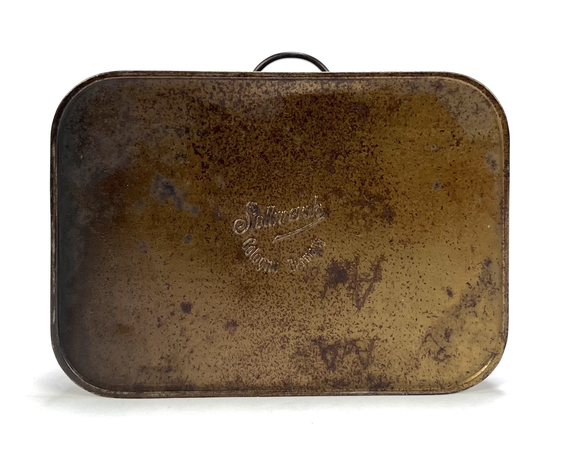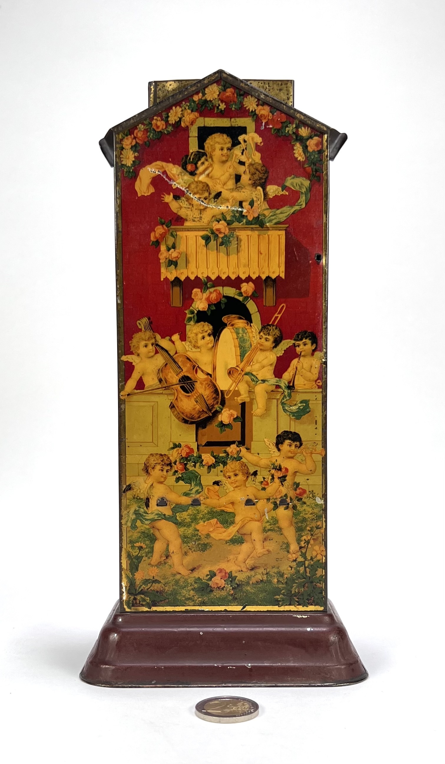 Blikken spaarautomaat van Stollwerck, ca. 1900-1910, uitgevoerd in lithografisch bedrukt en gelakt blik. Voorzien van cherubijnen en decoratieve scènes, met vakken voor chocolade en bonbons. Dient zowel als spaarpot als snoepautomaat. Illustratief voorbeeld van functioneel reclamemateriaal, verspreid in winkels en openbare ruimtes in Europa. Geïnteresseerd? Bezoek onze kijkdagen voor een persoonlijke bezichtiging! |