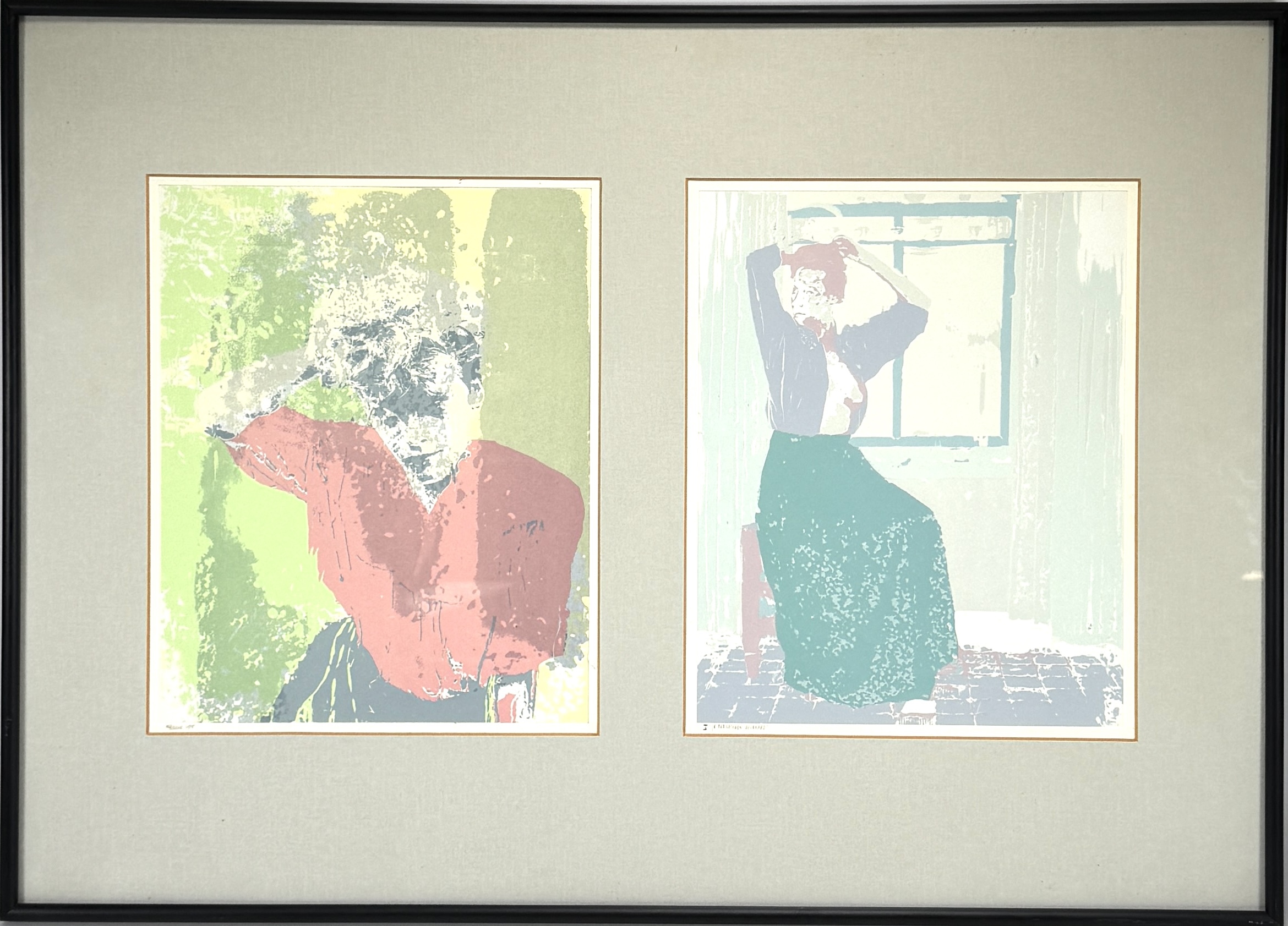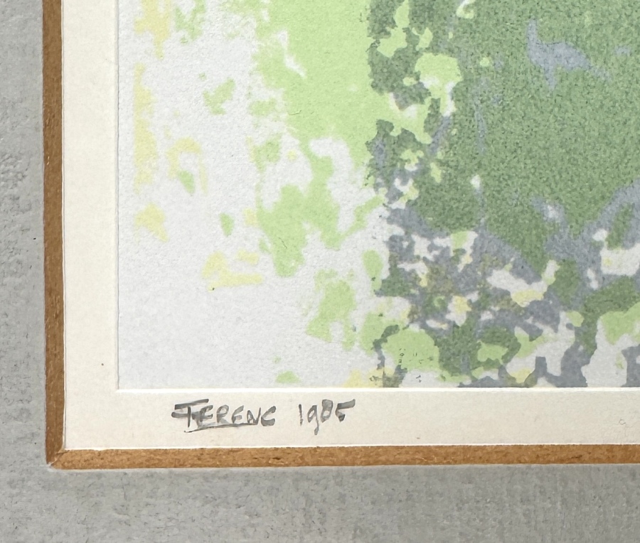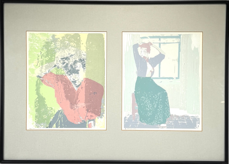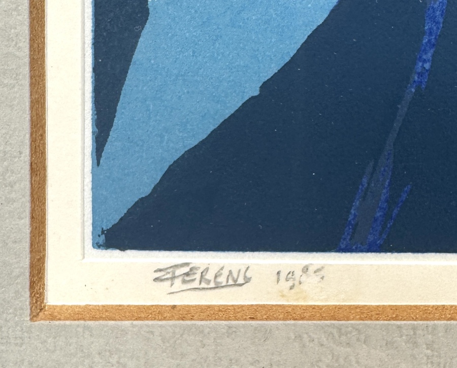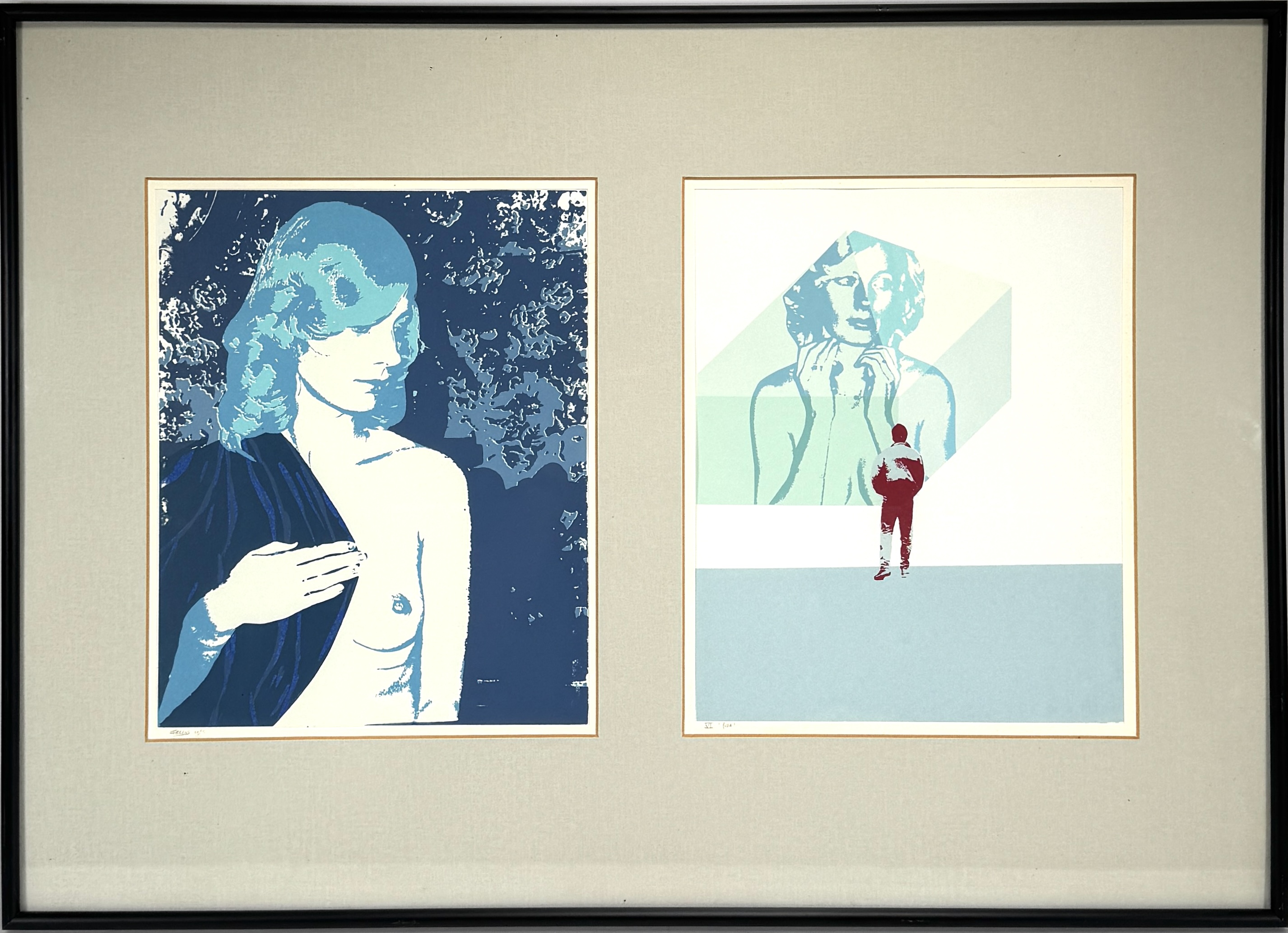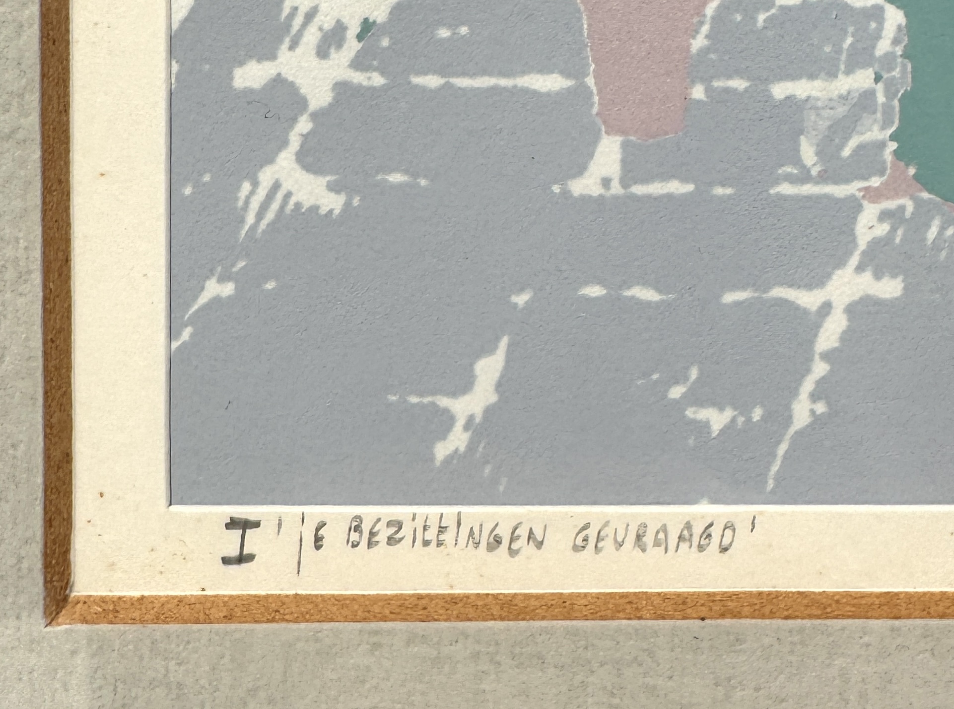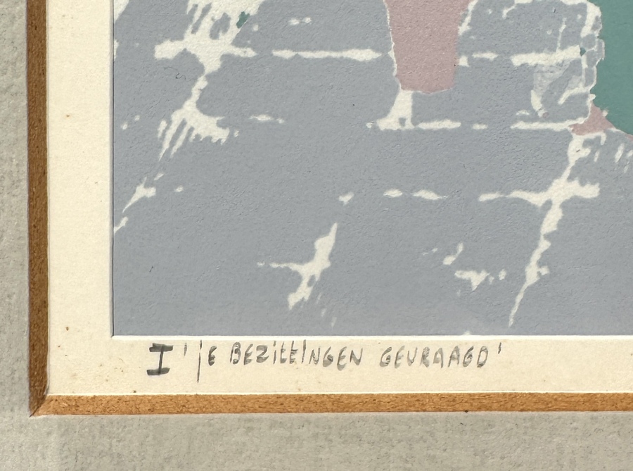 Naar aanleiding van gedichten van Ferenc van Damme heeft de graficus Wim Bors tien prenten/zeefdrukken gemaakt, samengebracht onder de titel “Spiegeldans”. Een oplage van 100 genummerde exemplaren, waarvan dit nr. 17 is. Inclusief vier ingelijste werken waarvan twee linksonder gesigneerd en gedateerd ‘Ferenc, 1985’ en twee linksonder genummerd en getiteld, I ‘je bezittingen gevraagd’ en VI ‘Fuga’. Geïnteresseerd? Bezoek onze kijkdagen voor een persoonlijke bezichtiging! |