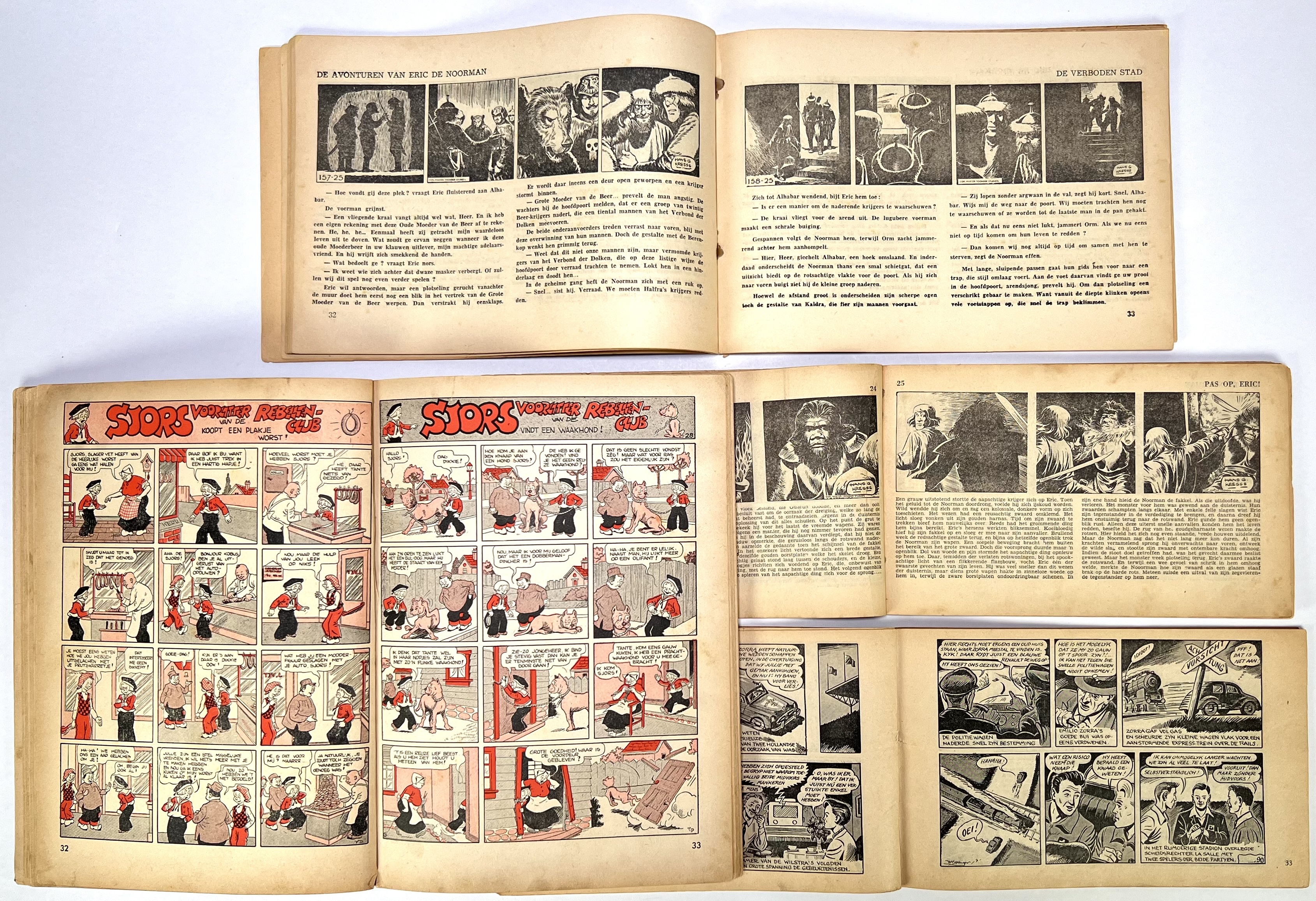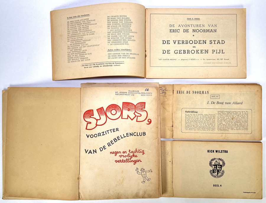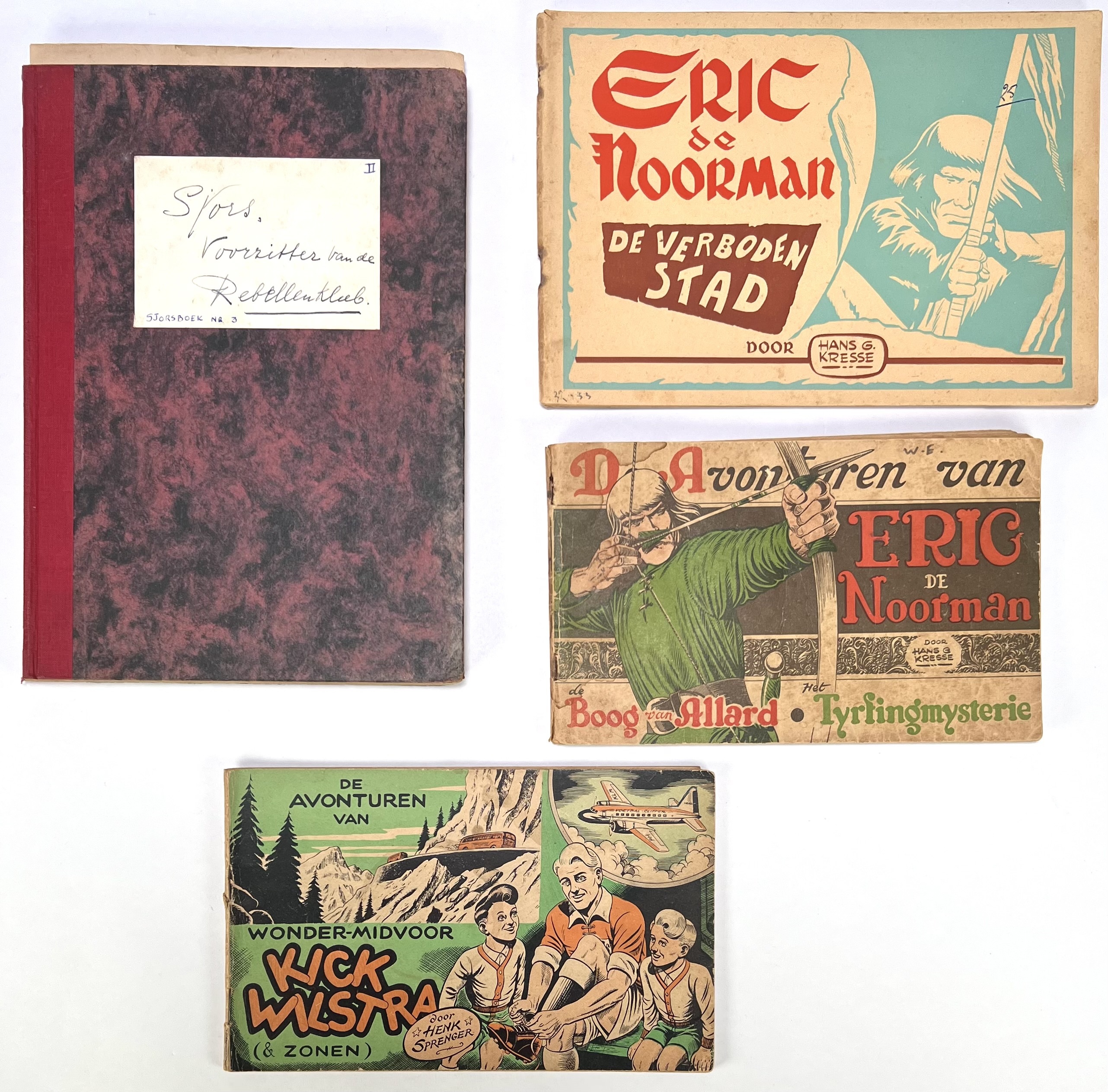 Collectie strip- en jeugdpublicaties uit omstreeks 1948–1955, met werk van Hans G. Kresse (1921–1992) en Henk Sprenger (1919–2005). Gedrukt op papier met offsettechniek. Bevat titels als “Eric de Noorman” en “Kick Wilstra”. Omslagen in tweekleurendruk, binnenwerken in zwart-wit. Typisch voor Nederlandstalige beeldverhalen uit de vroege naoorlogse periode. Eén bundel bevat handschrift op de omslag. Kom langs tijdens de kijkdagen (29 t/m 31 augustus) en ontdek deze strips zelf! |